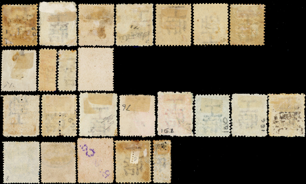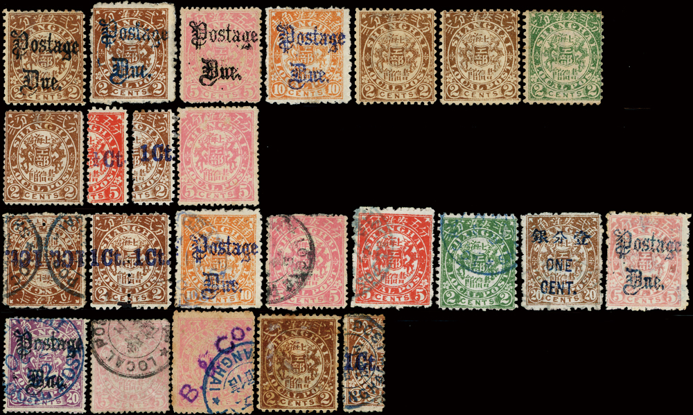 上海工部雙龍及其加蓋改值票一組共24枚,含新票11枚,舊票13枚,新票包括有:第一次版棕色無水印2分1枚(背揭薄).玫紅5分1枚,棕色有水印2分2枚,第二次版綠色有水印2分1枚,欠資2分2枚.5分1枚.1角1枚,機蓋藍色半分.1分半枚票各1枚等,品像混合或有重複,部分背貼,F-VF;歡迎至官網瀏覽全貌(Page 12)