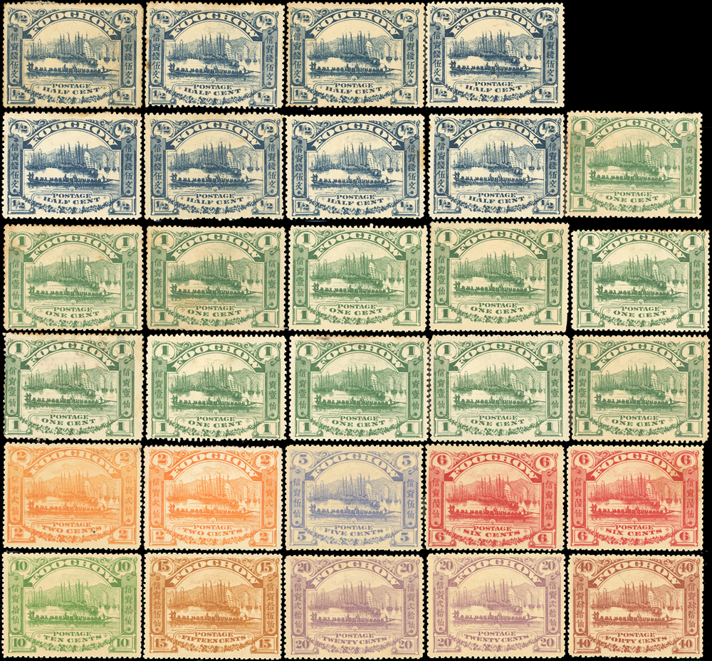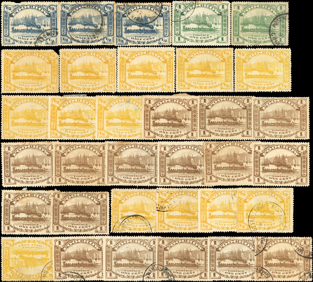 1895年福州書信館郵票一組共62枚,含新票48枚,舊票14枚,包括:第一次版新票5文~40仙(可配成1套),第二次版2全新票8套.舊票5套等,品像混合或有重複,部分背貼或無膠,F-VF;歡迎至官網瀏覽全貌(Page 13)