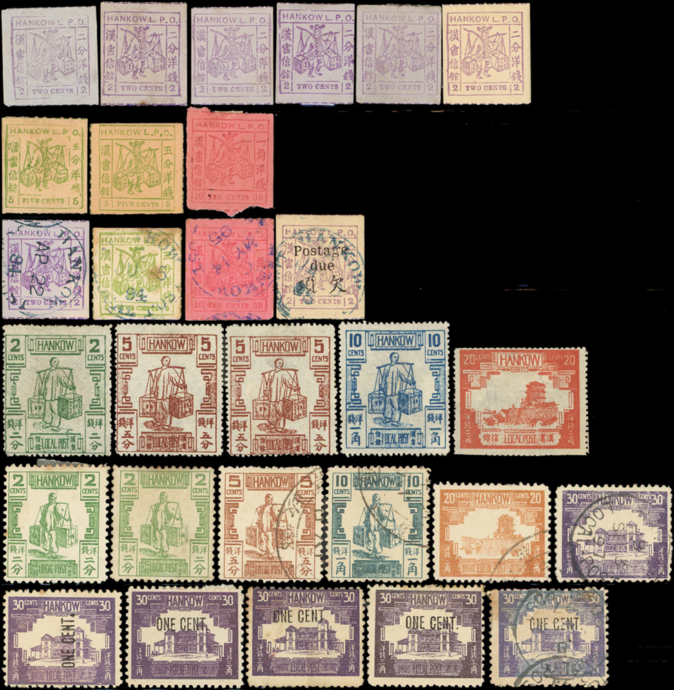 1893~1896年漢口書信館郵票一組共29枚,含新票20枚,舊票9枚,包括:第一次版新票2分~1角(可配成1套),第四次版新票2分~2角,第五次版新票2分,第二次加蓋改值ONECENT直蓋.橫蓋等,品像混合或有重複,部分背貼,F-VF;歡迎至官網瀏覽全貌(Page 13)