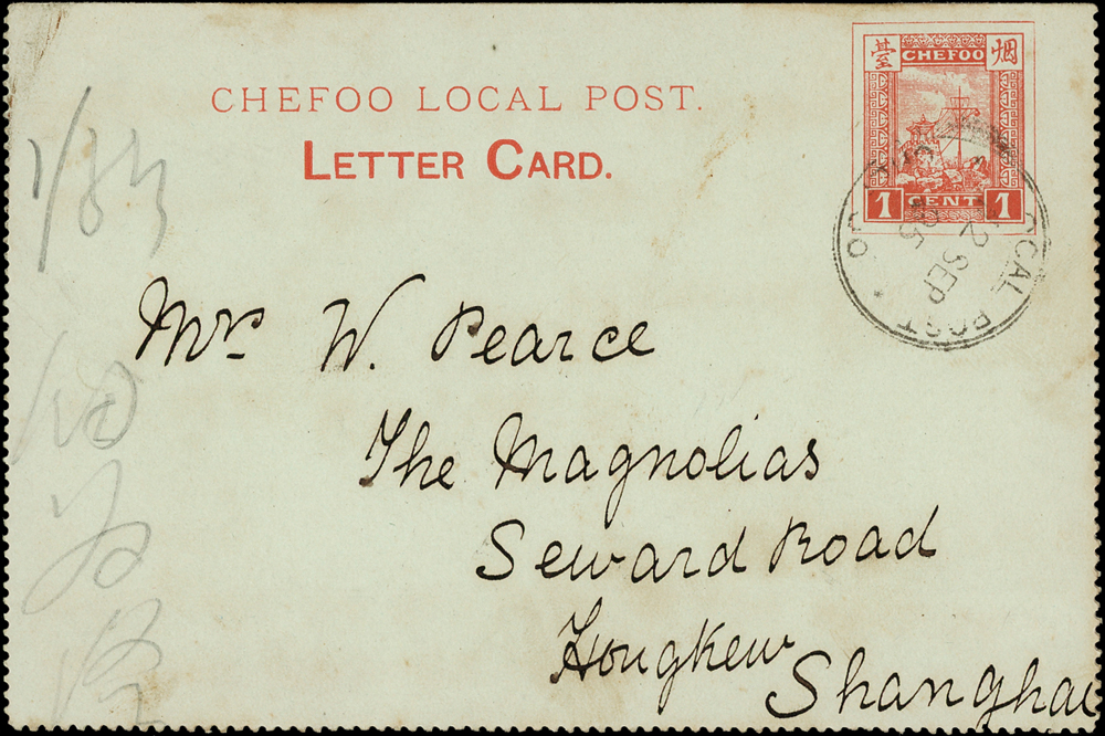 各地書信館封.片:(1)烟臺書信館半分郵資片1片,新;(2)烟臺書信館1分信卡,銷煙台1895.SEP.12工部戳,寄上海,封背上方沾黏紙;(3)1895年上海工部書信館市徽圖銀壹分郵資封,新(Page 12)