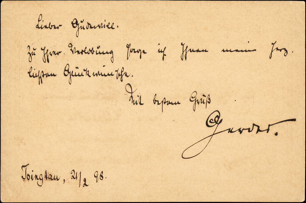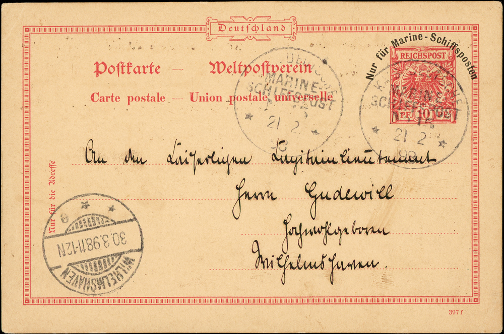 德國10芬尼郵資片,由停靠在膠州灣的德國海軍第三營SMS Kaiser Augusta軍艦寄出,銷21.2.98/No.15德國軍郵戳,德國WILHELMSHAVEN 30.3.98到戳 源流:郵史研究第28期『膠州郵史續探』第15頁原件,2011.3海峽兩岸郵史研究會出版(Page 14)