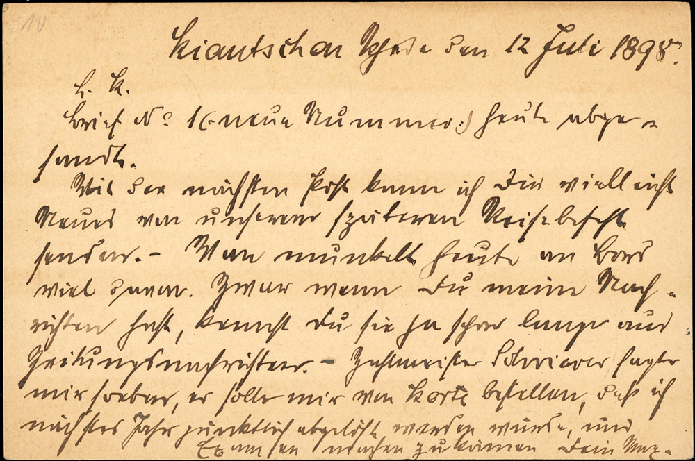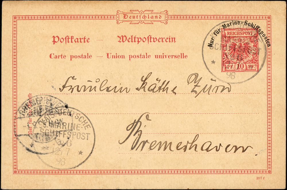 德國10芬尼郵資片,由停靠在膠州灣的德國海軍SMS Arcona軍艦寄出,銷12.7.98/No.6德國軍郵戳,德國9.1.98到戳 源流:郵史研究第28期『膠州郵史續探』第16頁原件,2011.4海峽兩岸郵史研究會出版(Page 14)
