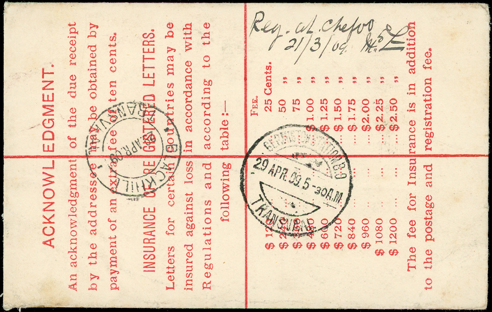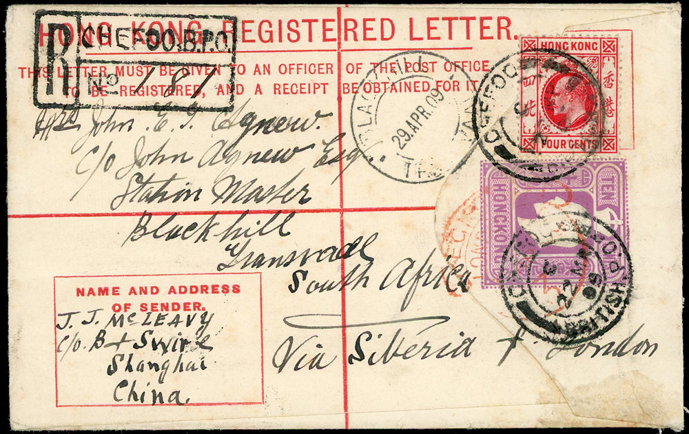 1909年香港愛德華七世10仙郵資封,由煙台掛號寄南非,加貼愛德華七世4先1枚,銷煙台22.MR.09英國客郵局戳,經喬治亞州1909.APR.29轉戳,正面另蓋長框『R/CHEFOO.B.P.O./No』 英客郵掛號章(Page 15)