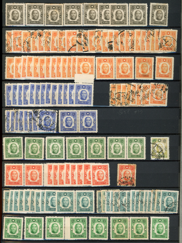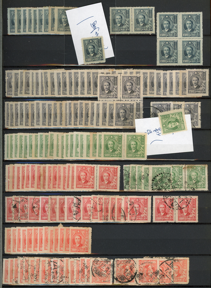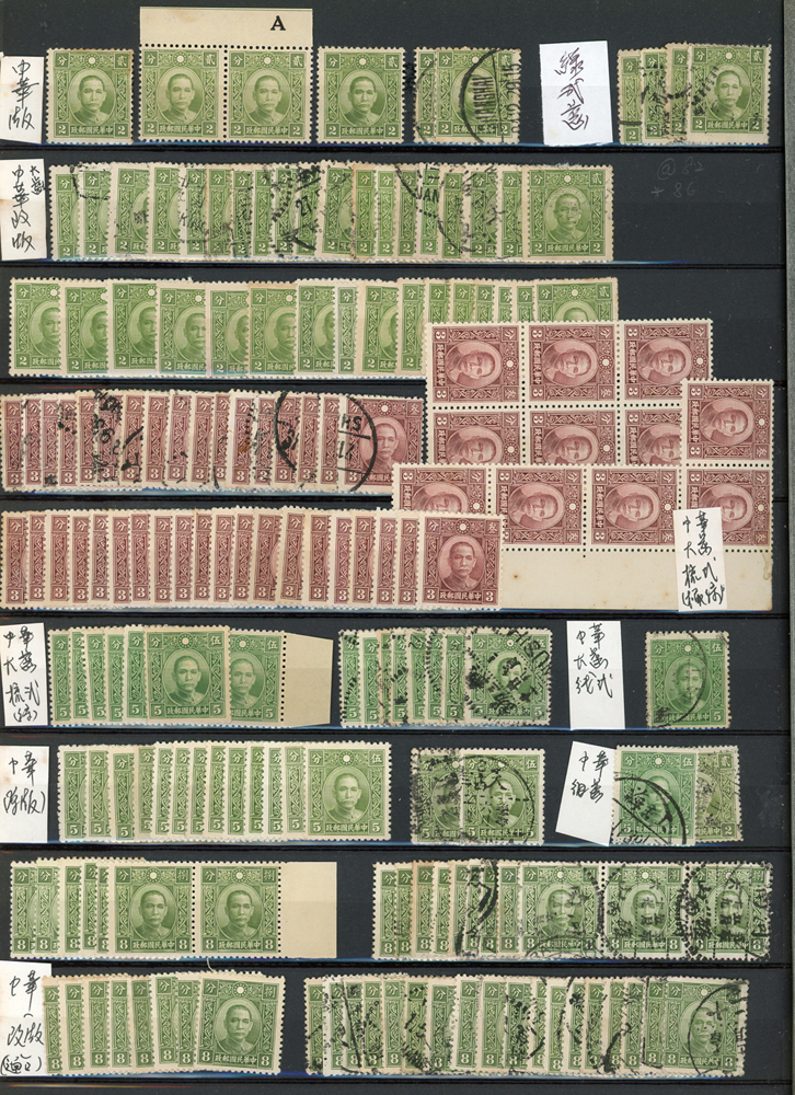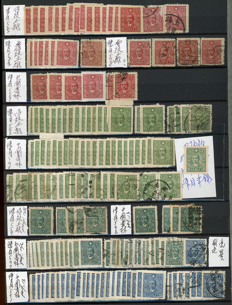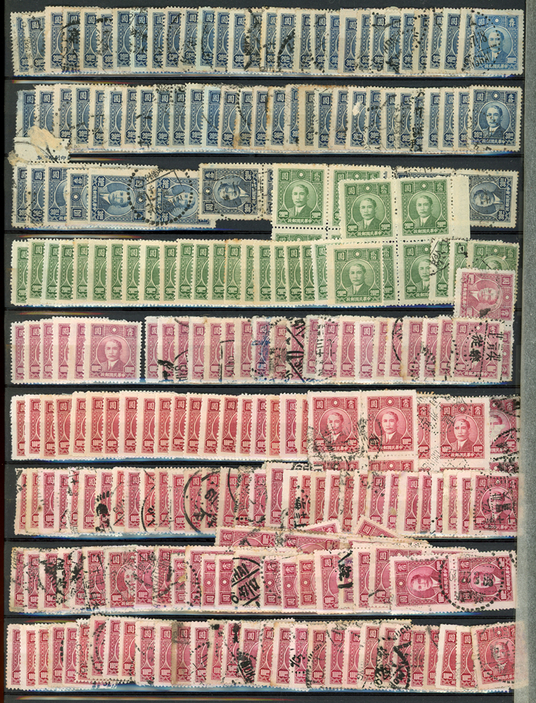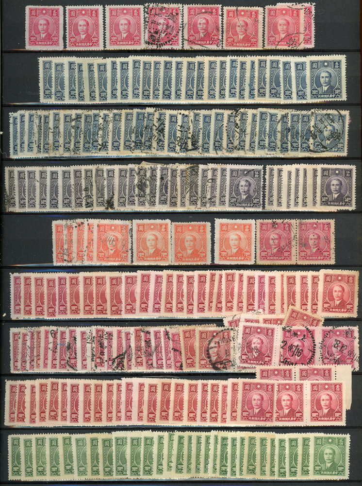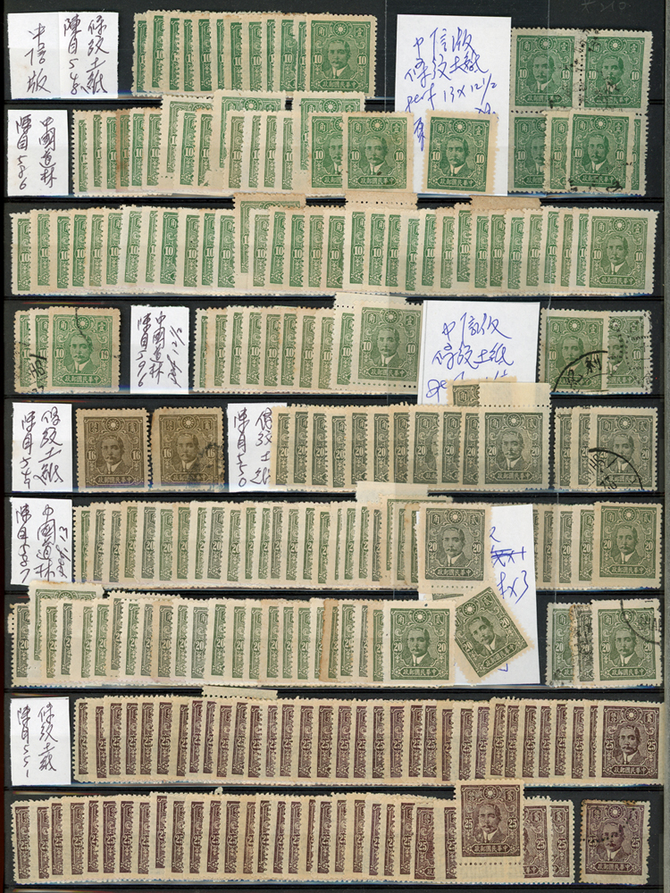民國時期各版國父像共8350枚,含新票約5000枚,舊票約3350枚,品種豐富含詳分紙張.齒度,整理整齊於冊中,包括有:國父像倫敦一.二版,國父像香港中華一.二版,國父像香港中華二版5元無齒未完成票,國父像紐約版,國父像中信版,國父像百城一版,國父像重慶中華版,國父像重慶大東版,國父像重慶中央版,國父像上海大東一.二.三版,國父像上海大東一.二版金圓,國父像倫敦四版等等,品像混合或有重複,VF-F,歡迎至官網瀏覽全貌(Page 18)
