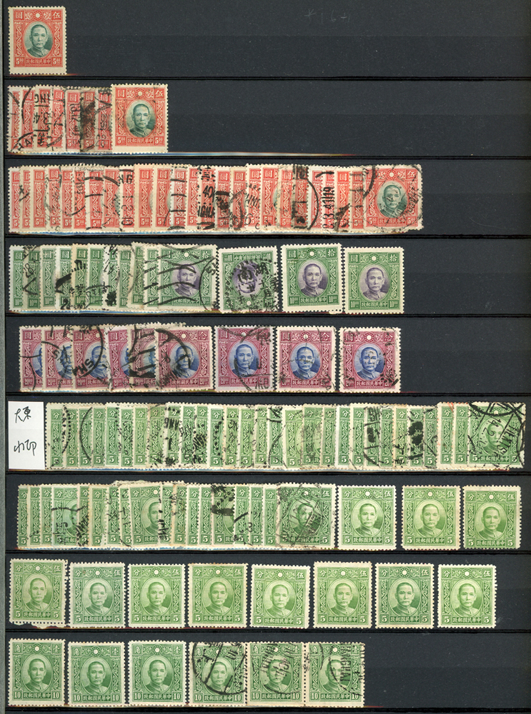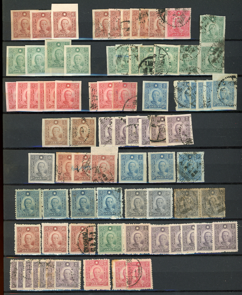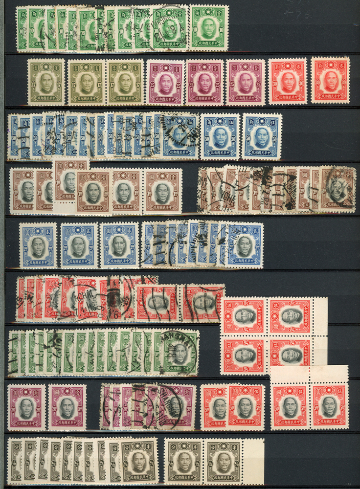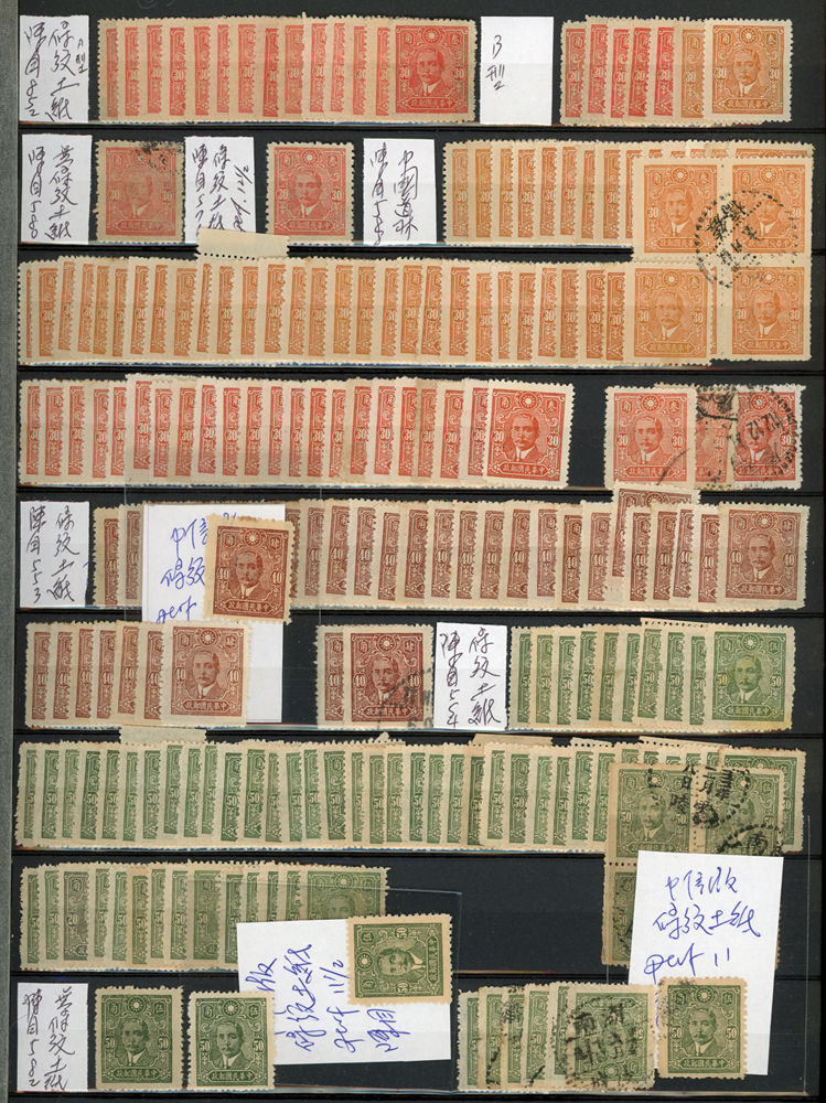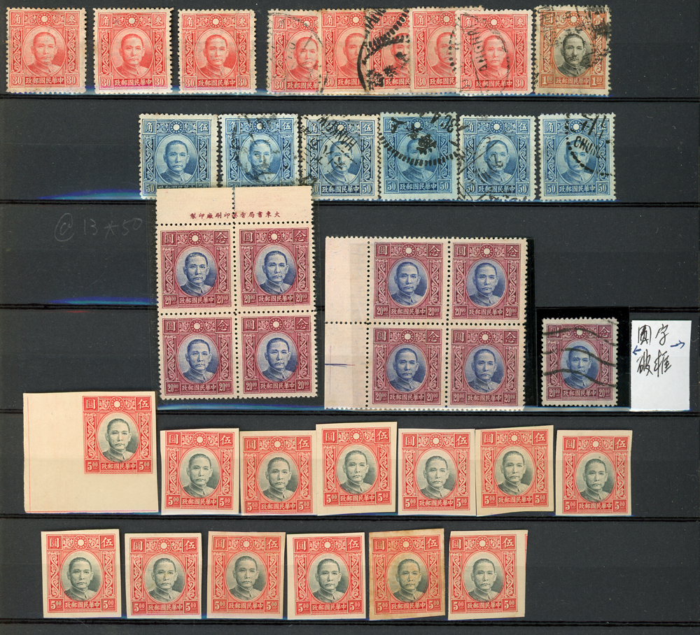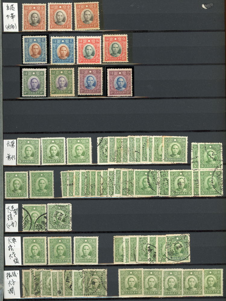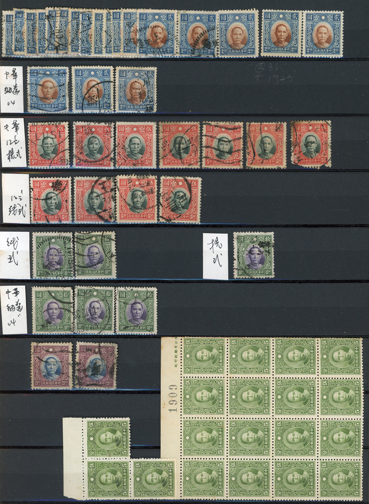民國時期各版國父像共8350枚,含新票約5000枚,舊票約3350枚,品種豐富含詳分紙張.齒度,整理整齊於冊中,包括有:國父像倫敦一.二版,國父像香港中華一.二版,國父像香港中華二版5元無齒未完成票,國父像紐約版,國父像中信版,國父像百城一版,國父像重慶中華版,國父像重慶大東版,國父像重慶中央版,國父像上海大東一.二.三版,國父像上海大東一.二版金圓,國父像倫敦四版等等,品像混合或有重複,VF-F,歡迎至官網瀏覽全貌(Page 18)