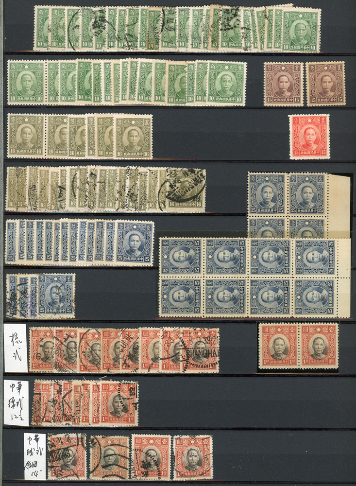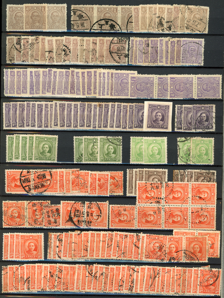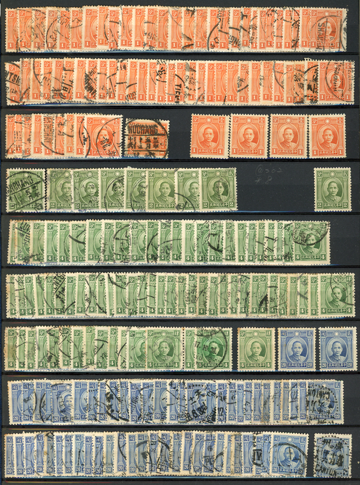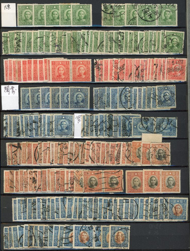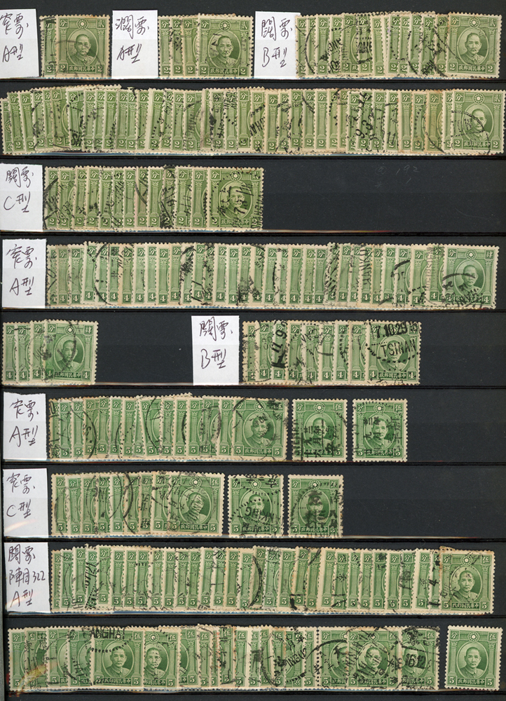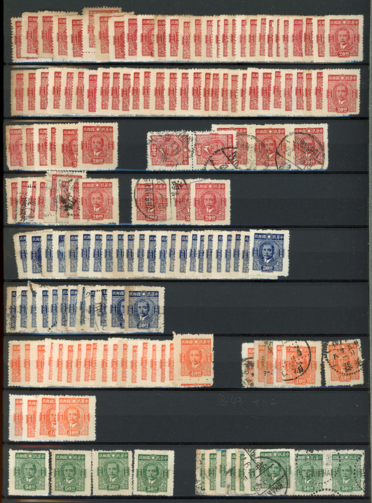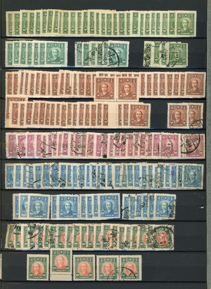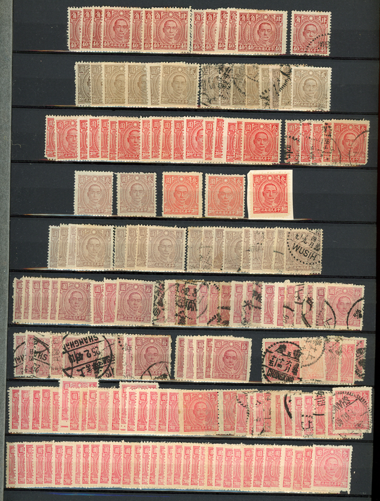 民國時期各版國父像共8350枚,含新票約5000枚,舊票約3350枚,品種豐富含詳分紙張.齒度,整理整齊於冊中,包括有:國父像倫敦一.二版,國父像香港中華一.二版,國父像香港中華二版5元無齒未完成票,國父像紐約版,國父像中信版,國父像百城一版,國父像重慶中華版,國父像重慶大東版,國父像重慶中央版,國父像上海大東一.二.三版,國父像上海大東一.二版金圓,國父像倫敦四版等等,品像混合或有重複,VF-F,歡迎至官網瀏覽全貌(Page 18)