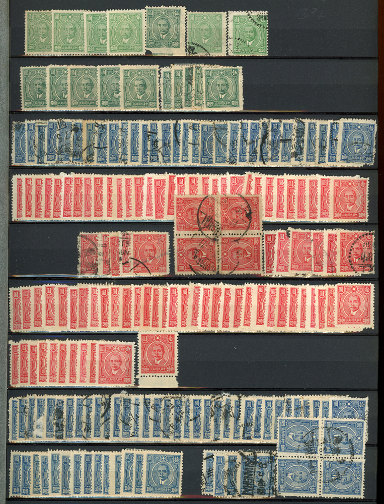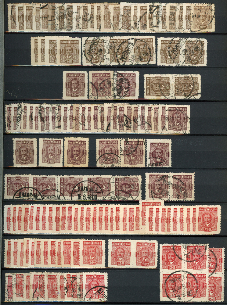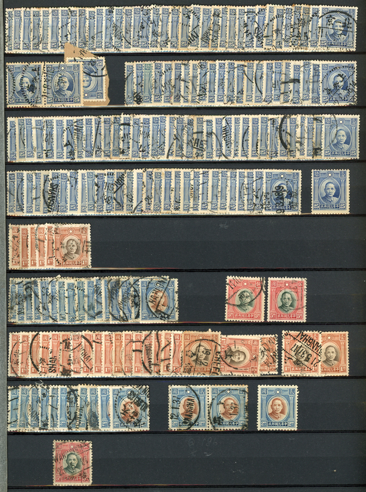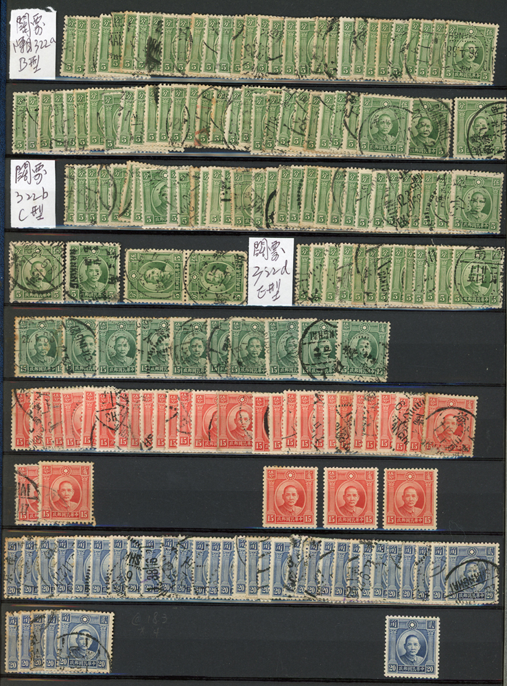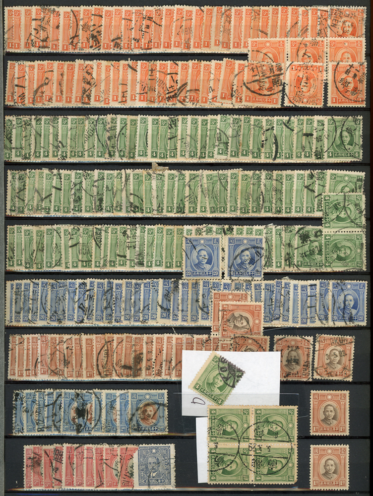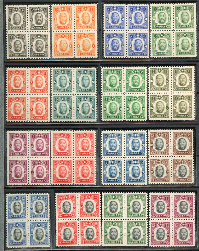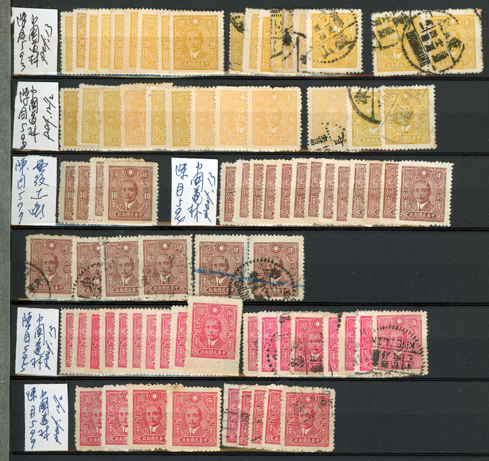 民國時期各版國父像共8350枚,含新票約5000枚,舊票約3350枚,品種豐富含詳分紙張.齒度,整理整齊於冊中,包括有:國父像倫敦一.二版,國父像香港中華一.二版,國父像香港中華二版5元無齒未完成票,國父像紐約版,國父像中信版,國父像百城一版,國父像重慶中華版,國父像重慶大東版,國父像重慶中央版,國父像上海大東一.二.三版,國父像上海大東一.二版金圓,國父像倫敦四版等等,品像混合或有重複,VF-F,歡迎至官網瀏覽全貌(Page 18)