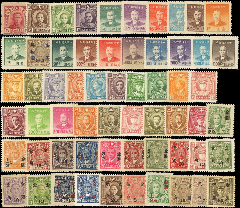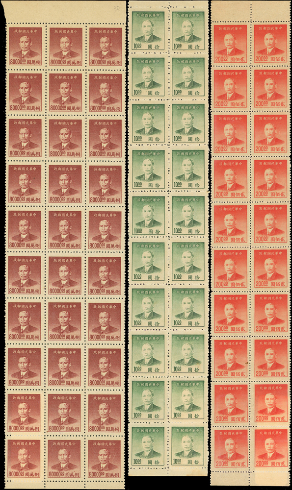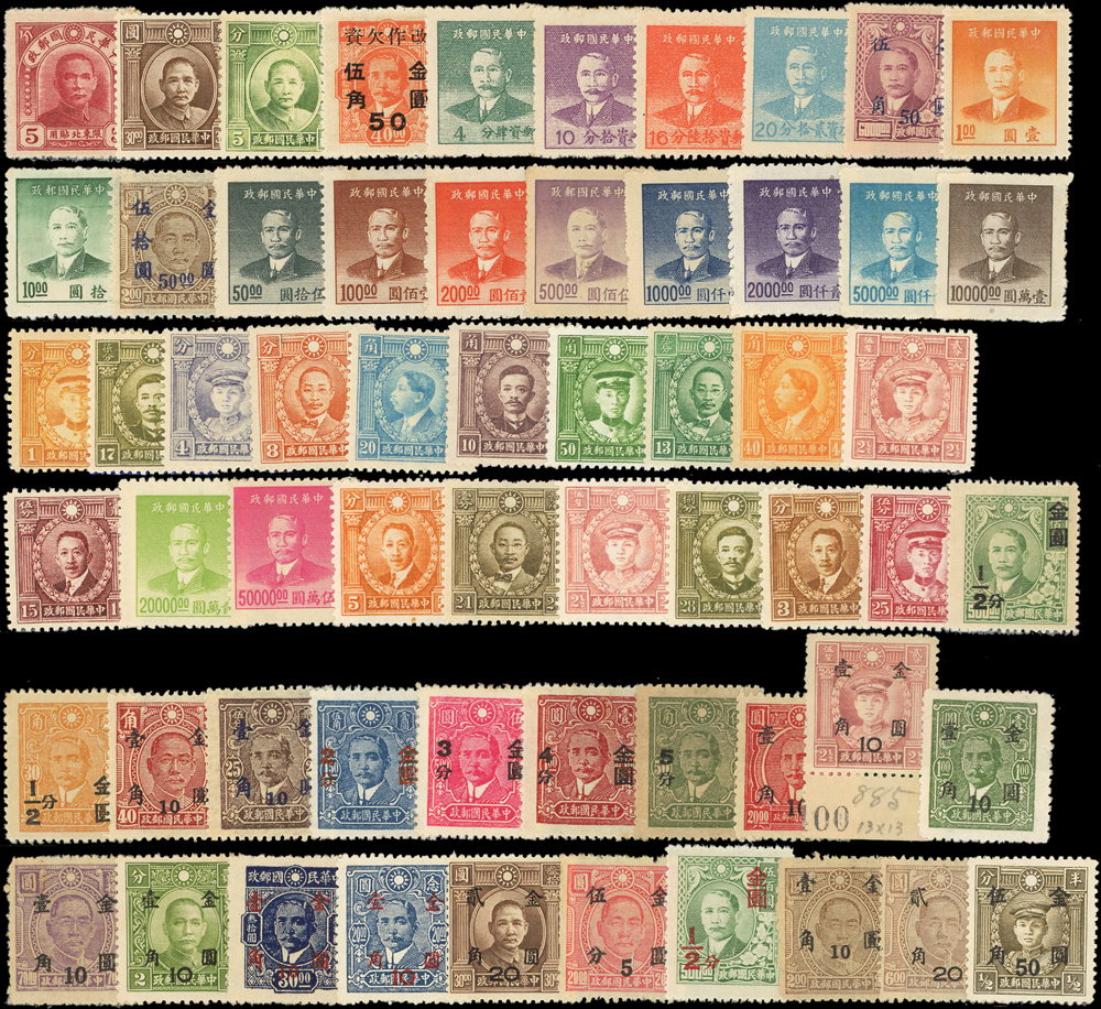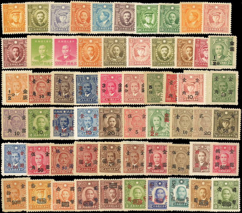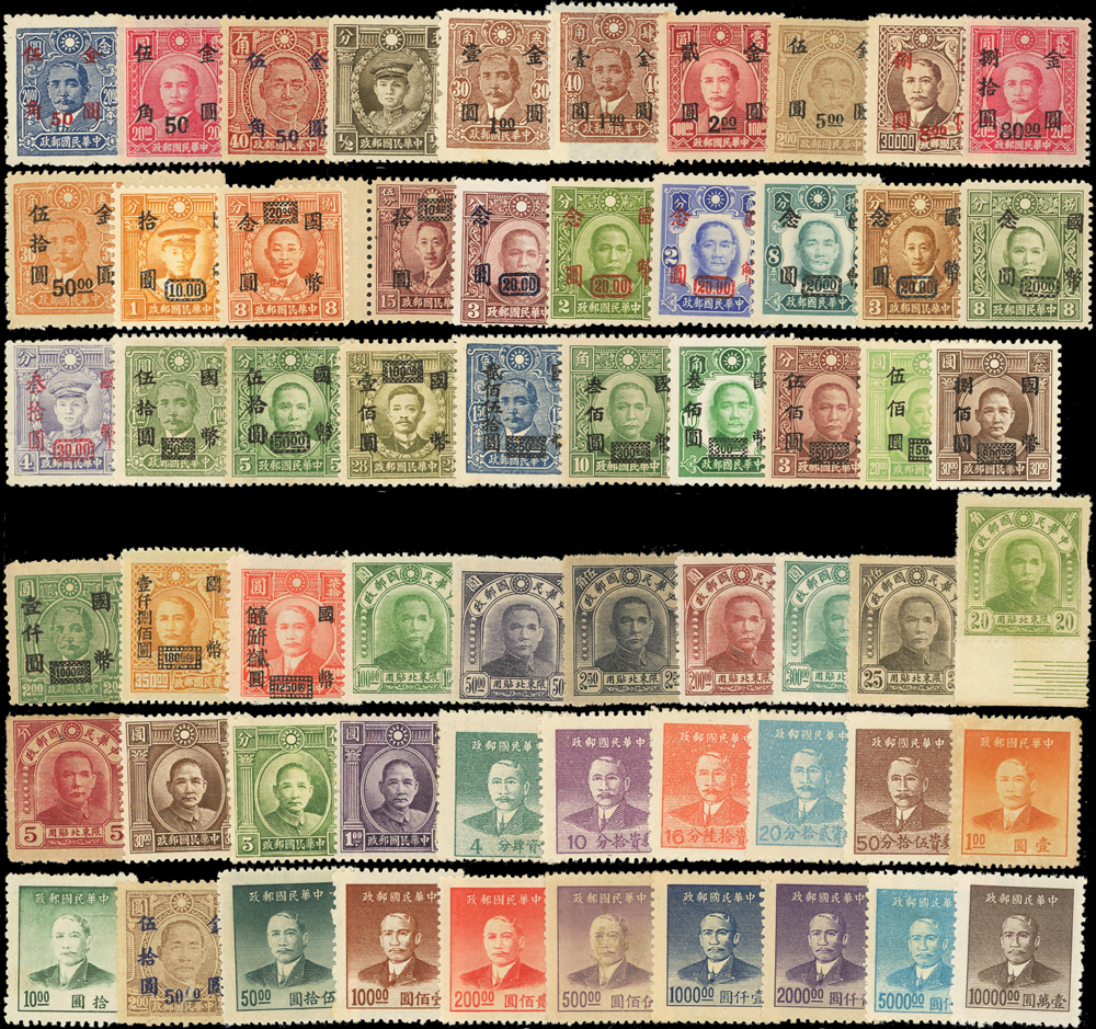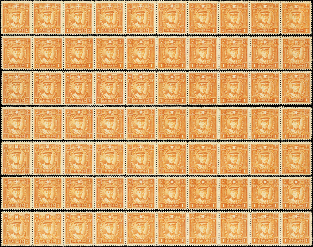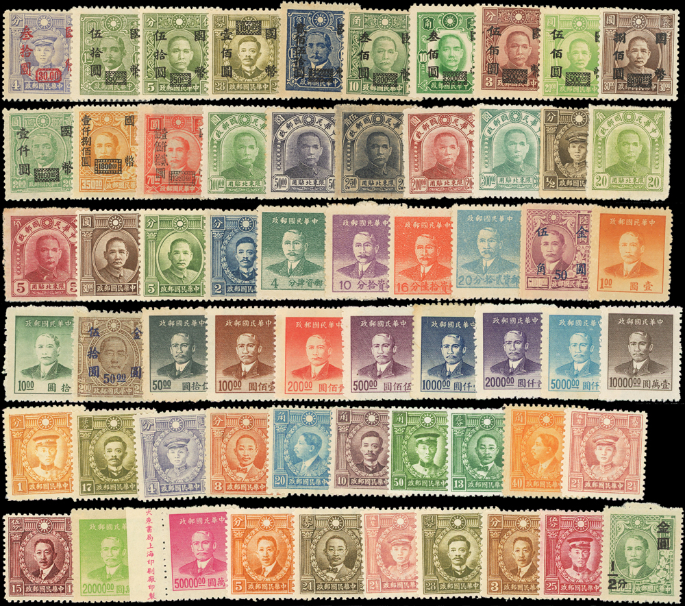 各版國父像先烈像不成套新票1767枚,部分為大方連,含:國父像烈士像改值金圓.國父像上海大東一版金圓.國父像重慶大東版.國父像改高額國幣.國父像北平中央二版限東北.北京版烈士像等;另中信一版欠資2元50方連新票1件,以上共1817枚,品像混合多重複,VF-F,歡迎至官網瀏覽全貌(Page 18)