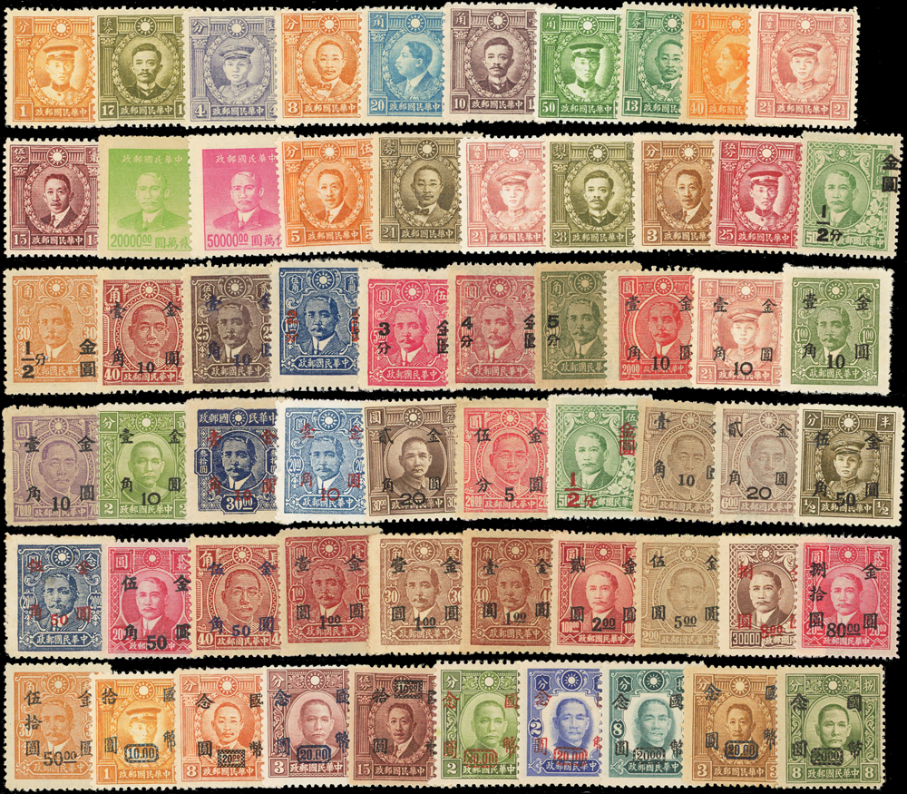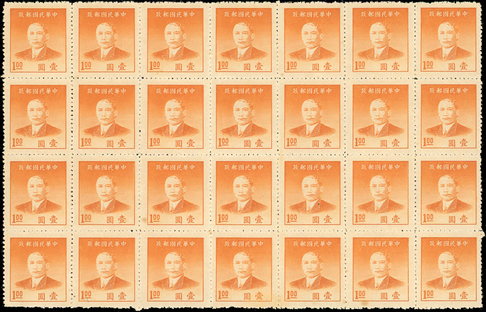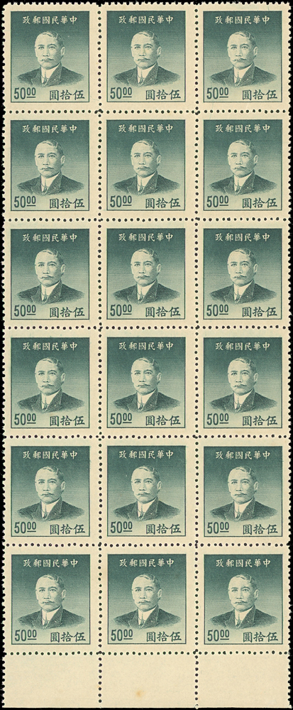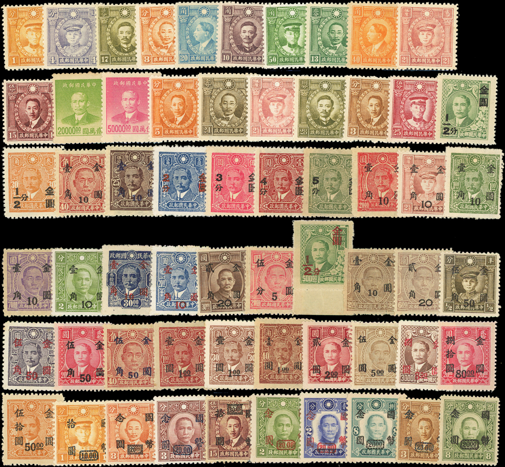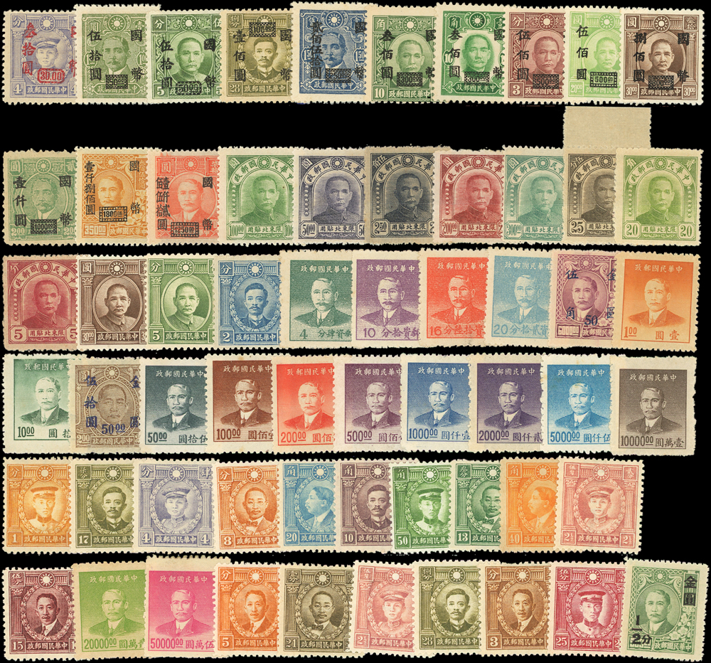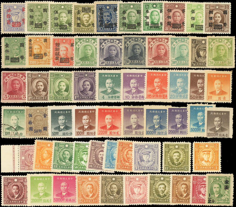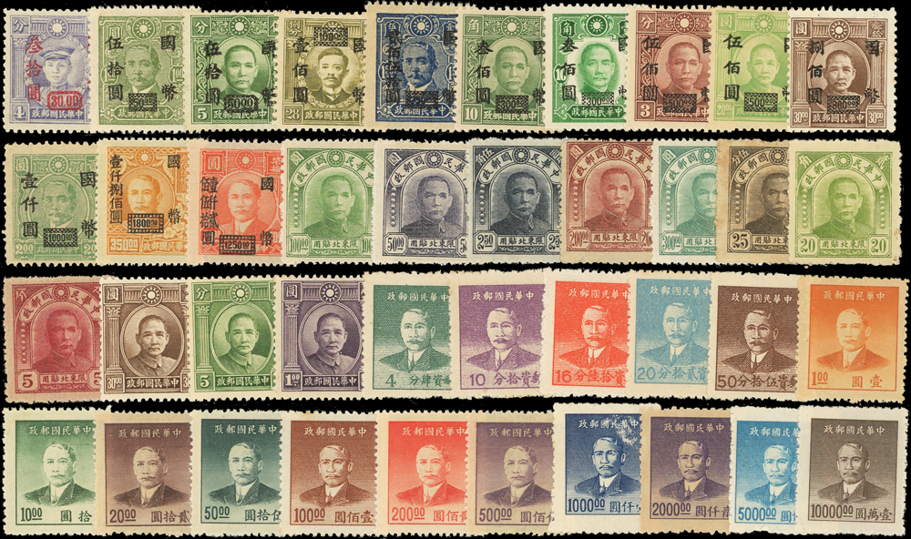各版國父像先烈像不成套新票1767枚,部分為大方連,含:國父像烈士像改值金圓.國父像上海大東一版金圓.國父像重慶大東版.國父像改高額國幣.國父像北平中央二版限東北.北京版烈士像等;另中信一版欠資2元50方連新票1件,以上共1817枚,品像混合多重複,VF-F,歡迎至官網瀏覽全貌(Page 18)