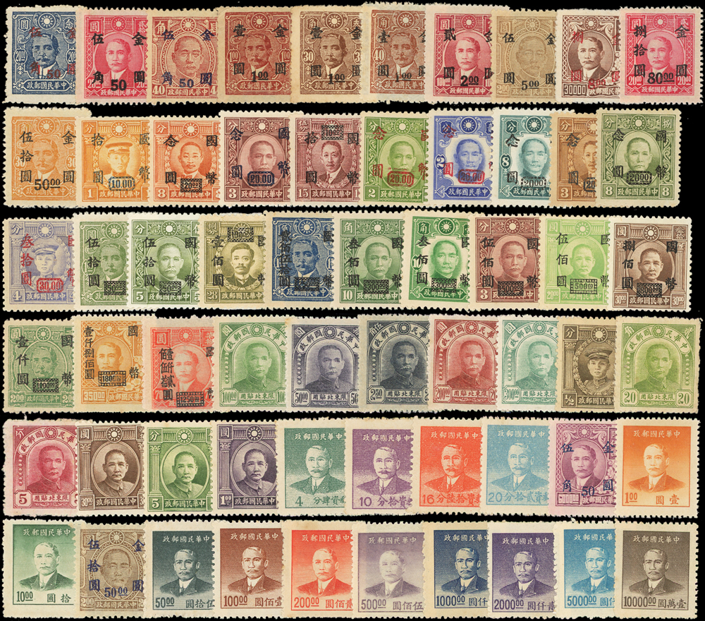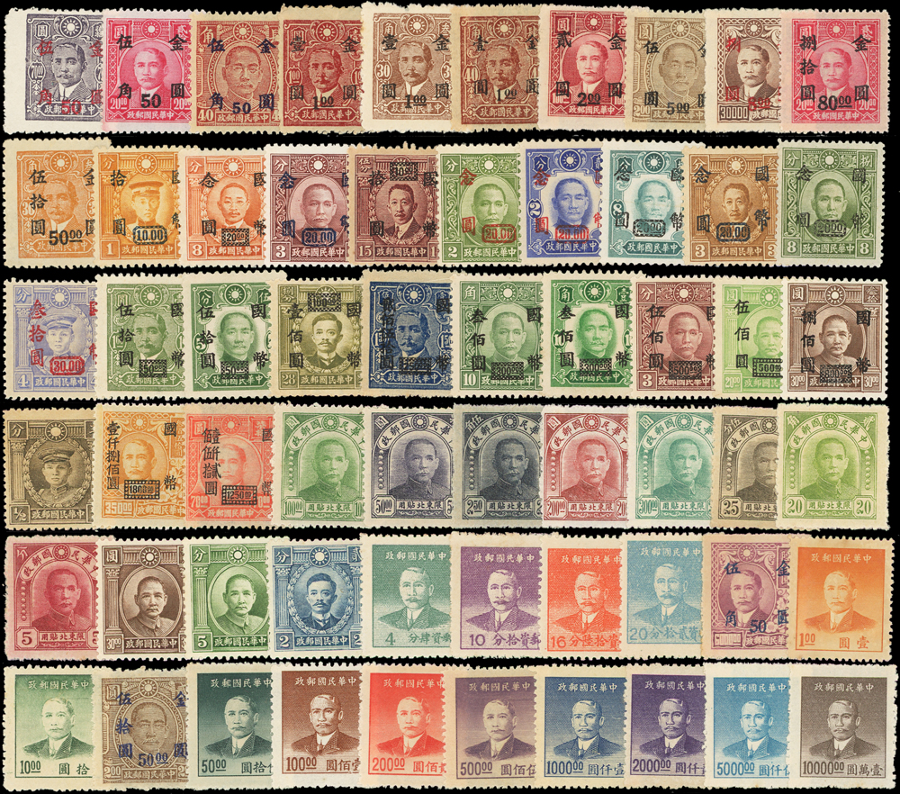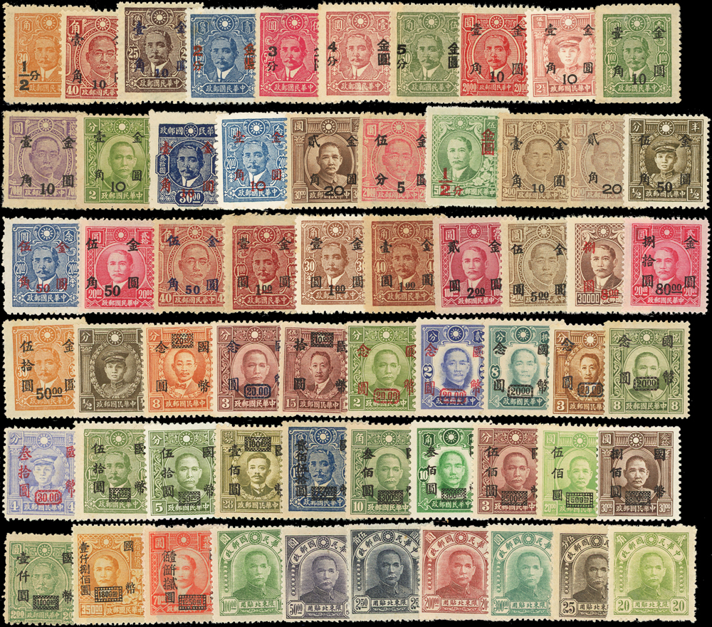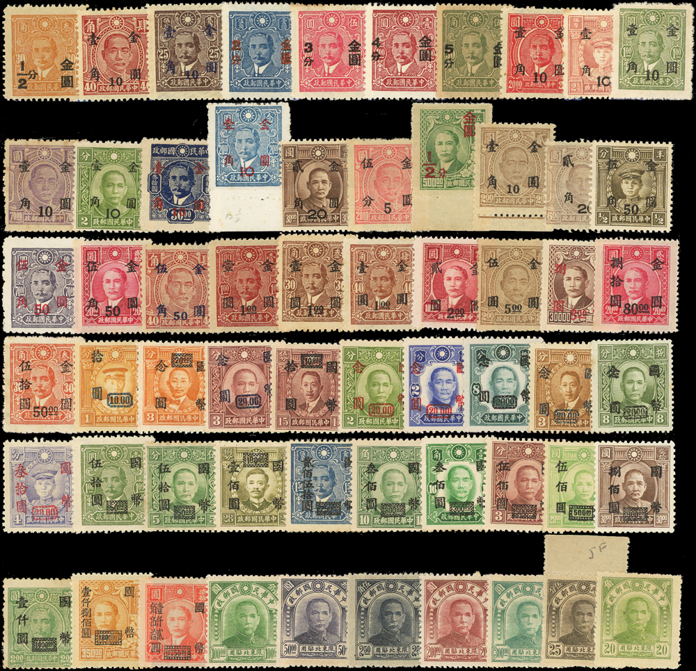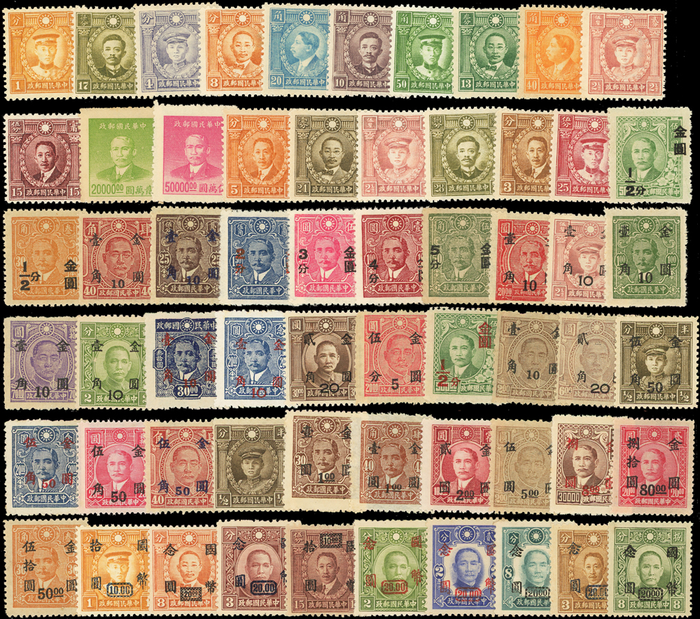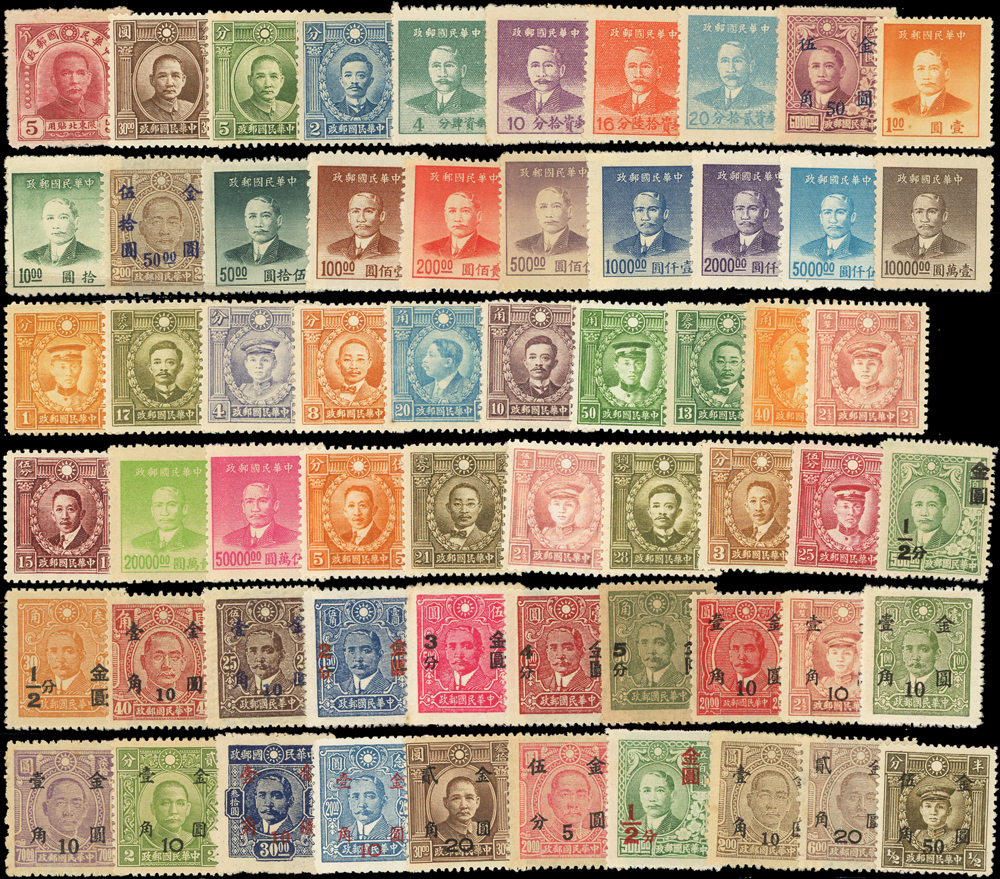 各版國父像先烈像不成套新票1767枚,部分為大方連,含:國父像烈士像改值金圓.國父像上海大東一版金圓.國父像重慶大東版.國父像改高額國幣.國父像北平中央二版限東北.北京版烈士像等;另中信一版欠資2元50方連新票1件,以上共1817枚,品像混合多重複,VF-F,歡迎至官網瀏覽全貌(Page 18)