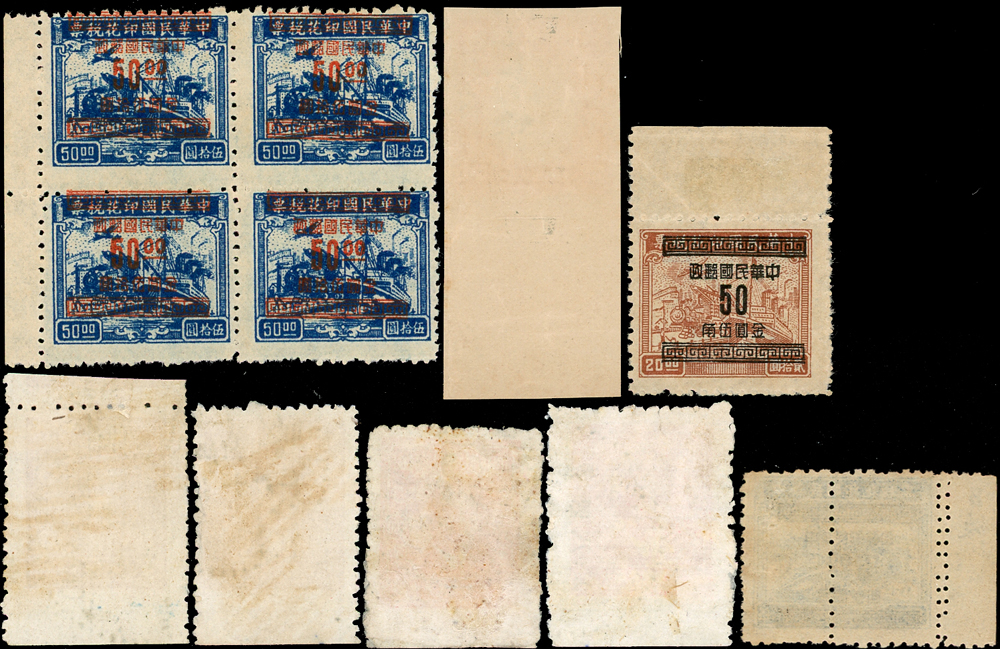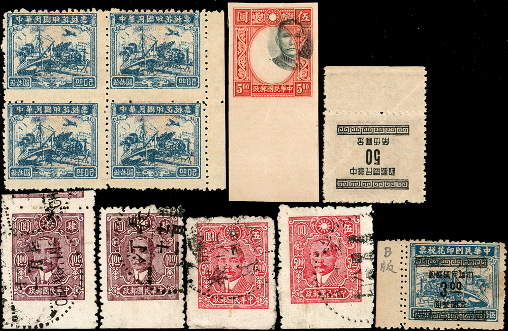 變體票一組11枚:(1)國父像香港中華二版5元無齒未完成票1枚,帶下寬邊,中心國父像往右上大移位變體;(2)印花稅票改作金圓上海現代加蓋5角新票1枚,帶上邊紙,背面黏印加蓋倒蓋;3元新票1枚,齒孔移位兼複齒;50元4方連新票背面黏印原票圖;(3)國父像百城二版舊票4元.5元各2枚,均長尾漏齒;以上品像混合,VF-F;歡迎至官網瀏覽全貌(Page 20)