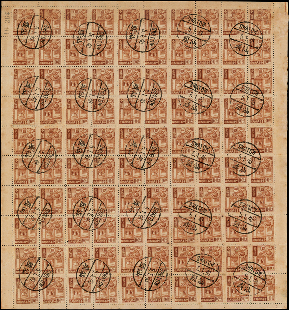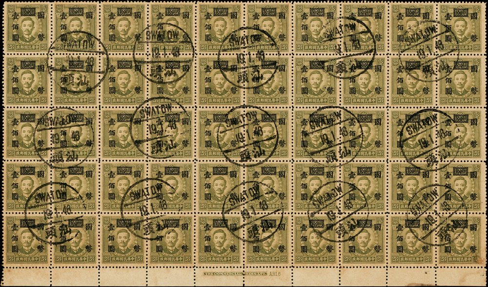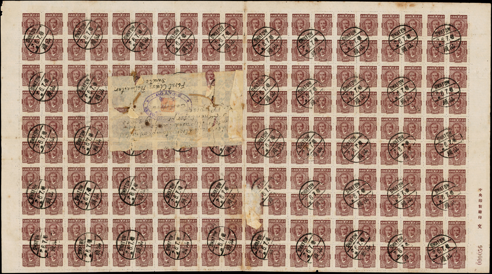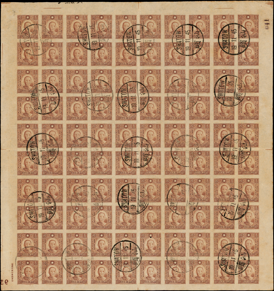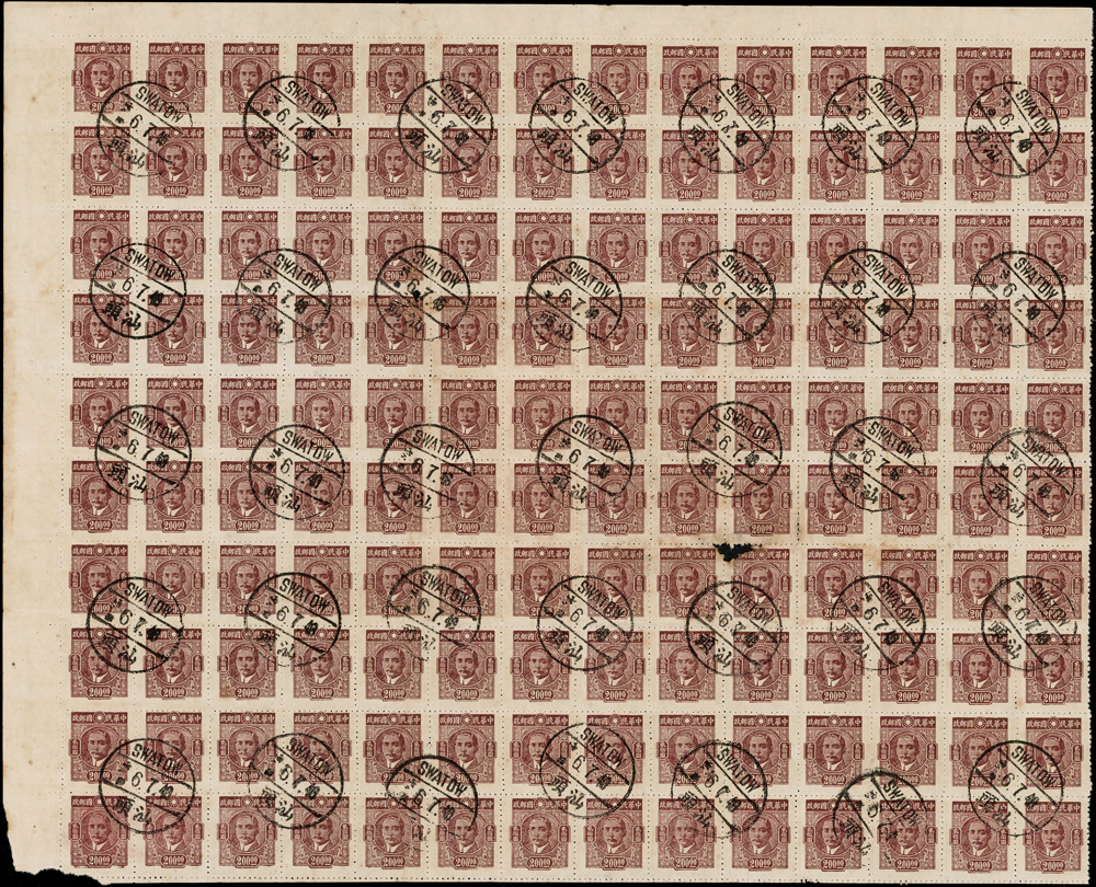 民國郵票銷汕頭日戳全戳一組:(1)國父像百城一版無齒100元100枚全張:(2)郵政儲金圖郵票100元100枚全張;(3)國父像重慶中央版郵票200元140枚方連(中央一破孔)及200枚全張(左半版中央貼紙);(4)國父像烈士像改值國幣100元50方連;以上品像混合,F-VF;歡迎至官網瀏覽全貌(Page 25)