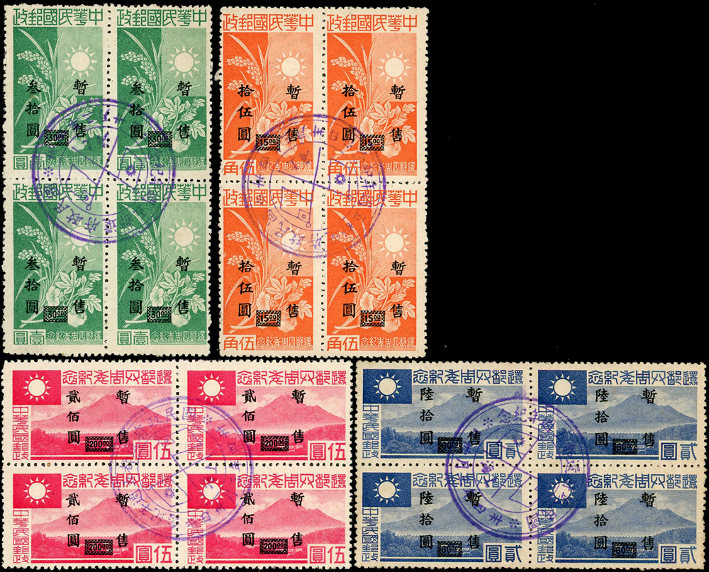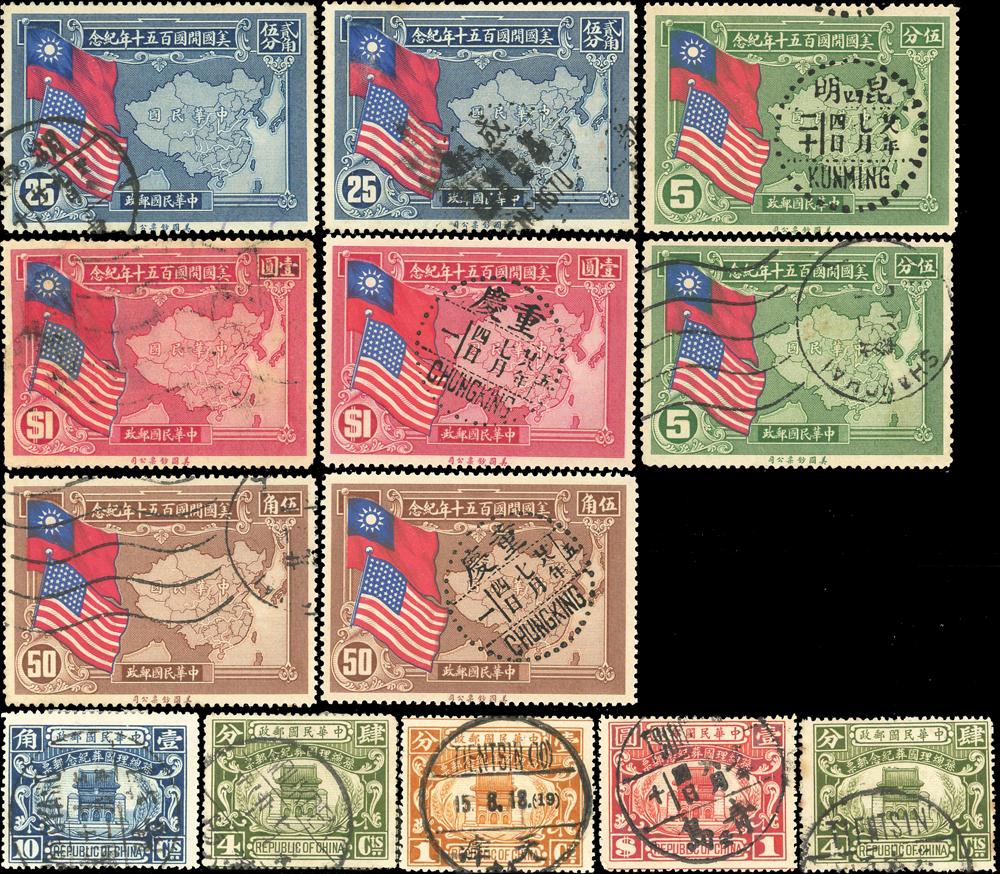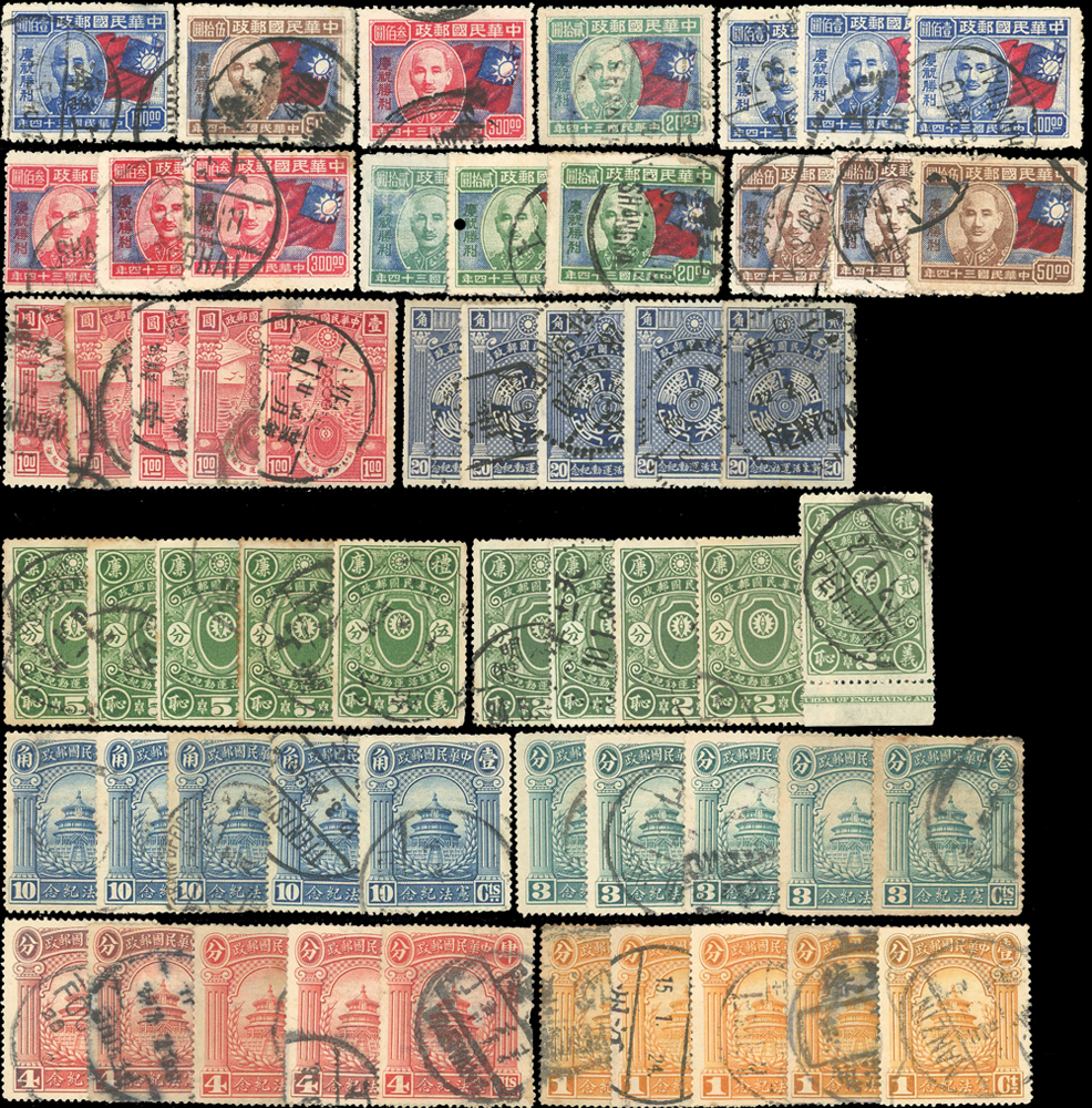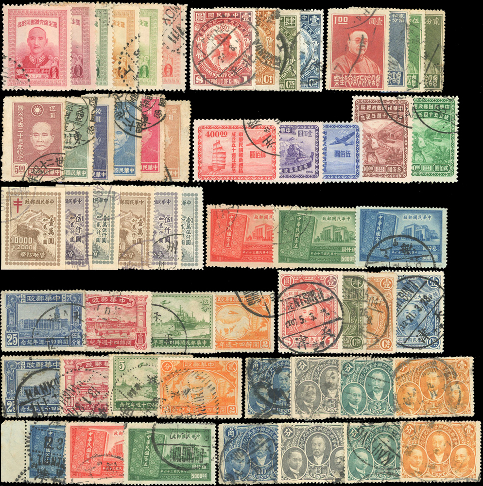 民國時期舊票34套,包括:孫總理國葬.譚院長.憲法紀念.中華郵政開辦25週年紀念.美國開國150週年.陸海軍大元帥就職紀念.國民政府統一紀念.中華郵政開辦40週年.蔣主席六秩壽辰.慶祝勝利.行憲紀念.新生活運動紀念.資助防癆附捐.國父逝世20週年等,品像混合或有重複,部分輕貼,F-VF,歡迎至官網瀏覽全貌