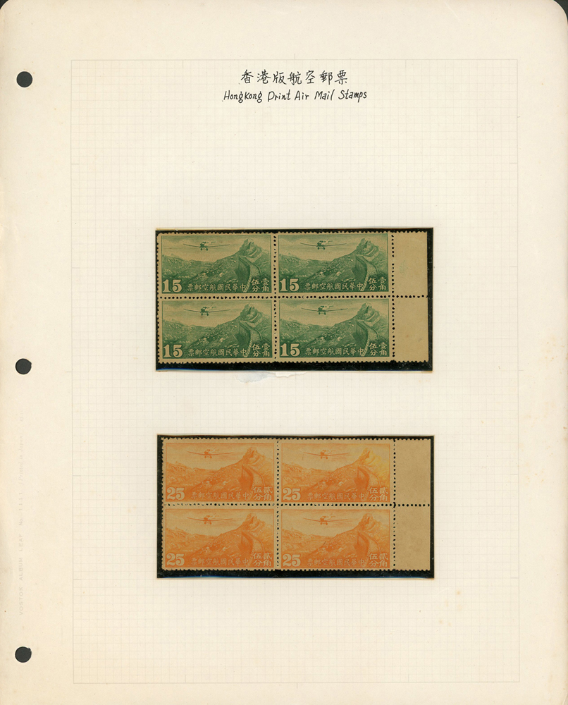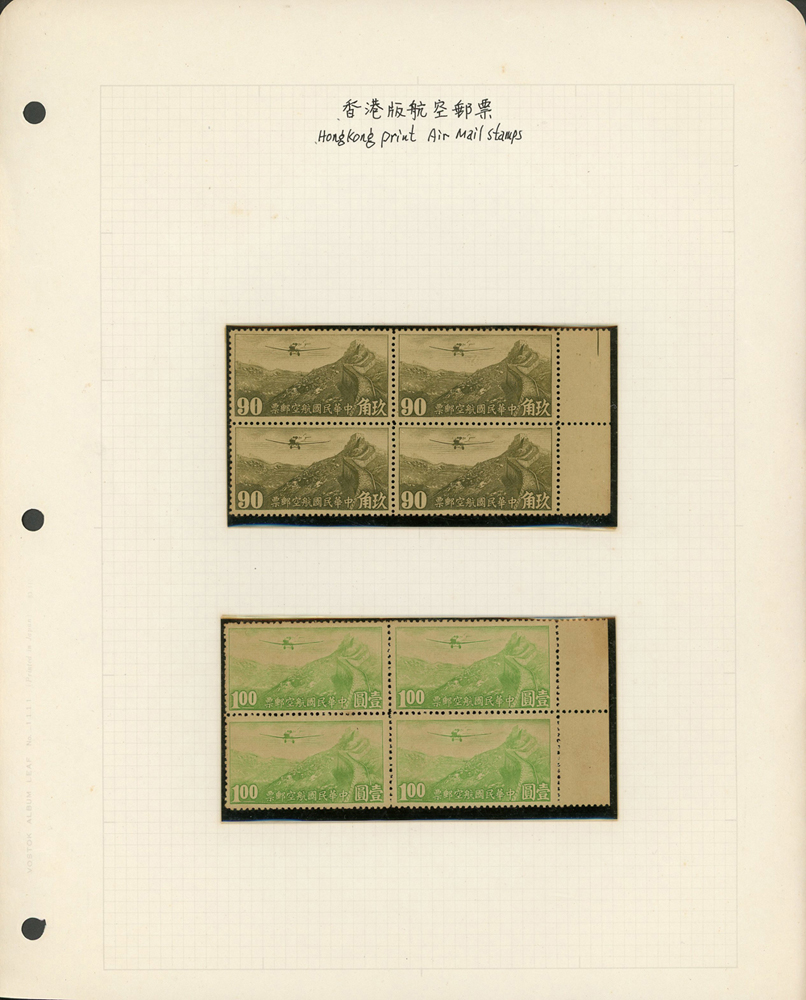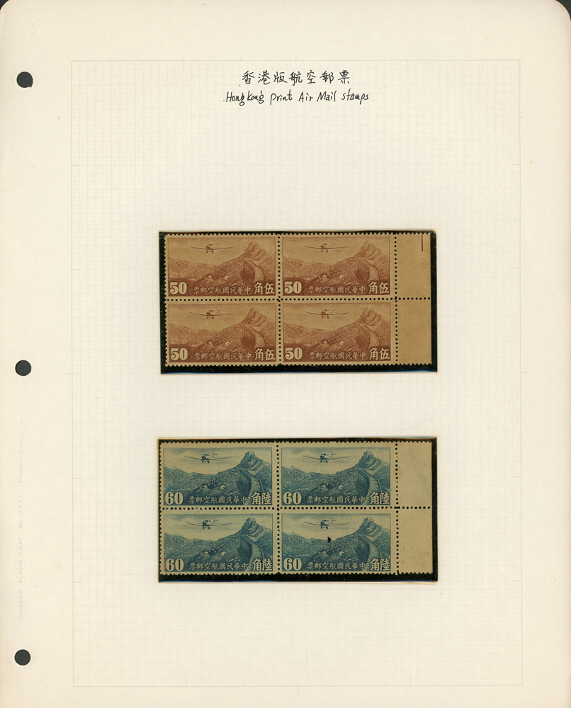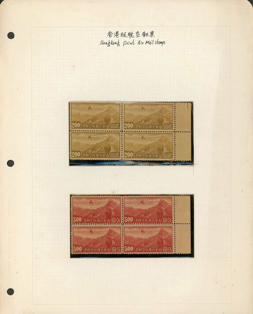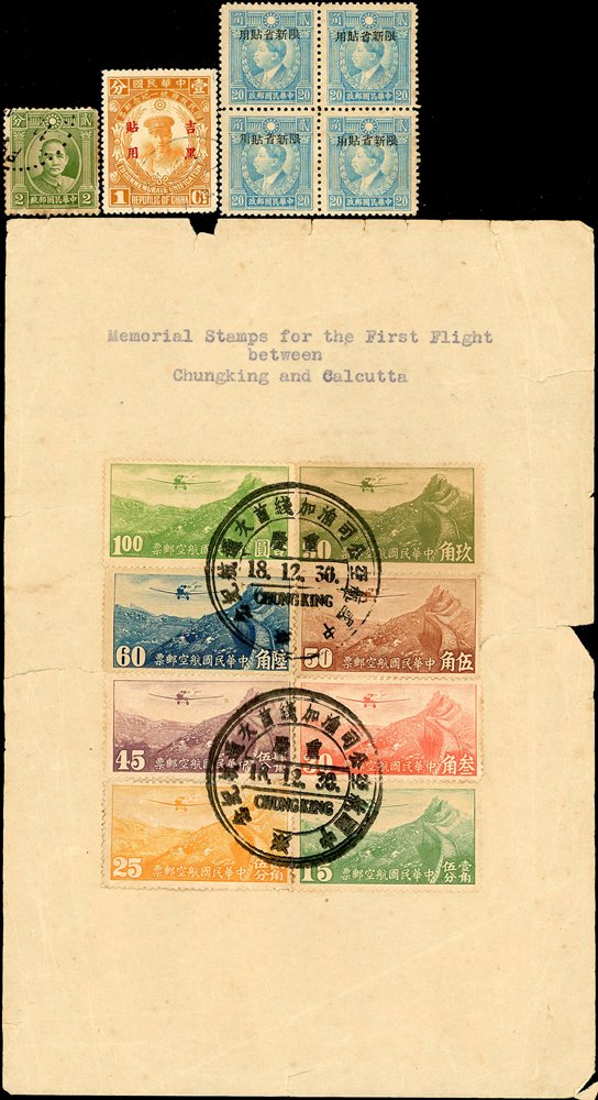 民國時期郵票:(1)紀13.中華郵政開辦40週年貼票冊,內頁貼其票4全銷上海36.10.10首日戳;(2)交通部贈國民政府還都一週年紀念貼票冊,內頁貼國父像紐約版半分.1分.5分.8分.1角.17分各1枚,銷國民政府還都一週年紀念/30.3.30/南京紀戳,冊中折;(3)欠9.國父像大東版加蓋暫作欠資2全新票;(4)航4.香港版航空新票20全;(5)航4.香港版航空無水印新票10全4方連;(6)白紙貼北京三版或香港版航空15分~1角共8枚,銷中國航空公司渝加綫首次通航/30.12.18紀戳;(7)香港版烈士像無水印2角4方連新票,國民政府統一限吉黑1分舊票,國父像倫敦一版2分舊票;以上品像混合,F-VF;歡迎至官網瀏覽全貌(Page 27 )