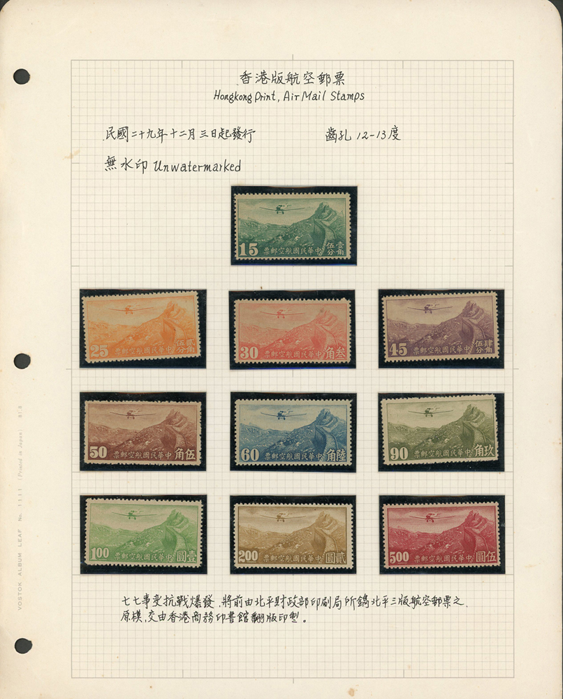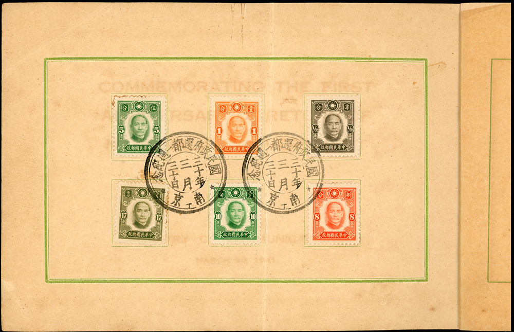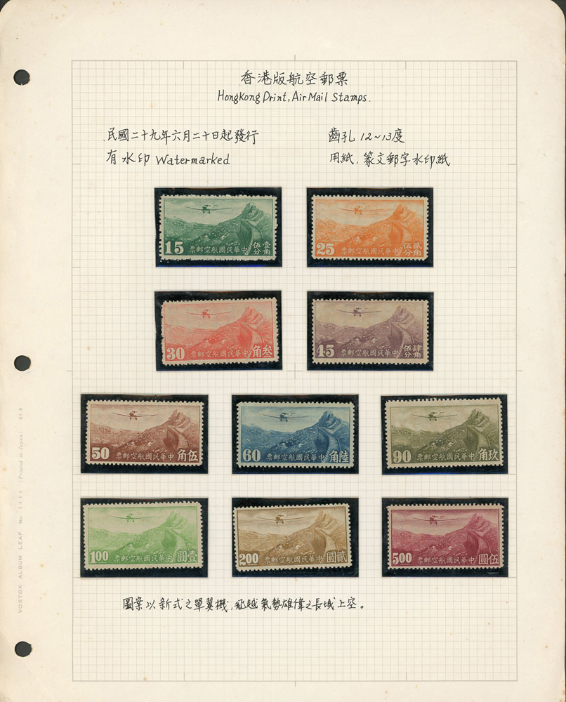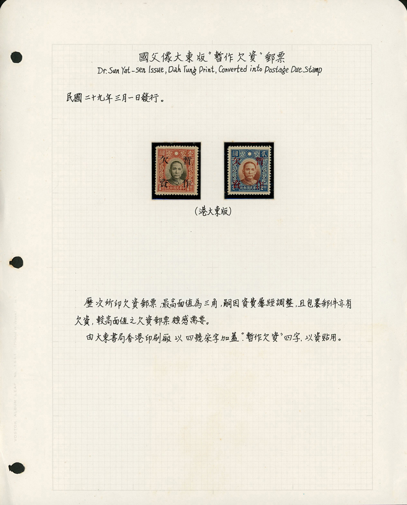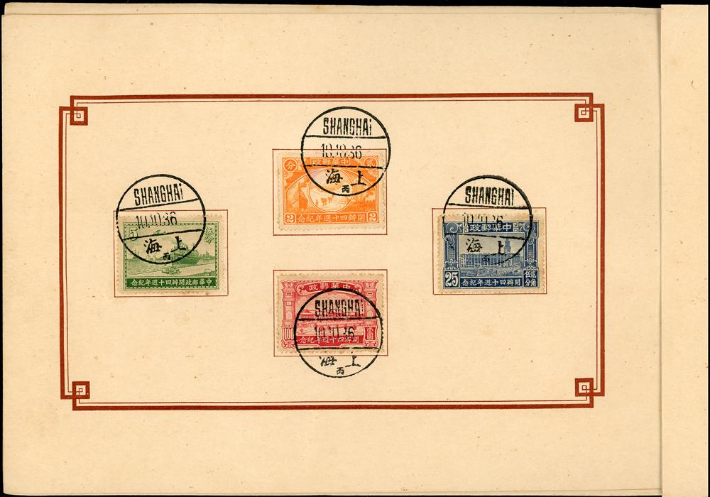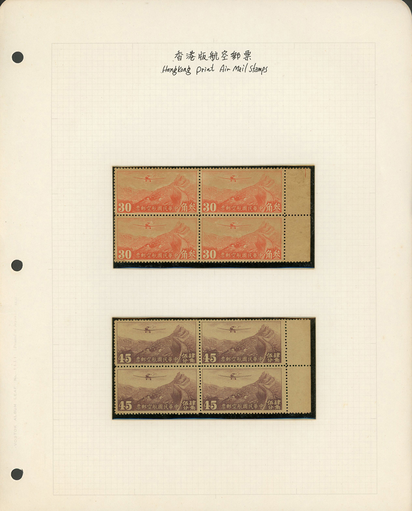 民國時期郵票:(1)紀13.中華郵政開辦40週年貼票冊,內頁貼其票4全銷上海36.10.10首日戳;(2)交通部贈國民政府還都一週年紀念貼票冊,內頁貼國父像紐約版半分.1分.5分.8分.1角.17分各1枚,銷國民政府還都一週年紀念/30.3.30/南京紀戳,冊中折;(3)欠9.國父像大東版加蓋暫作欠資2全新票;(4)航4.香港版航空新票20全;(5)航4.香港版航空無水印新票10全4方連;(6)白紙貼北京三版或香港版航空15分~1角共8枚,銷中國航空公司渝加綫首次通航/30.12.18紀戳;(7)香港版烈士像無水印2角4方連新票,國民政府統一限吉黑1分舊票,國父像倫敦一版2分舊票;以上品像混合,F-VF;歡迎至官網瀏覽全貌(Page 27 )