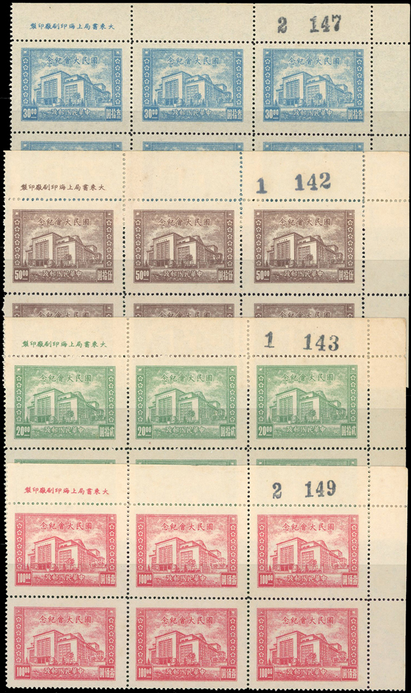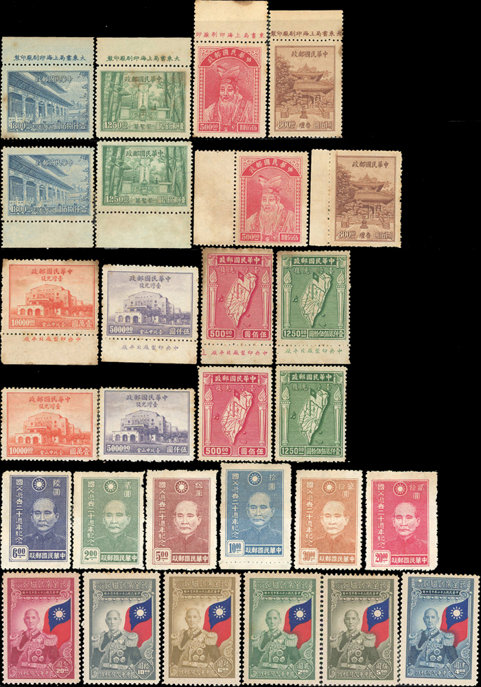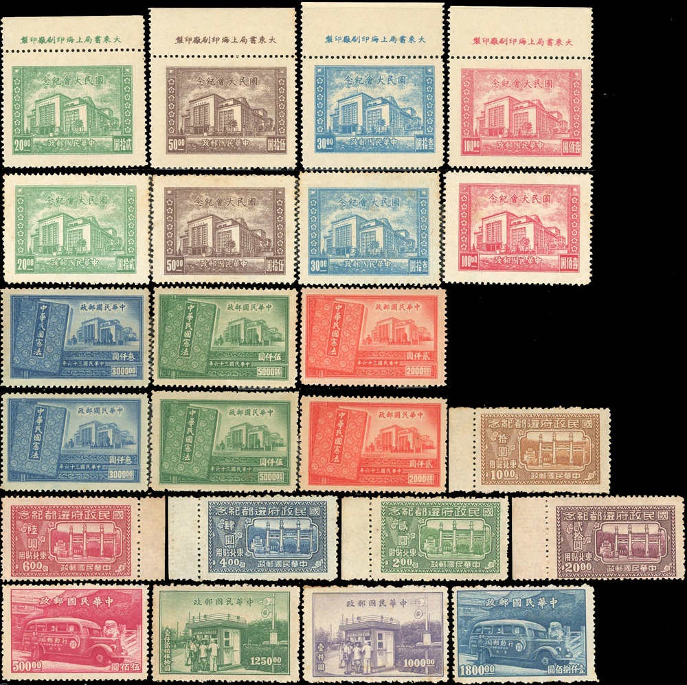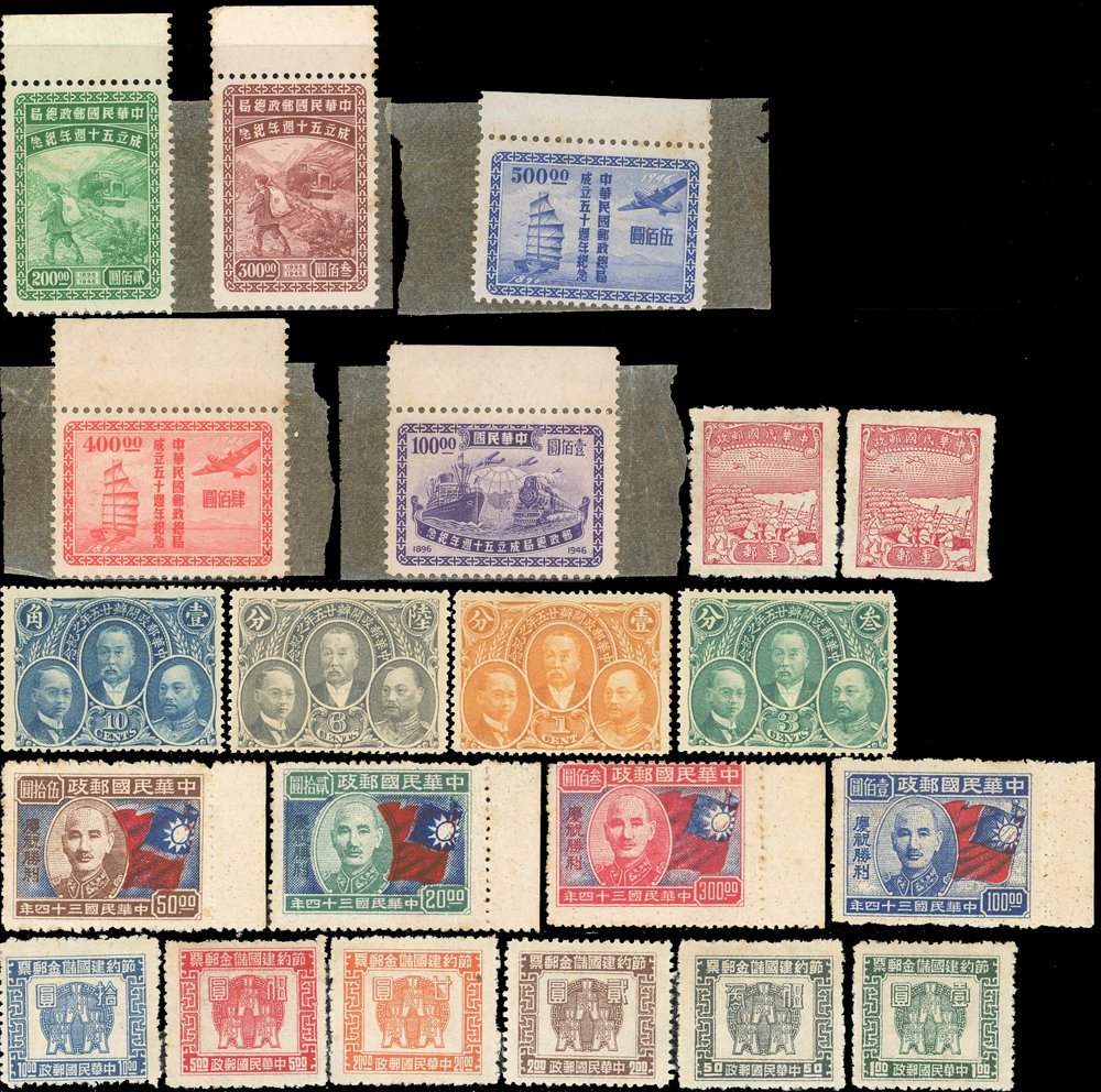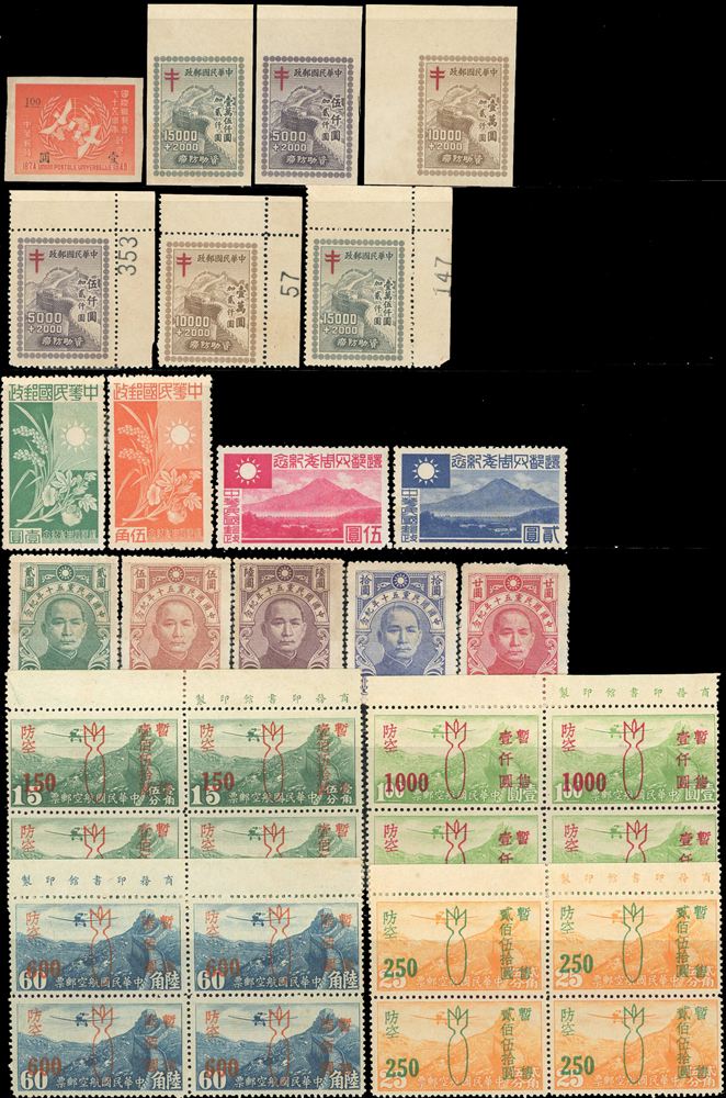 民國時期新票32套,包括:蔣主席就職紀念.國父逝世20週年.中華郵政開辦25週年.中國國民黨50年.慶祝勝利.國際聯郵會75週年.郵政總局成立50週年.國民政府還都限東北.行動郵局及郵亭.資助防癆附捐.第三次正版儲金.汪偽還都四週年各1套,國民大會8套(含1個6方連),行憲紀念.台灣光復.教師節.中信版軍郵各2套,汪偽防空節4方連,品像混合,部分背面黃,F-VF,歡迎至官網瀏覽全貌