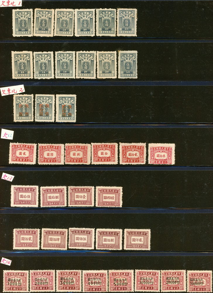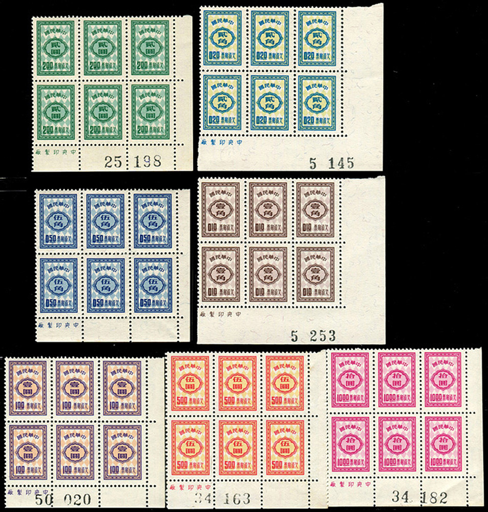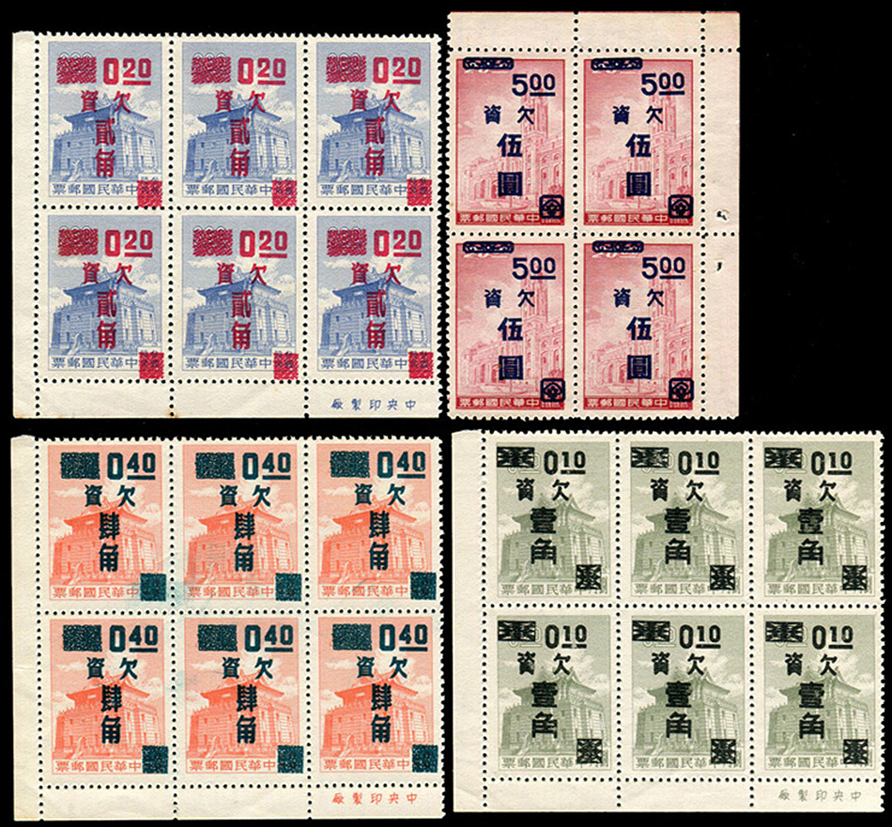 民國.台灣欠資新票29套,含:欠12.中信二版;欠13.上海版欠資(1枚背貼);欠14.倫敦二版改值欠資;欠東北1.限東北貼用欠資2套;欠東北2;欠台1;欠台2(500元折痕);欠17.先烈像改作欠資(貼痕);欠19.台北版欠資4方連;欠20.總統府改欠資4方連;欠21.莒光樓欠資6方連;欠22.五十五年版欠資郵票6方連;以上微黃或數點輕黃,VF-F