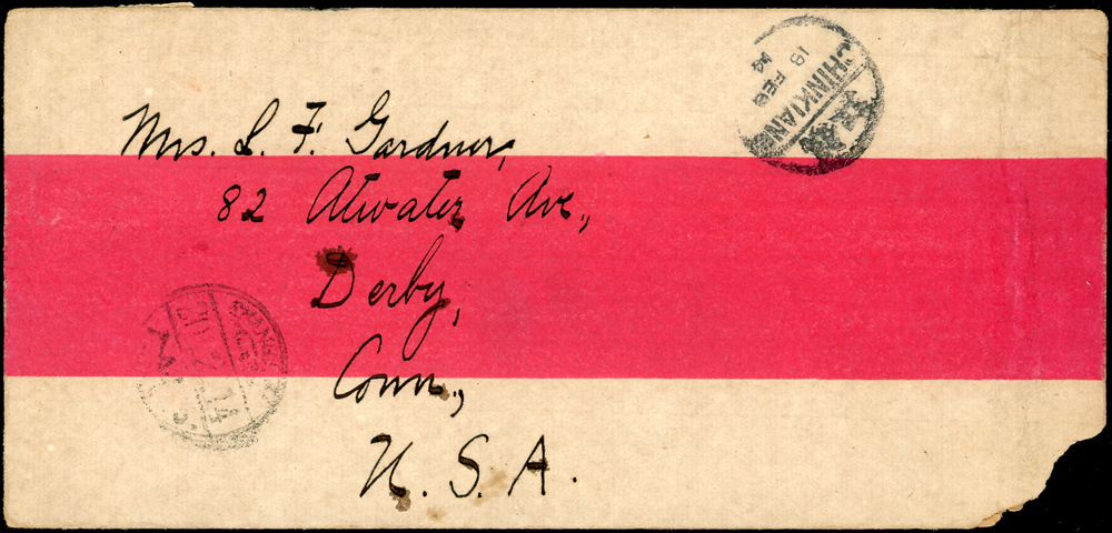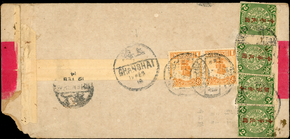 1914年鎮江寄美國中式紅條封,背貼蟠龍加蓋楷字中華民國2分4枚,帆船1分雙連(右枚票小損),銷江蘇鎮江府三年二月,正面銷鎮江1914.FEB.18漢英小圓戳,經上海1914.FEB.19,隔日轉上海日本客郵局(Page 33)