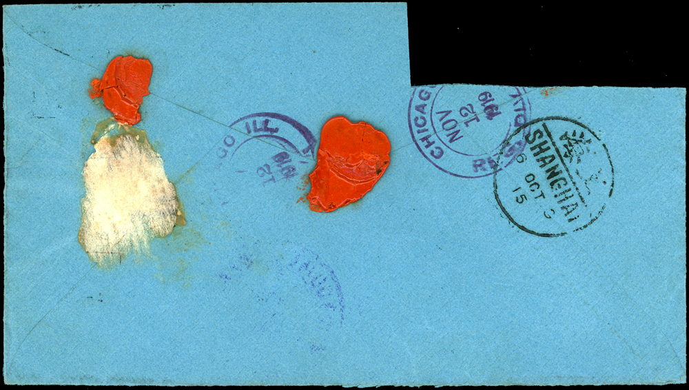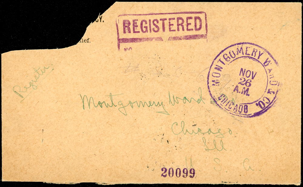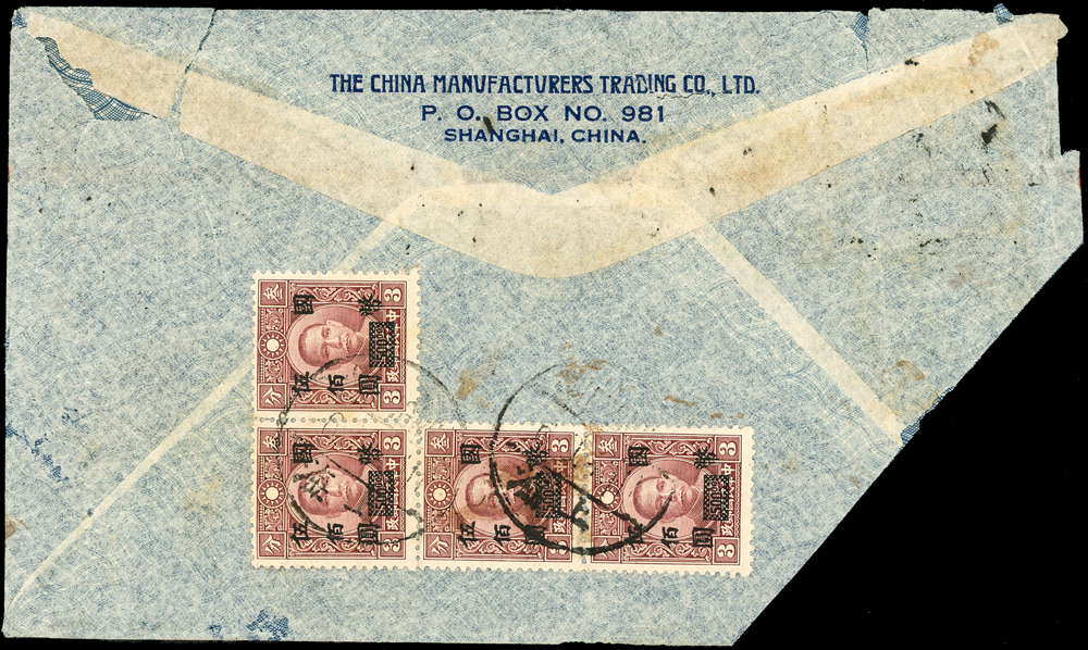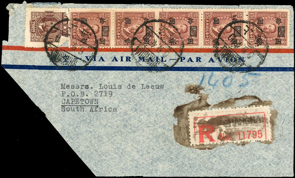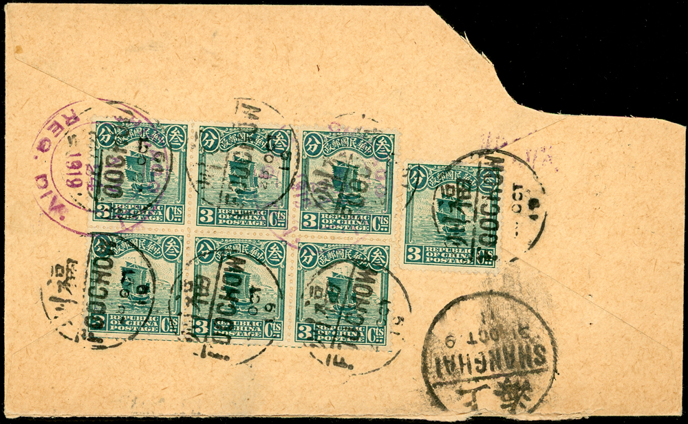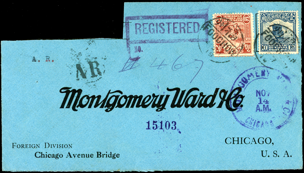 殘封三封:(1)1919年掛號西式封背貼帆船3分7枚,銷福州1919.OCT.28中英戳,經上海1919.OCT.31寄美國,正面銷MONTGOMERY/NOV.26到戳;(2)1919年掛號西式封貼帆船1角.農穫2角各1枚,銷福州2.OCT.29漢英小圓,經上海6.OCT.8,芝加哥1919.NOV.12,MONTGOMERY/NOV.14到戳;(3)1946年掛號西式封貼國父像烈士像改值國幣500元4枚.10元5枚,國父像重慶中央版200元1枚,銷上海6.9.46,寄南非(Page 33)