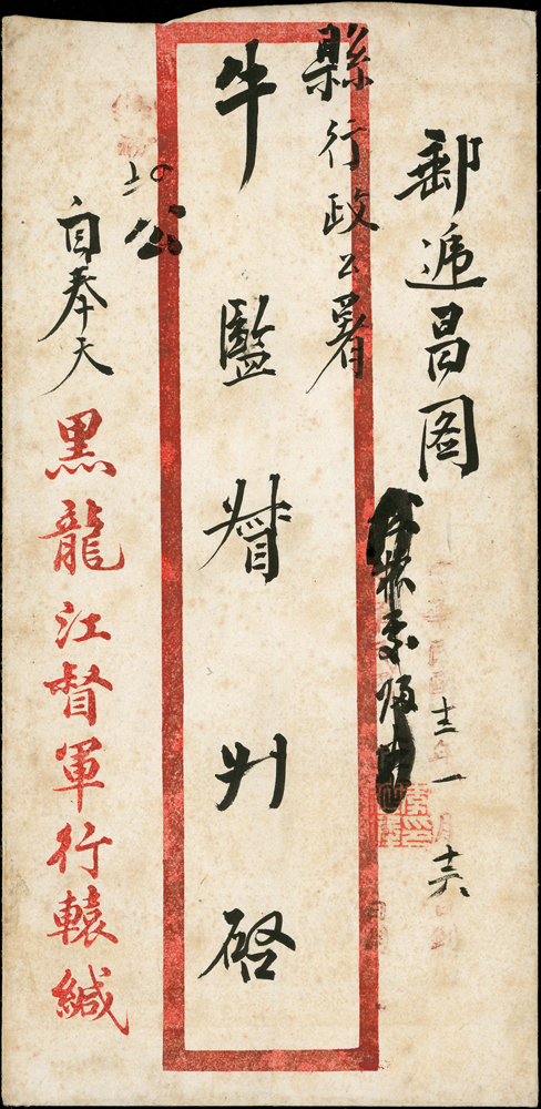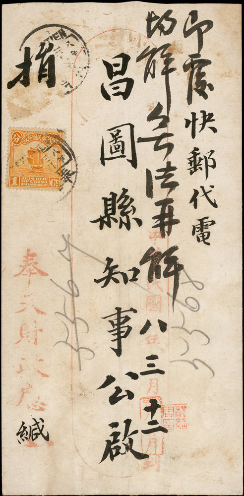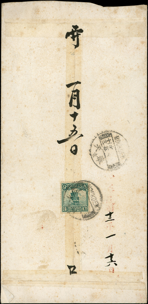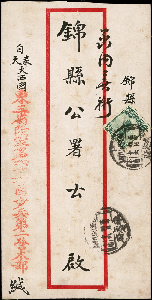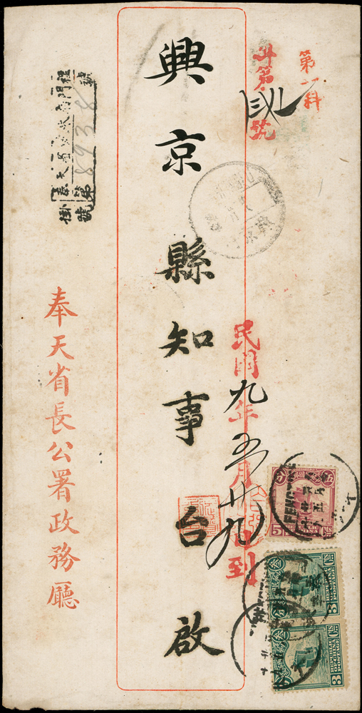 1919-1923年東北公文封四件,票戳俱全:(1)1919年奉天財政廳寄昌圖縣知事公文封;(2)1923年東三省陸軍第六十六團步兵第二營本部寄錦縣公署;(3)1920年奉天省長公署政務廳寄興京縣知事掛號公文封;(4)1923年黑龍江督軍行轅寄昌圖縣行政公署公文封(Page 33)