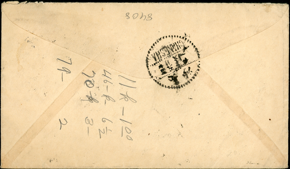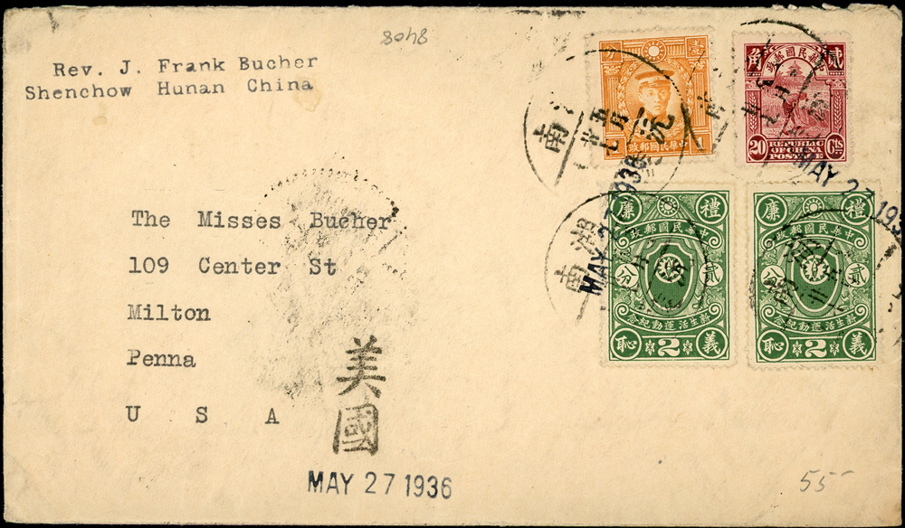 1936年湖南寄美國西式封,貼新生活運動2分2枚,農穫2角1枚,香港商務版烈士像1分1枚,銷湖南沅陵25.5.27戳,長沙25.5.X中轉戳,票上另銷『MAY 27 1936』防盜騎縫日期章;林茂興舊藏(Page 43)
