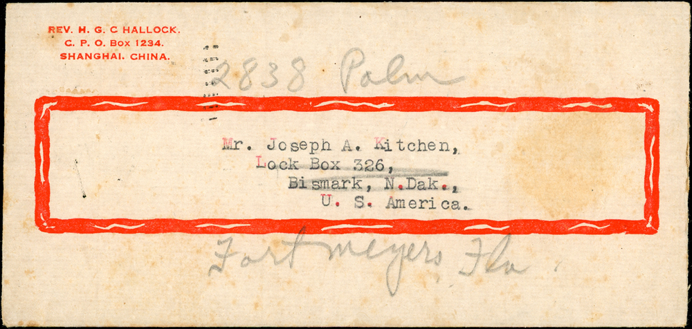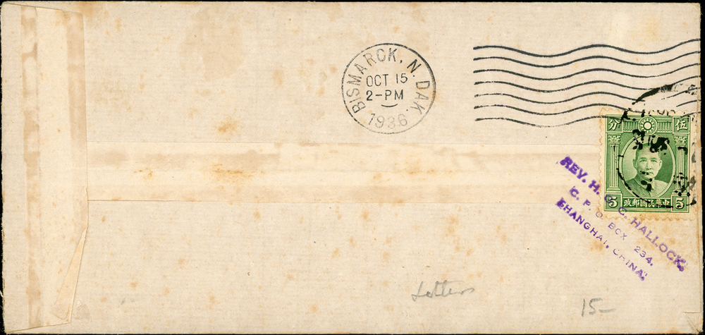 1936年上海寄美國水路印刷品封,背貼國父像倫敦一版5分1枚,銷上海日期不清,美國BISMARCK OCT.15.1936到戳,票上另銷『REV.H.G.C HALLOCK.C.P.O.BOX 1234.SHANGHAI.CHINA.』防盜騎縫地址章;林茂興舊藏(Page 43)