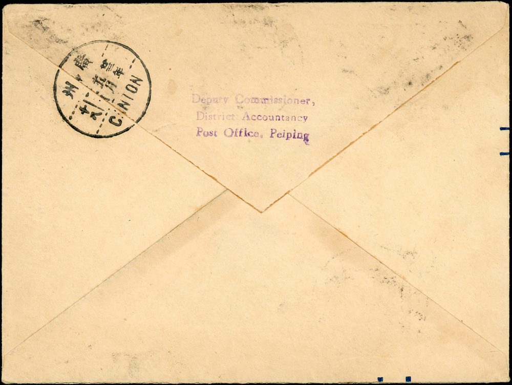 1934年北平至廣東平粵航空郵運飛航首航封,貼北京三版航空15分1枚.3角2枚,國父像倫敦一版5分1枚,銷開航首日紀戳,旁銷北平34.5.1中英戳,廣州23.5.2到達戳(Page 44)
