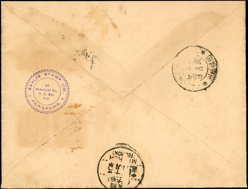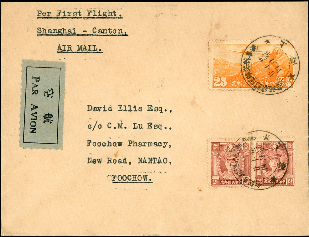 1933年上海至廣州首航封,貼北京版烈士像2.5分2枚,北京三版航空2.5角1枚,銷『滬粵郵運開航紀念/卅二年十月卄四/上海』首日戳,背銷閩侯(福州)22.10.24到達戳及首航紀念戳(Page 44)