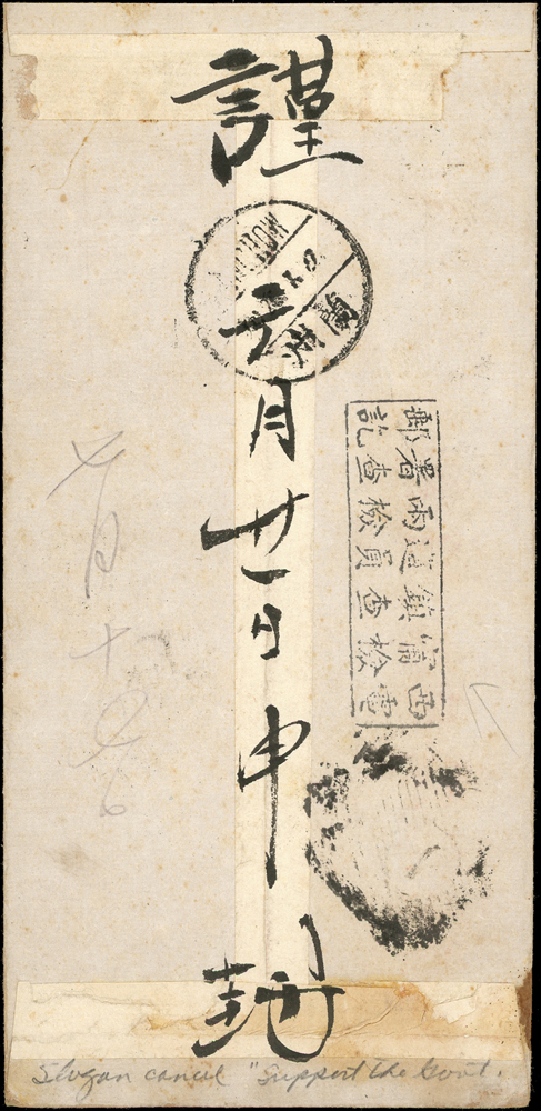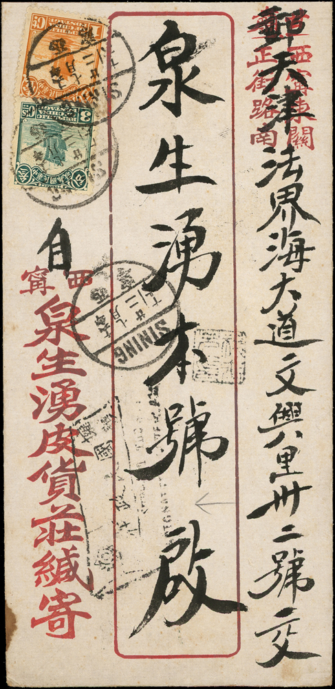 西北軍檢查封:1927年西甯寄天津中式封,貼北京二版帆船3分及3分各1枚,銷西寧十六年七月卄二,經蘭州中轉,正面另銷國旗型『擁護國民政府』中英文宣傳戳,背面銷『西甯鎮X兩署郵電檢查員檢查訖』檢查戳(Page 45)