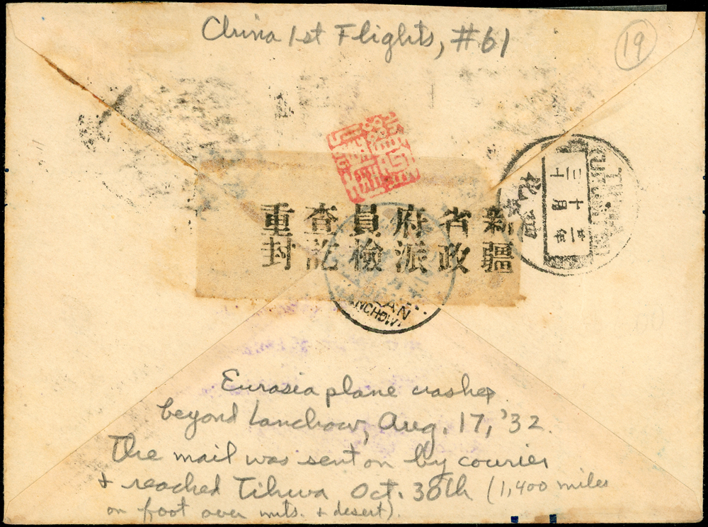 新疆第二次試航空難封:1932年蘭州寄新疆航空西式封,貼北京二版帆船4分及5分各一枚,北京二版航空3角各1枚,銷皋蘭(蘭州)卄一年八月十七戳,背貼新疆省政府派員檢查訖重封封條銷印,旁銷迪化卄一年十月三十到達腰框戳(Page 45) 註:此封於1932年8月17日由蘭州寄出,10月30日到達迪化;此為第一次至新疆郵件上貼有航空郵票,不幸於途中遭遇空難,之後由經陸路遞送至迪化;符合新疆省與其他各省互寄信函費9分,航空費30分,共計39分