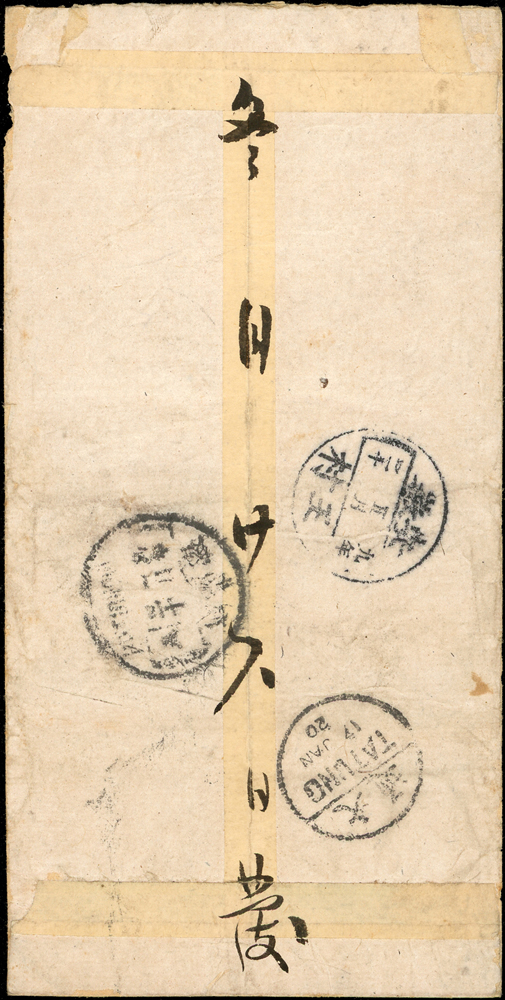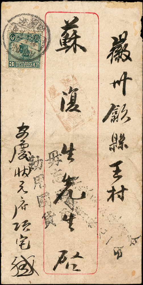 1920年安慶寄徽州中式封,貼北京一版帆船3分1枚,銷安慶府九年五月十六,旁另銷紅色『安慶』信櫃戳,經大通17.JAN.20漢英小圓戳,徽州府九年五月二十,安徽王村九年五月二十到戳,正面另銷『毋忘國恥/勤用國貨』及『安慶至江蘇省各地匯費每元一分』宣傳戳(Page 47)