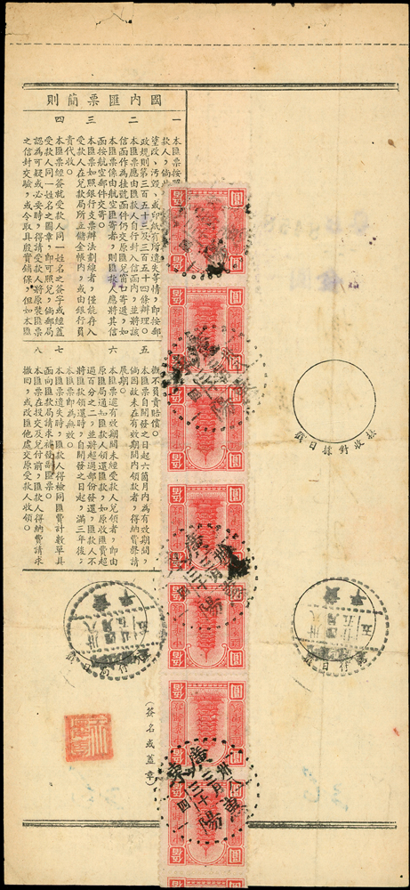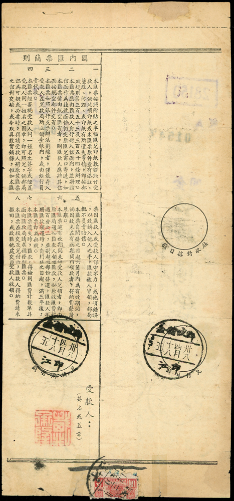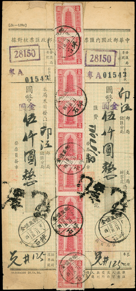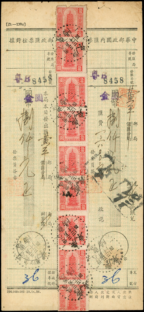 中華郵政匯票國幣改金元匯票二件:(1)貼匯兌印紙5000元,發匯局銷郵政儲金/坪石/卅八.三月卄五,兌付局銷郵政儲金/印江//卅八.四月十八;(2)貼匯兌印紙8000元,發匯局銷廣東惠陽//卅八.三月三十,兌付局銷郵政儲金/黃平//卅八.四月卄五(Page 48)