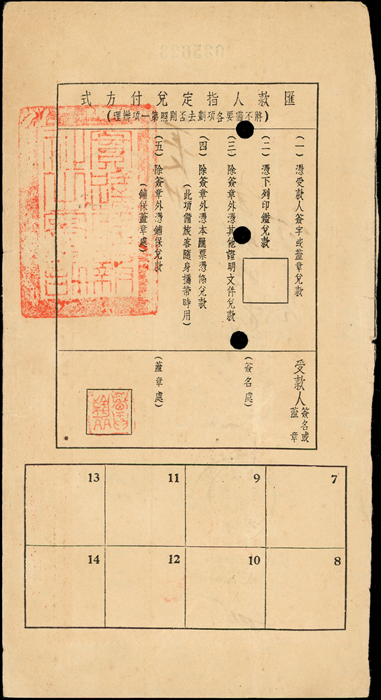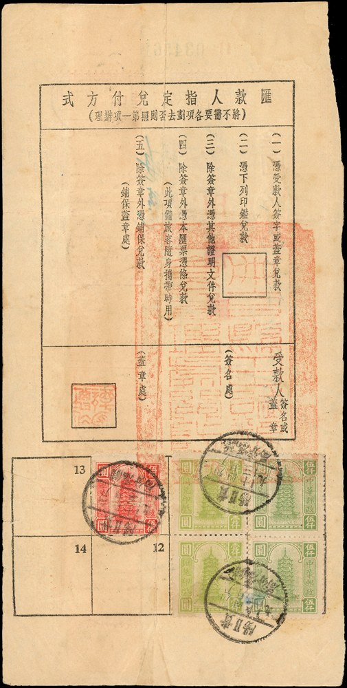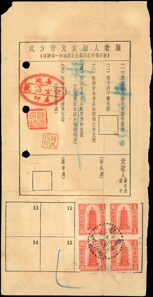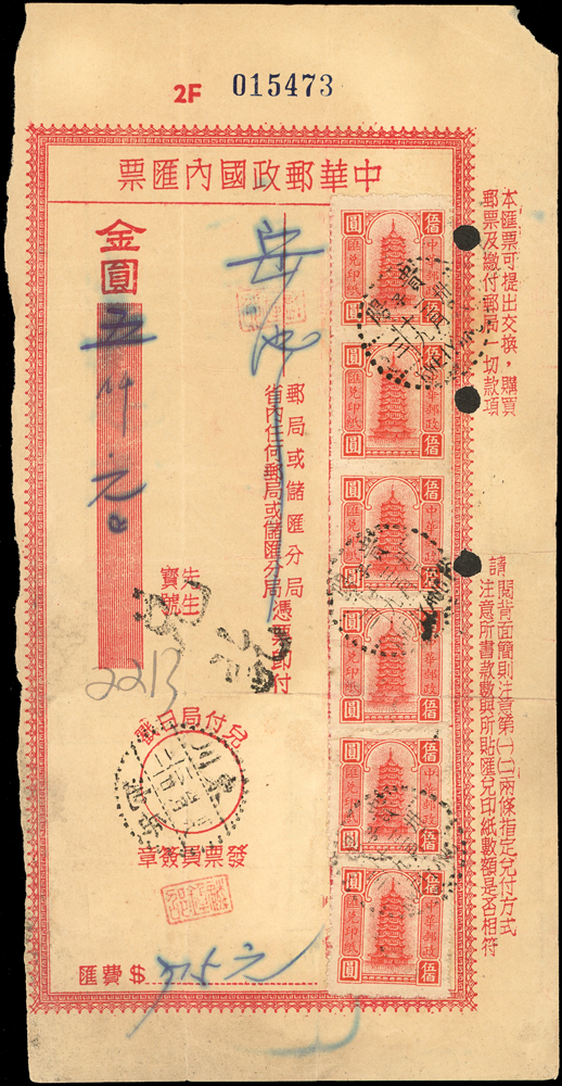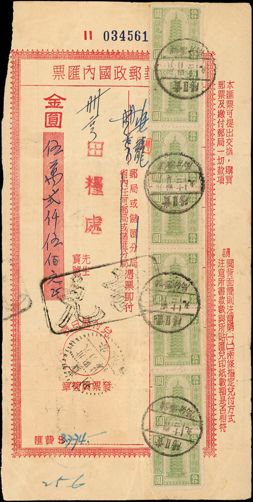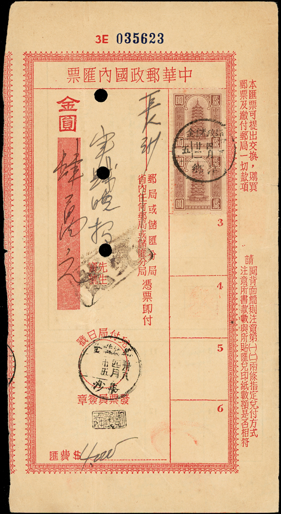 中華郵政金元匯票三件:(1)貼匯兌印紙4萬元,發匯局銷郵政儲金/X鄉/卅八.四月卄二,兌付局銷卅八.四月卄五;(2)貼匯兌印紙5000元,發匯局銷貴陽卅八.三月十九,兌付局銷東川岳池卅八.四月二日;(3)貼匯兌印紙52500元,發匯局銷貴陽/儲金分局/卅八.四月十三,兌付局銷貴州安龍卅八.四月卄七(Page 48)