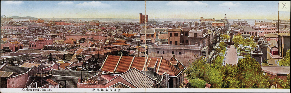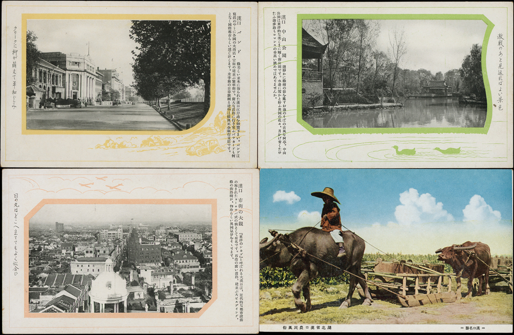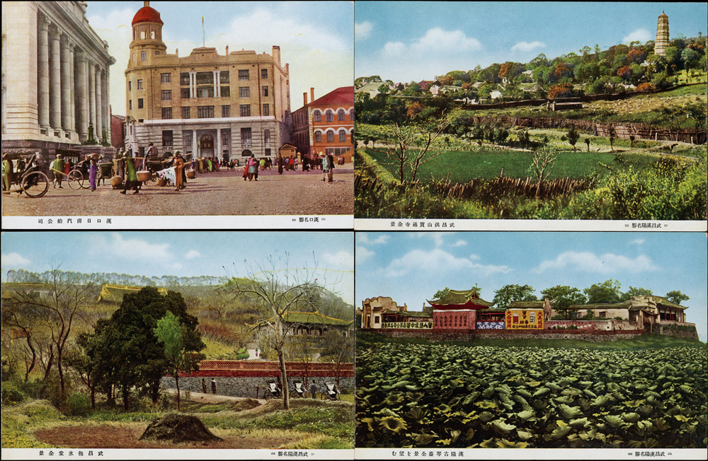 漢口風景片8片,含:漢口市街江漢路雙聯片(僅存1/4相連),漢口日清汽船公司,漢陽古琴台全景,武昌洪山寶通寺全景,武昌抱氷堂全景.湖北省漢口農民風俗,正金銀行漢口支店,大漢口近代都市設備,漢口中山公園,(Page 50)