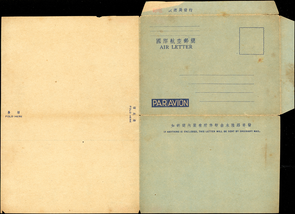 林目#國際3(I3).國際航空郵簡三版(申三版)新簡,交通部改『郵電』多重變體一件:(1)左上角底紋隔物漏印變體;(2)因折紙印刷『交通部郵政總局發行」字樣局部漏印變體;非常罕見;林昌龍舊藏(Page 50)