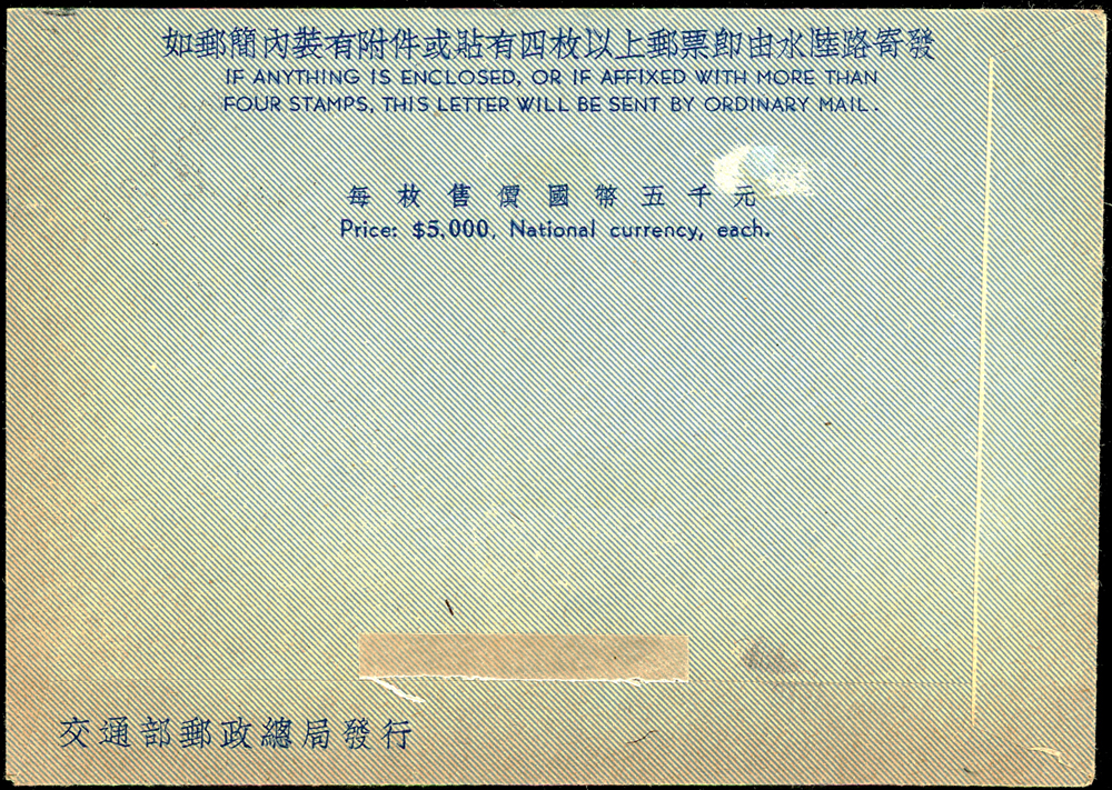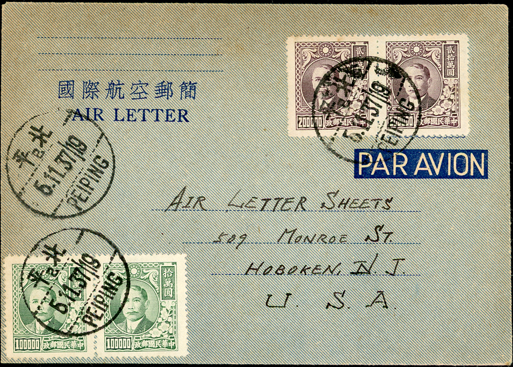 韓目#2.國際航空郵簡自北平寄美國,貼國父像上海大東三版20萬4枚,計600000元,銷北平5.11.37;符合1948.8.21-11.5國際航空郵簡郵資,調資尾日使用,11月6日起按金元7角收費(Page 51)