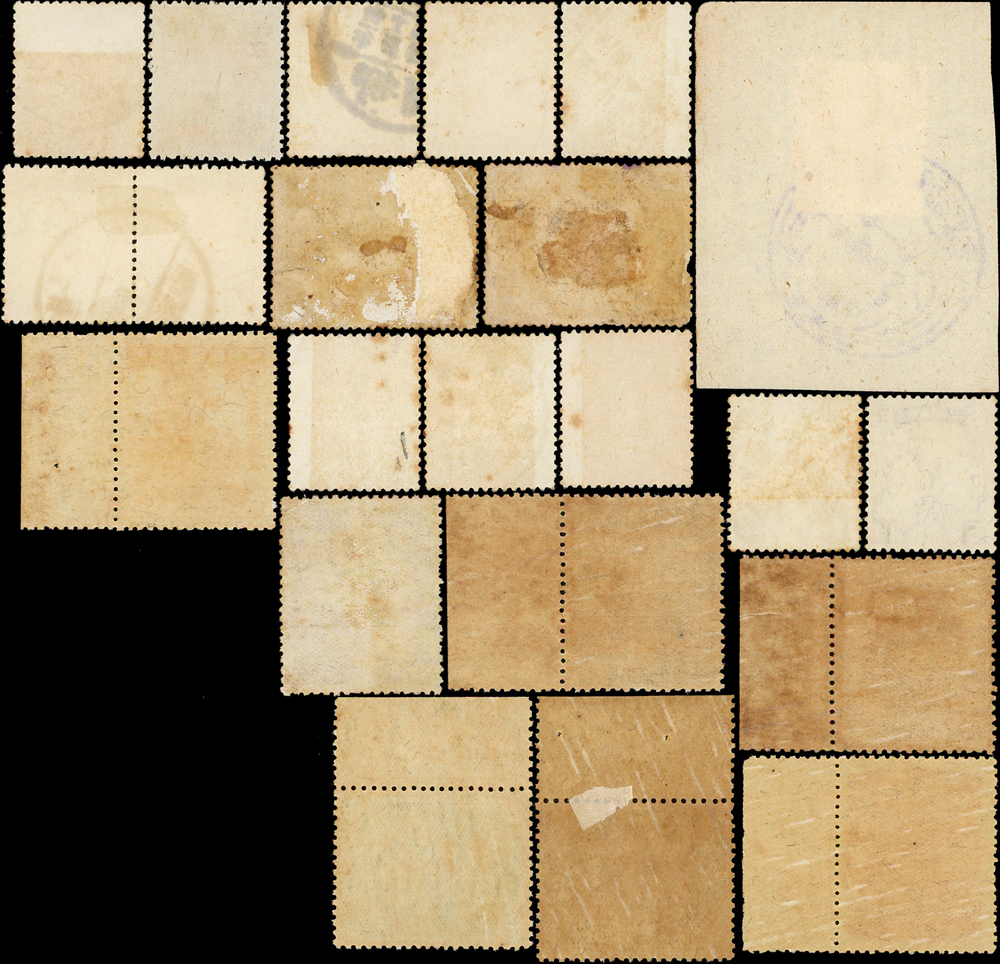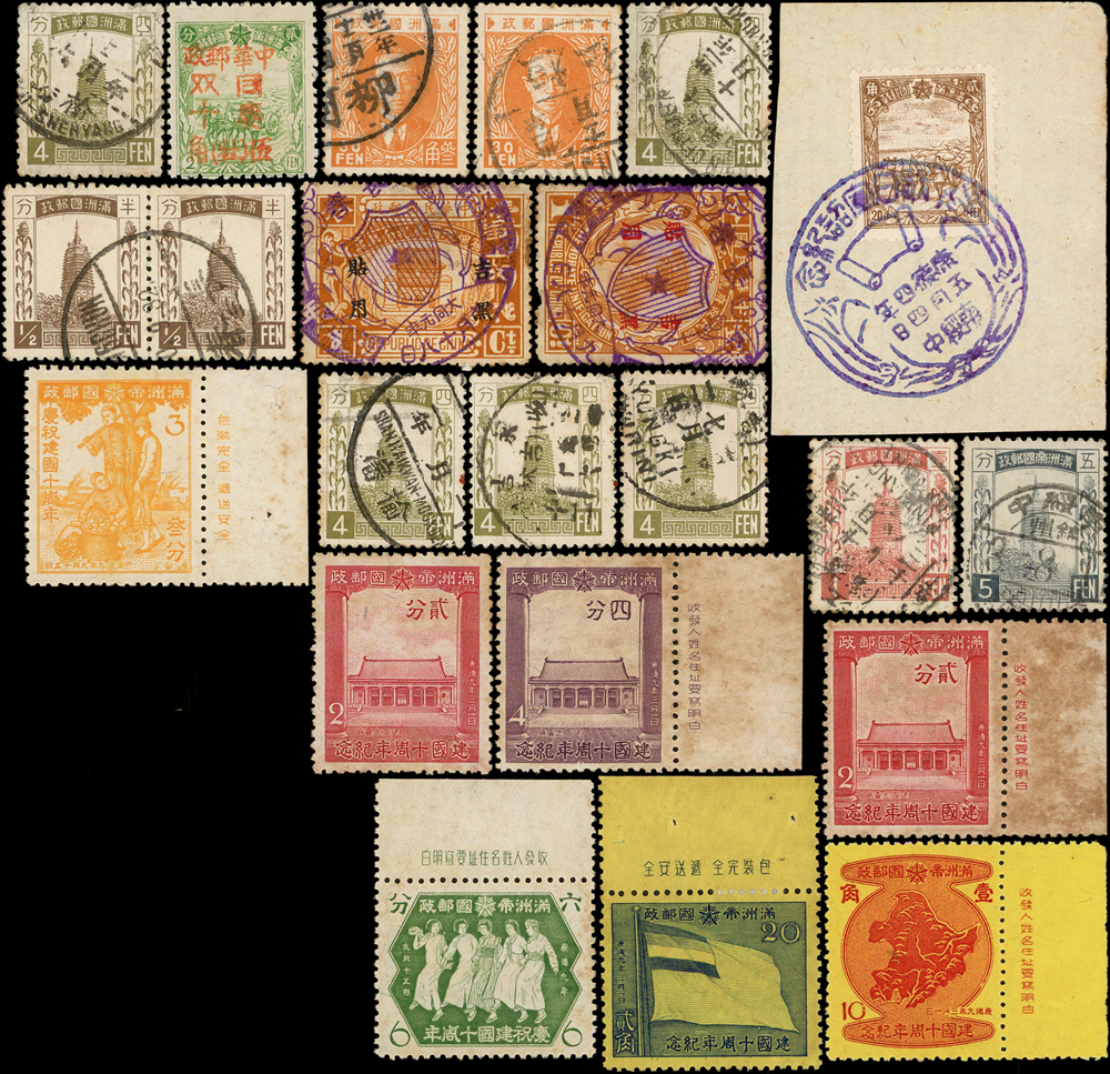 滿洲國新票8枚及舊票14枚,共22枚,含:(1)建國10周年6全帶廠銘新票,其中2分多出1枚,原膠泛黃品次;(2)牡丹地方加蓋國慶紀念1全新票;(3)14枚舊票均見地名,含火車戳,紀念戳,VF-F(Page 51)