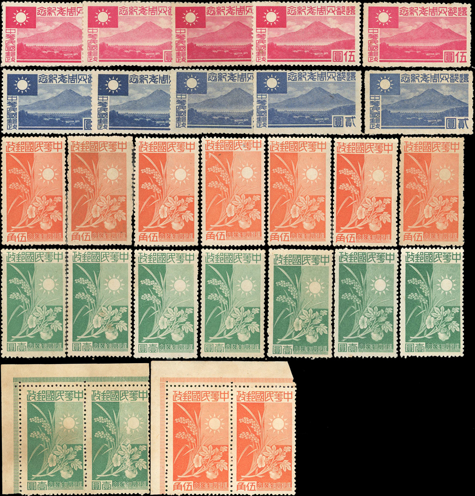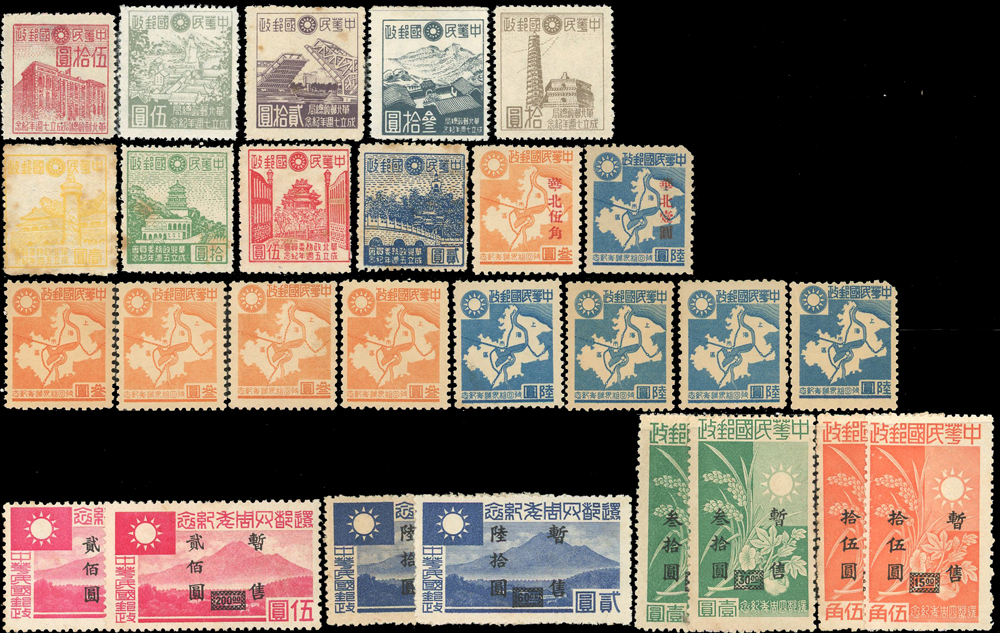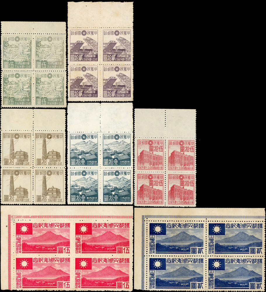 偽政府郵票19套,均為新票,包括:還都四週年紀念9套,還都四週年改值2套,偽華北郵政成立七週年4方連,上海收回租界一年.偽華北交還租界一週年.偽華北政委會五週年.偽華北郵政成立七週年各1套,品像混合,部分輕貼,F-VF,歡迎至官網瀏覽全貌