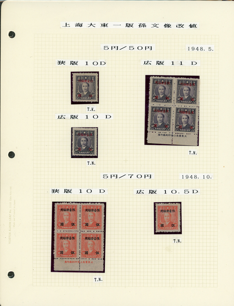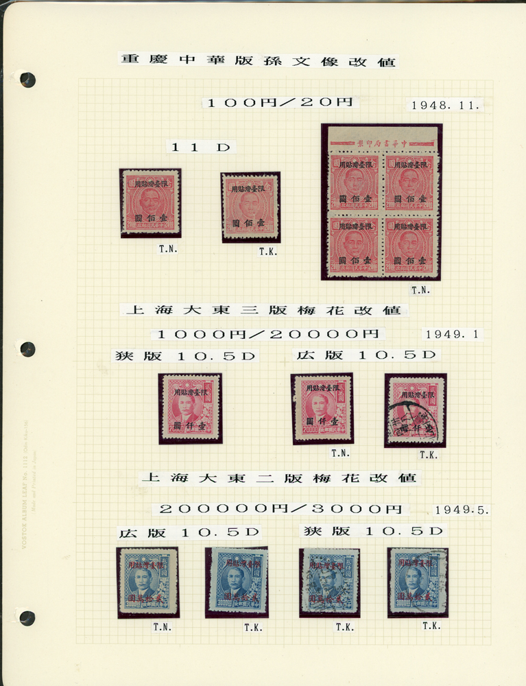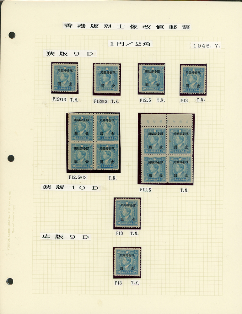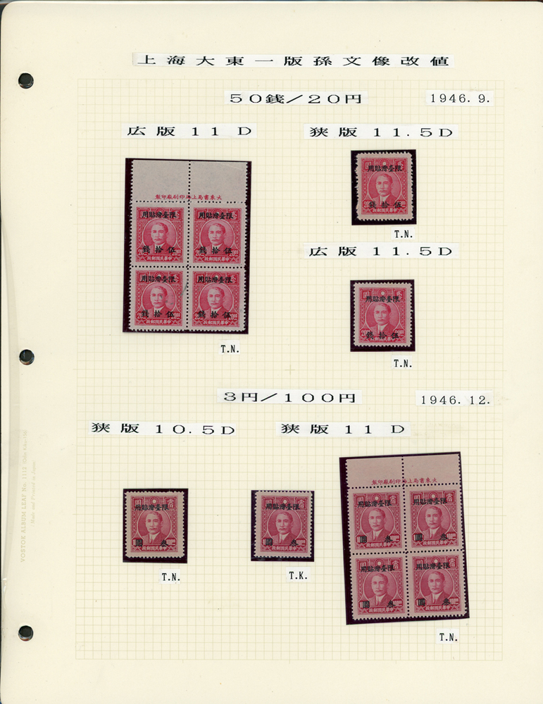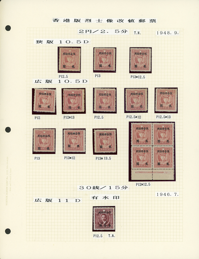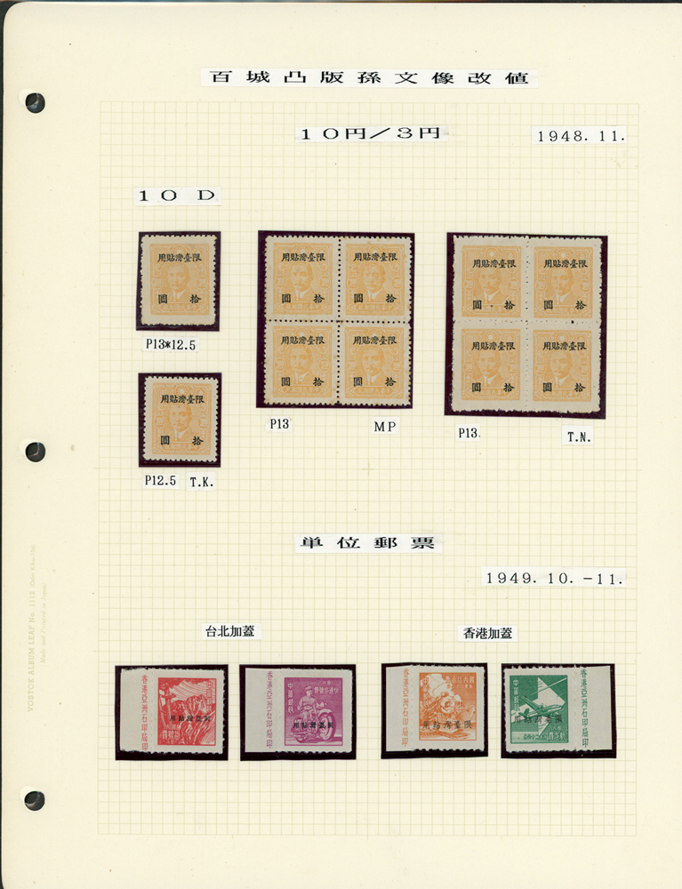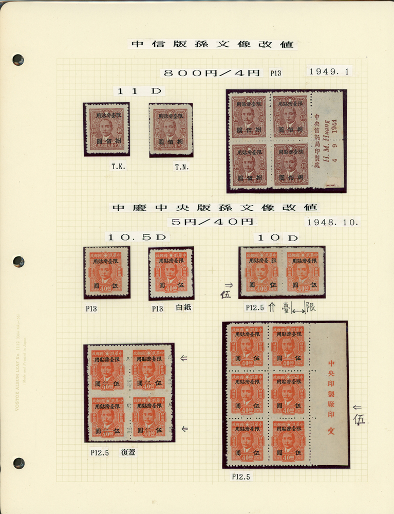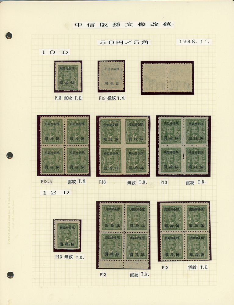 老台幣新舊票收藏輯一冊24個貼頁共470枚,自普台2至普台13加蓋版式,齒度,紙張以及加蓋破版等小變體,重點票有:烈士15分加蓋參拾錢有水印組外品新票1枚;普台10加蓋貳拾萬元關鍵票新舊各2枚;以上VF-F,源自日本資深藏家(Page 53)