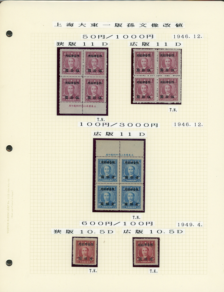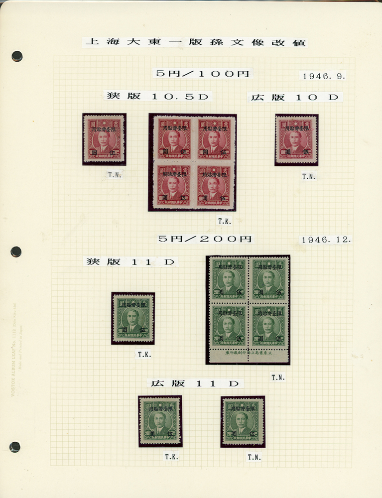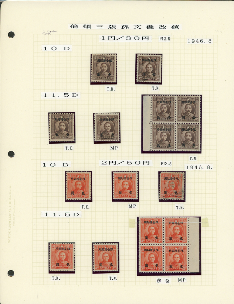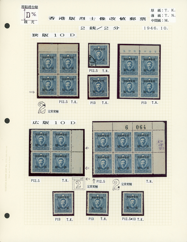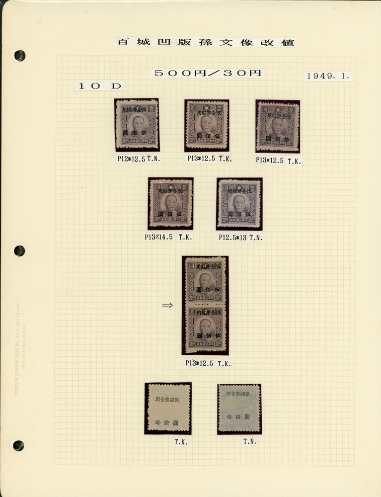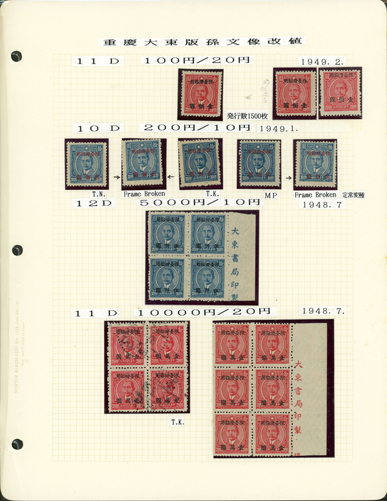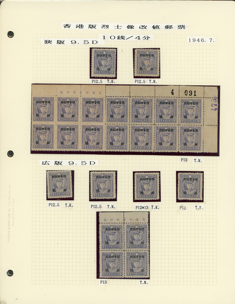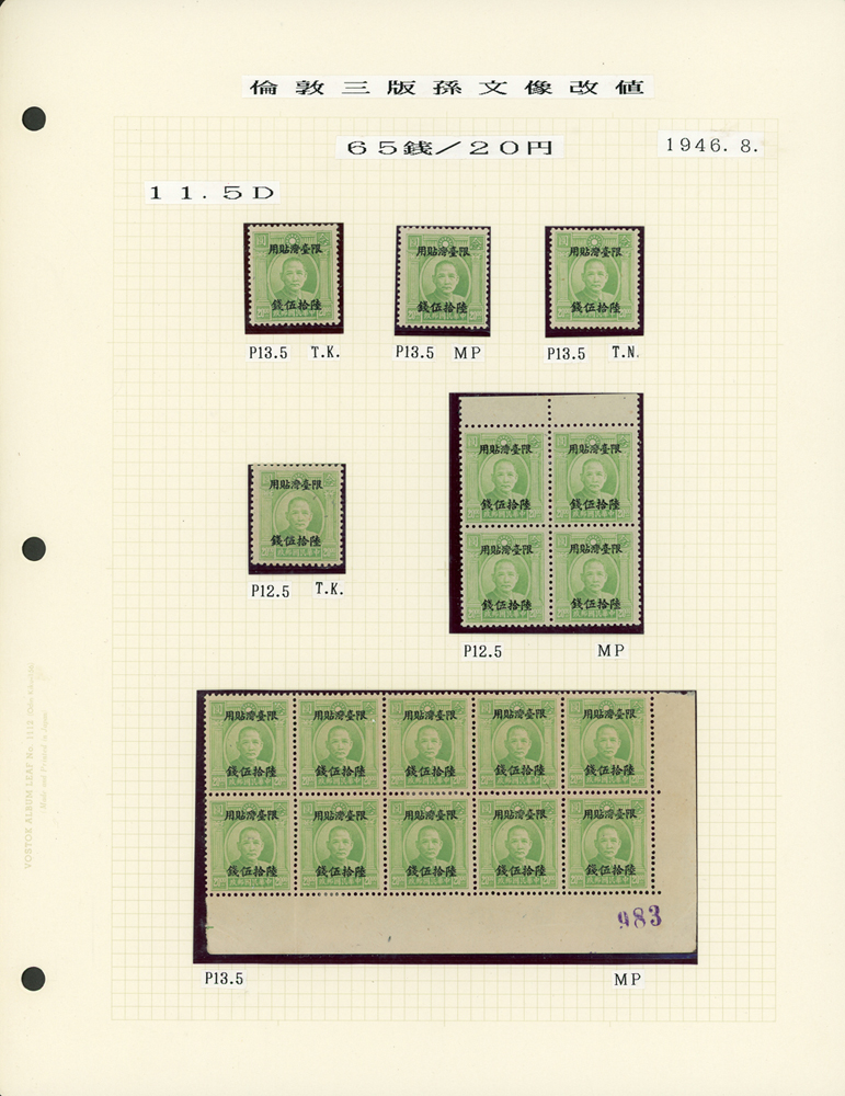 老台幣新舊票收藏輯一冊24個貼頁共470枚,自普台2至普台13加蓋版式,齒度,紙張以及加蓋破版等小變體,重點票有:烈士15分加蓋參拾錢有水印組外品新票1枚;普台10加蓋貳拾萬元關鍵票新舊各2枚;以上VF-F,源自日本資深藏家(Page 53)