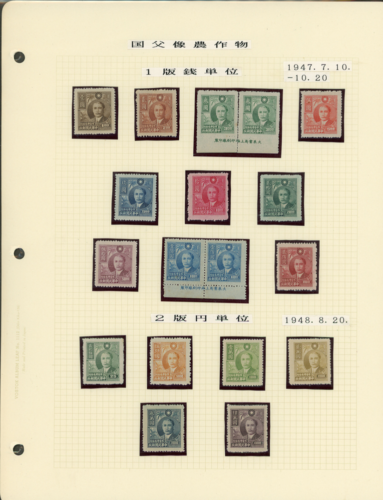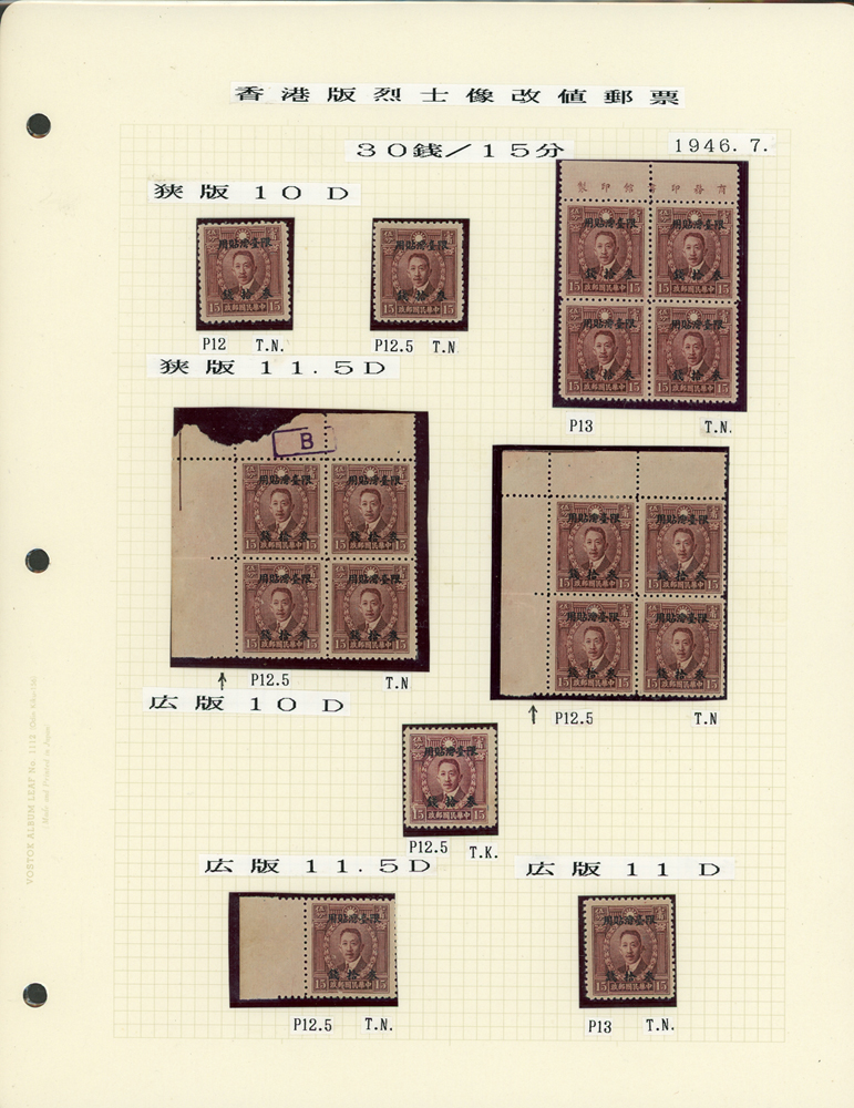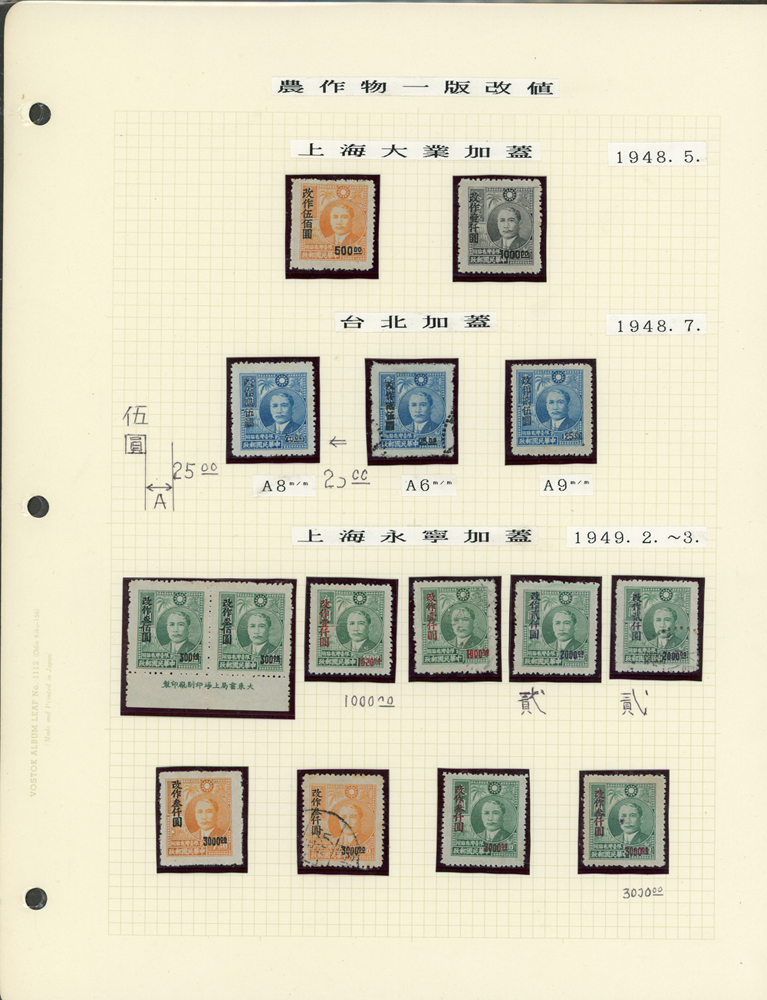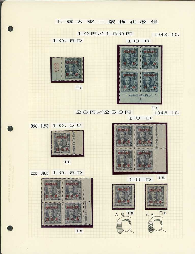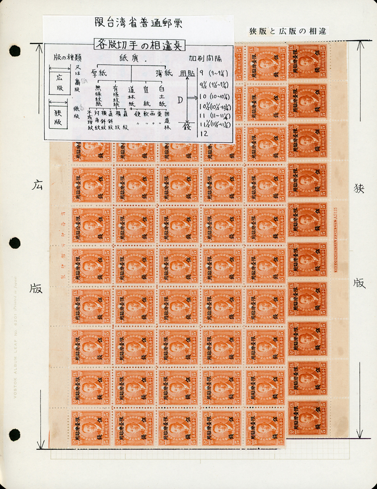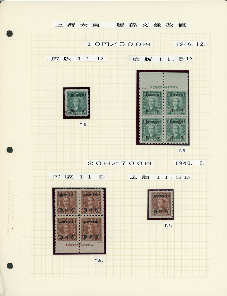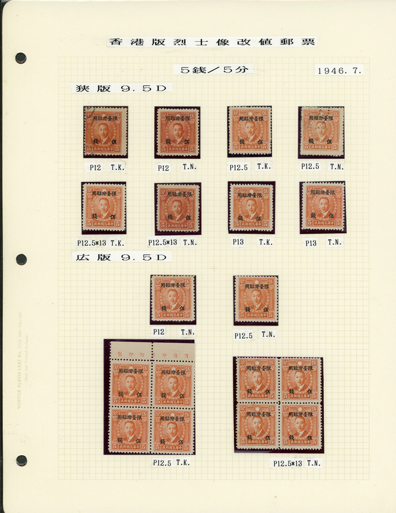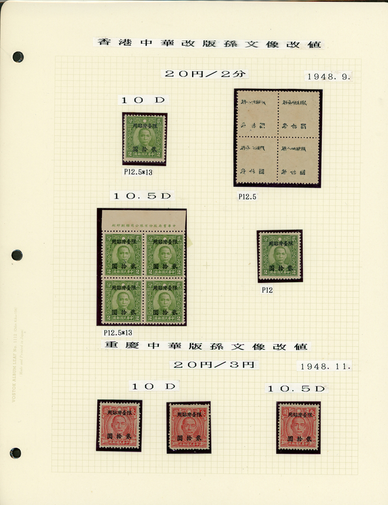 老台幣新舊票收藏輯一冊24個貼頁共470枚,自普台2至普台13加蓋版式,齒度,紙張以及加蓋破版等小變體,重點票有:烈士15分加蓋參拾錢有水印組外品新票1枚;普台10加蓋貳拾萬元關鍵票新舊各2枚;以上VF-F,源自日本資深藏家(Page 53)