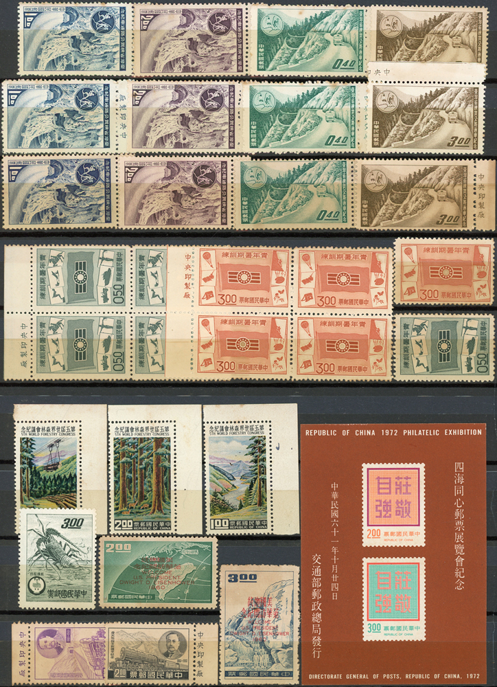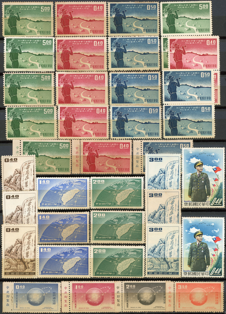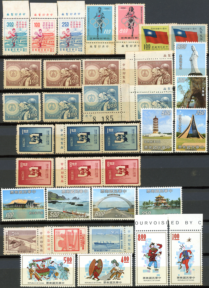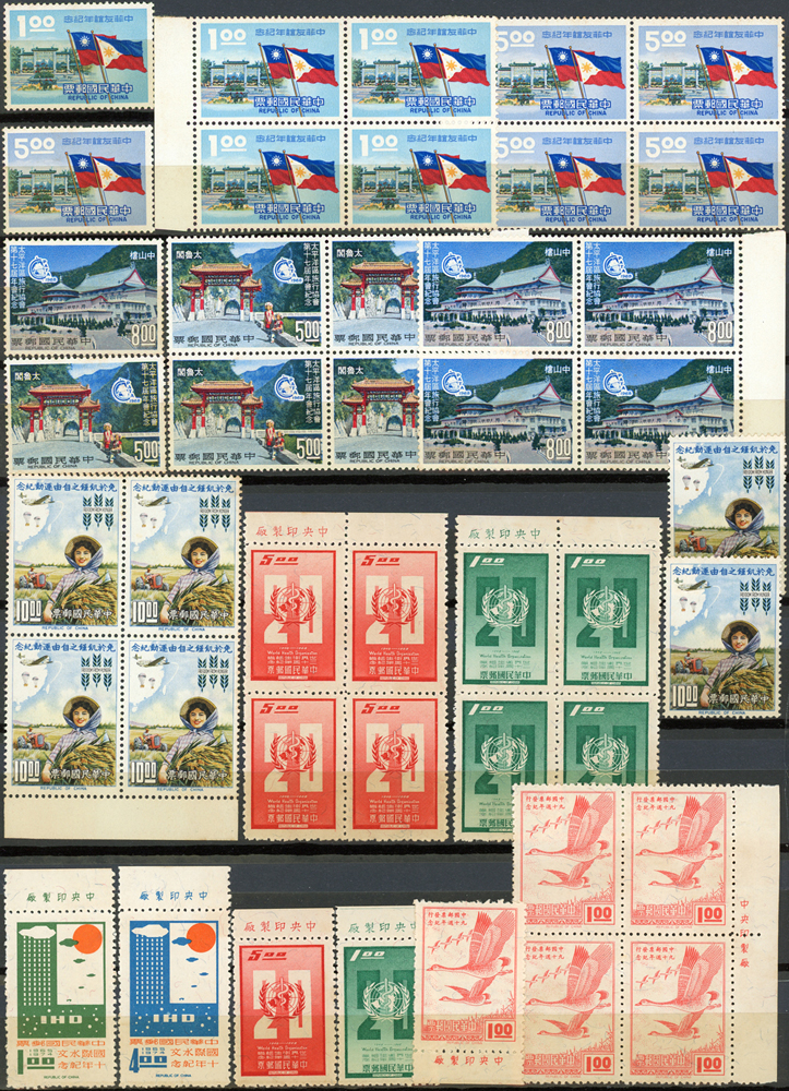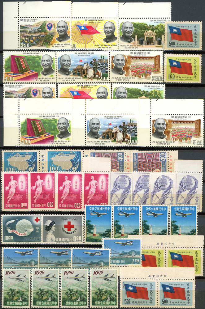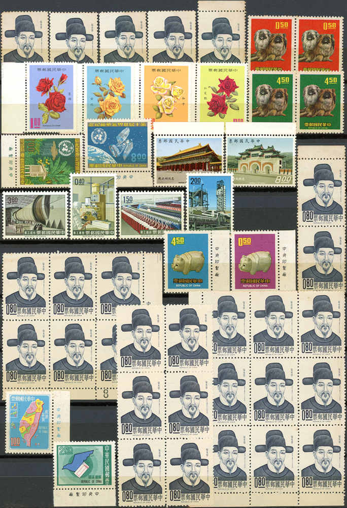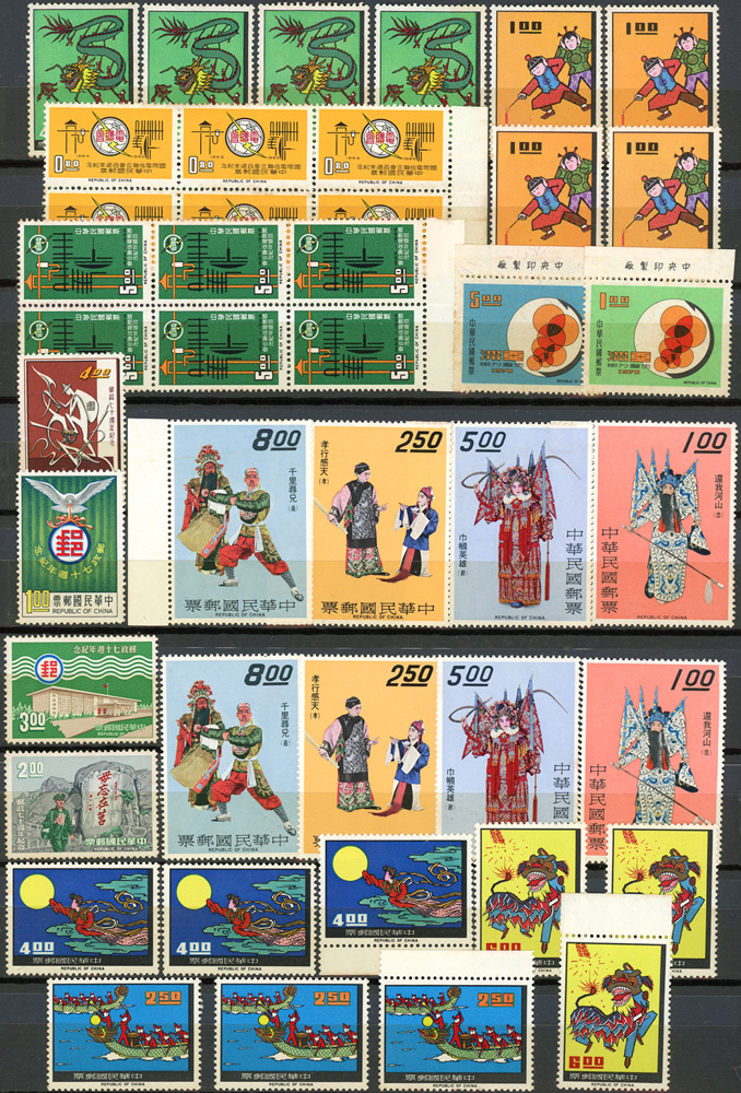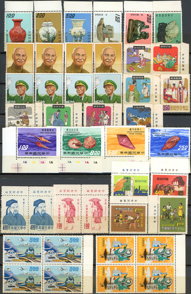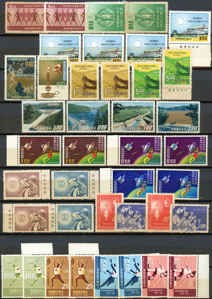 台灣1945~1975年新票730套,四海同心小全張2枚,均整理整齊於集郵冊中,新票包括有:中華民國臺灣省暫用郵票.國父像倫敦三版限臺灣貼用改值.國民大會限臺灣貼用.國民政府還都臺灣貼用.國父像農作物二版限臺灣貼用.國父像中華版限臺灣貼用改值.國父像華南版改值.兒童節.聯合國十週年.電信75週年紀念.鐵路75週年.民俗(54.55.62年版).軍人節.雷虎特技航空.花卉(53年版).中國農村復興聯合委員會十週年.世界人權宣言十週年.行憲十週年.臺灣省橫貫路通車紀念.體育(49年版).第五屆世界森林會議.國父百年誕辰紀念.石門水庫.亞洋郵盟週年.郵政七十週年.第四任總統就職週年.第三任總統就職週年.原子爐落成紀念.中菲友誼年.蔣公勳業.航空(52年版).第十九屆世界運動會.古物(59年版).清瓷.明瓷等等,品種豐富品像混合,或有重複,VF-F,歡迎至官網瀏覽全貌