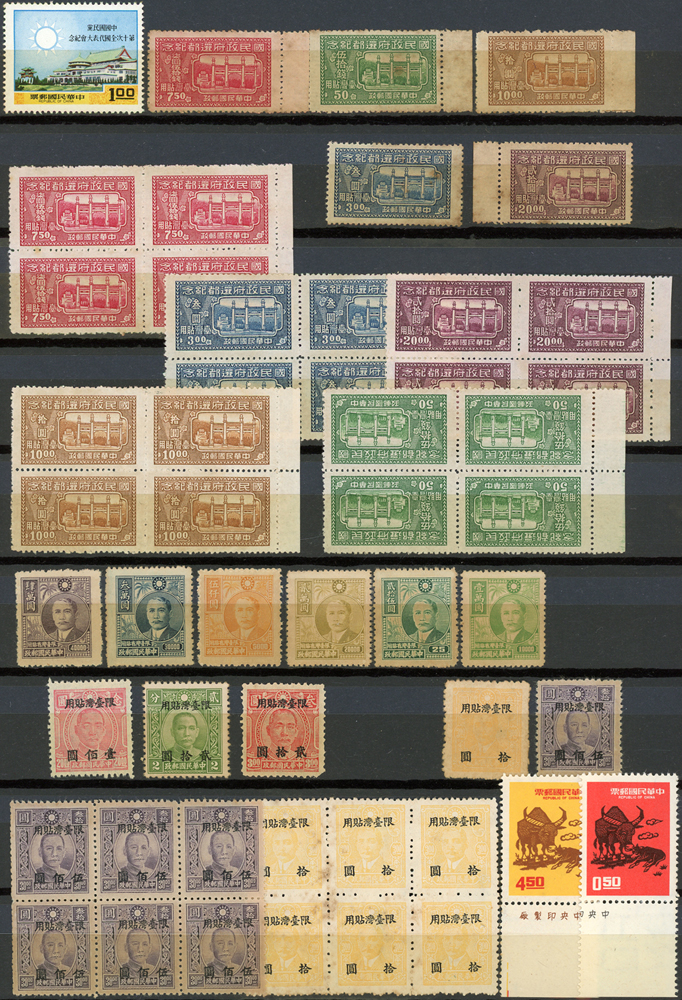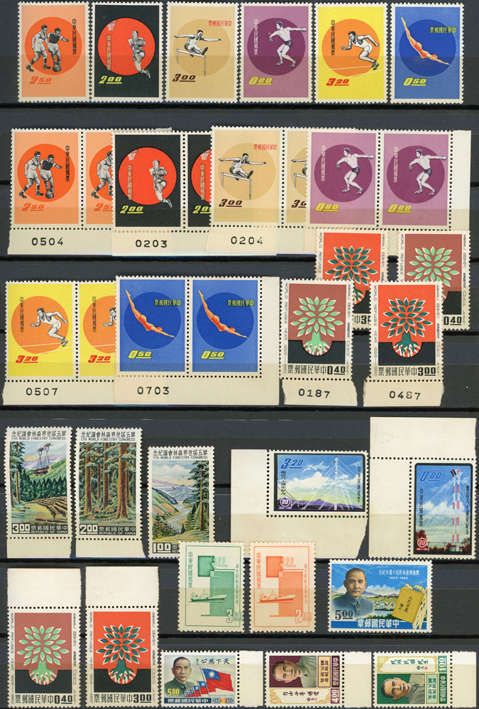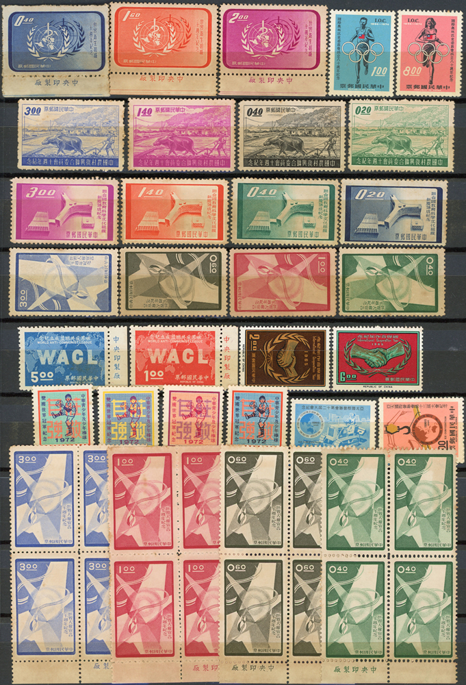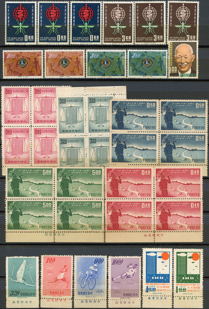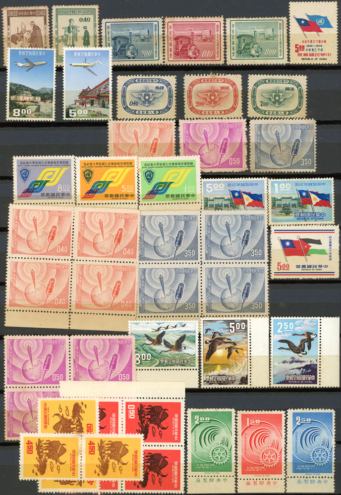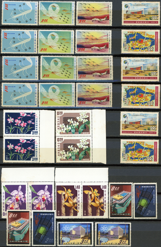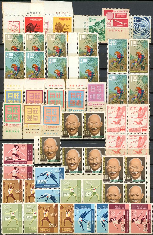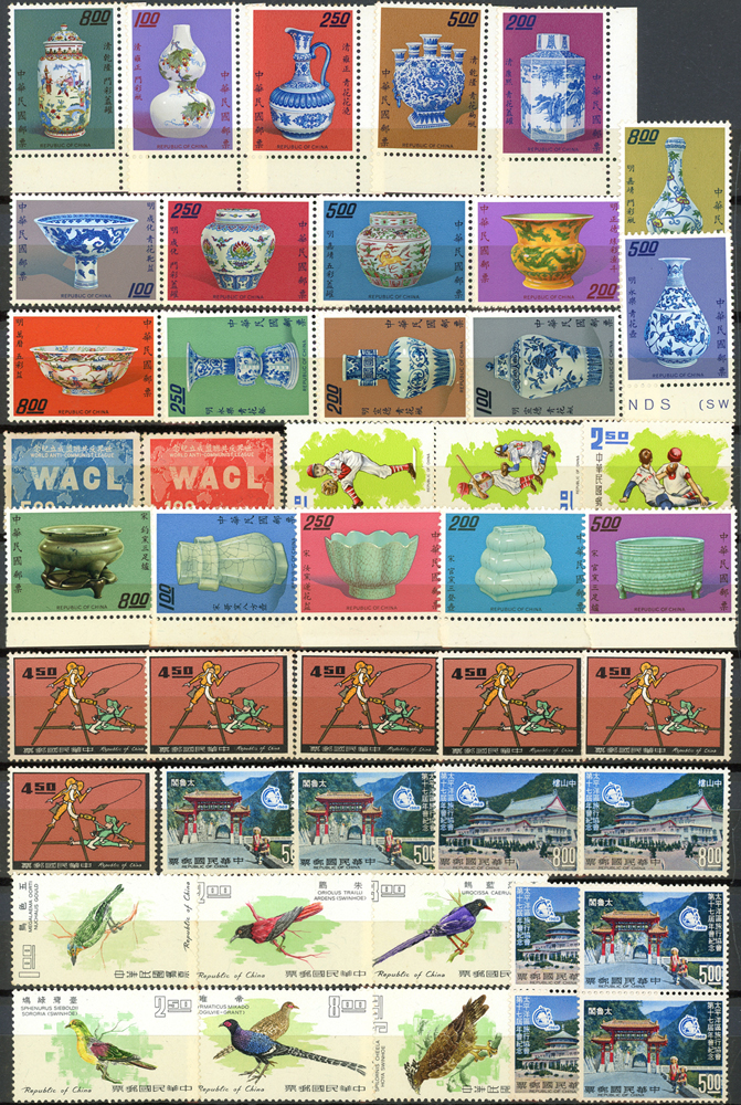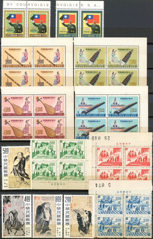 台灣1945~1975年新票730套,四海同心小全張2枚,均整理整齊於集郵冊中,新票包括有:中華民國臺灣省暫用郵票.國父像倫敦三版限臺灣貼用改值.國民大會限臺灣貼用.國民政府還都臺灣貼用.國父像農作物二版限臺灣貼用.國父像中華版限臺灣貼用改值.國父像華南版改值.兒童節.聯合國十週年.電信75週年紀念.鐵路75週年.民俗(54.55.62年版).軍人節.雷虎特技航空.花卉(53年版).中國農村復興聯合委員會十週年.世界人權宣言十週年.行憲十週年.臺灣省橫貫路通車紀念.體育(49年版).第五屆世界森林會議.國父百年誕辰紀念.石門水庫.亞洋郵盟週年.郵政七十週年.第四任總統就職週年.第三任總統就職週年.原子爐落成紀念.中菲友誼年.蔣公勳業.航空(52年版).第十九屆世界運動會.古物(59年版).清瓷.明瓷等等,品種豐富品像混合,或有重複,VF-F,歡迎至官網瀏覽全貌