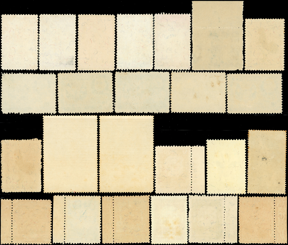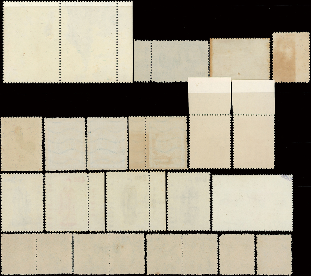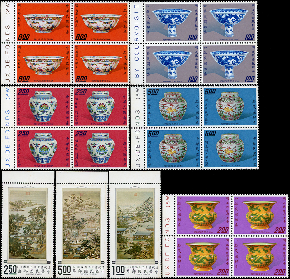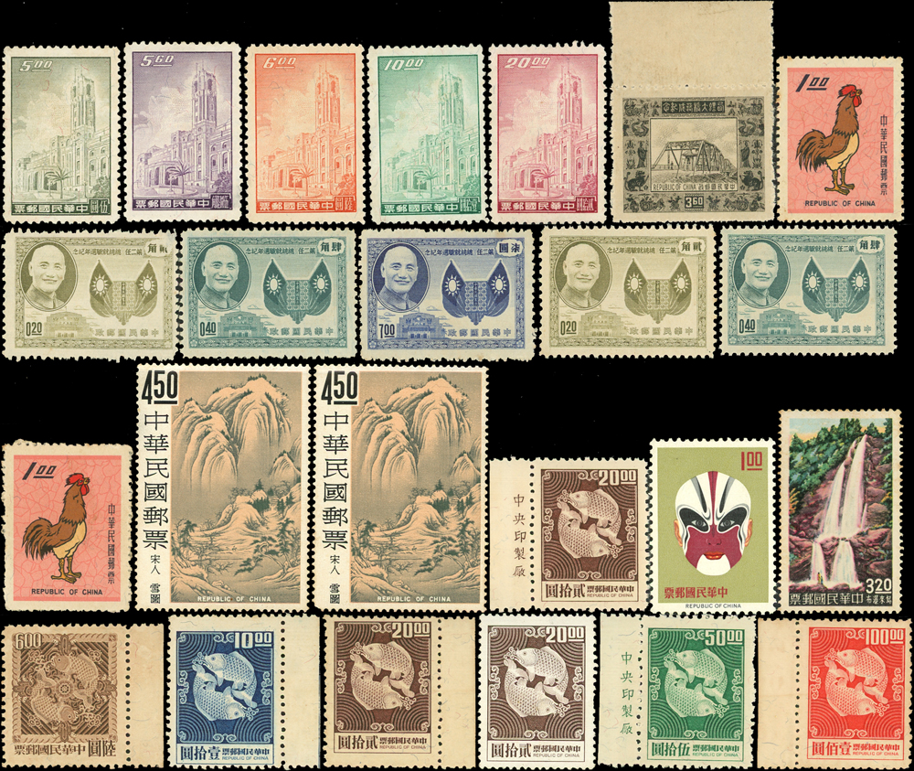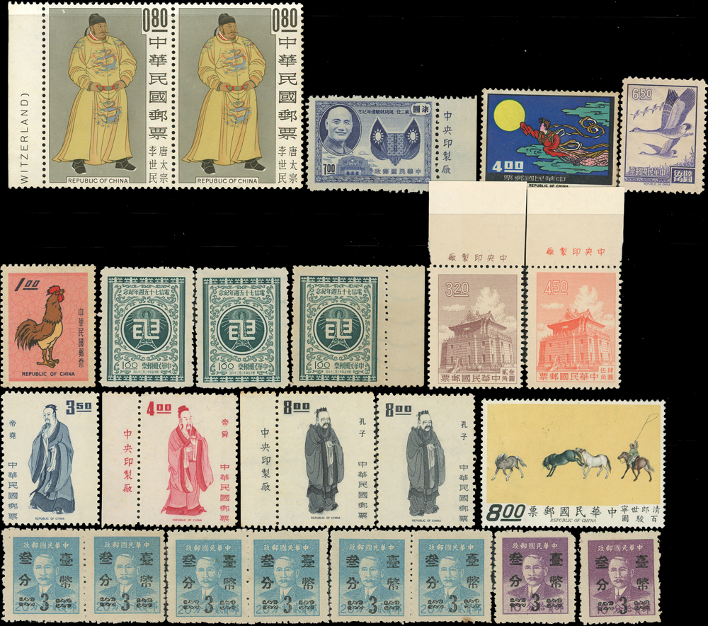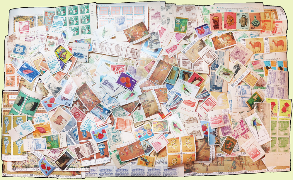 台灣中早期不成套新票約1000枚,重點包括有:單位資費改面值2角方連.3分9方連,總統府纖維紙5.6元.5元.6元.10元.20元各1枚,帝王8角雙連(無膠),故宮古畫(一)1.6元方連,國父像華南版改值,明瓷,清明上河圖連刷票,百駿圖連刷票,出警圖連刷票,第二任總統就職週年2角.4角.7元各1枚,一輪鼠5角,故宮古物(57.58.59年版),臺灣鳥類(56年版無膠),西螺大橋3.6元1枚,電信七十五週年1.6元.1.4元,百子圖(連刷撕開),一輪雞1元1枚,十二月令圖,臺灣水果1元,一版鯉魚6元1枚,二版鯉魚100元.50元.20元.10元各1枚,十駿犬.台灣花卉(47年版),故宮古畫(三)4.5元,莊敬自強1角20方連8組,一版中山樓5分.1角.1.5元.2元.3元8方連各2組等,品種豐富品像混合,或有重複,配票好用,F-VF,歡迎至官網瀏覽全貌(Page 54)