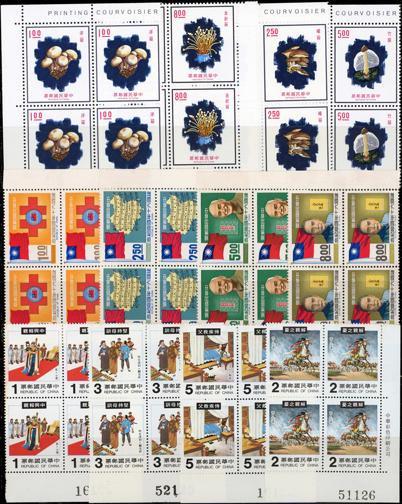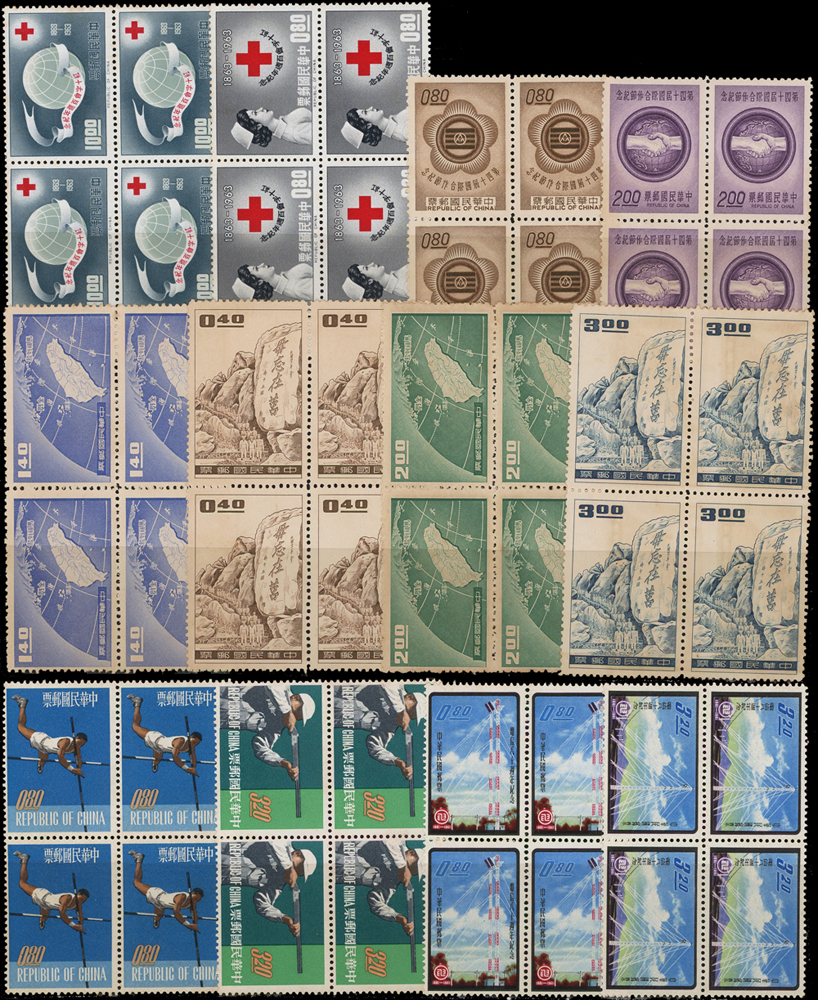 台灣中早期新票方連26組,共104套,重點內容有:雷虎特技航空.中華婦女反共抗俄聯合會十週年紀念.臺灣花卉(47年版).臺灣昆蟲(47年版).紅十字會百週年.電信八十週年.體育(51年版背銷紀戳).保衛金馬.第40屆國際合作節.曾文水庫.中國民間故事(59.60.67.69.71年版)等,品像混合,多數背黃,F-VF,歡迎至官網瀏覽全貌