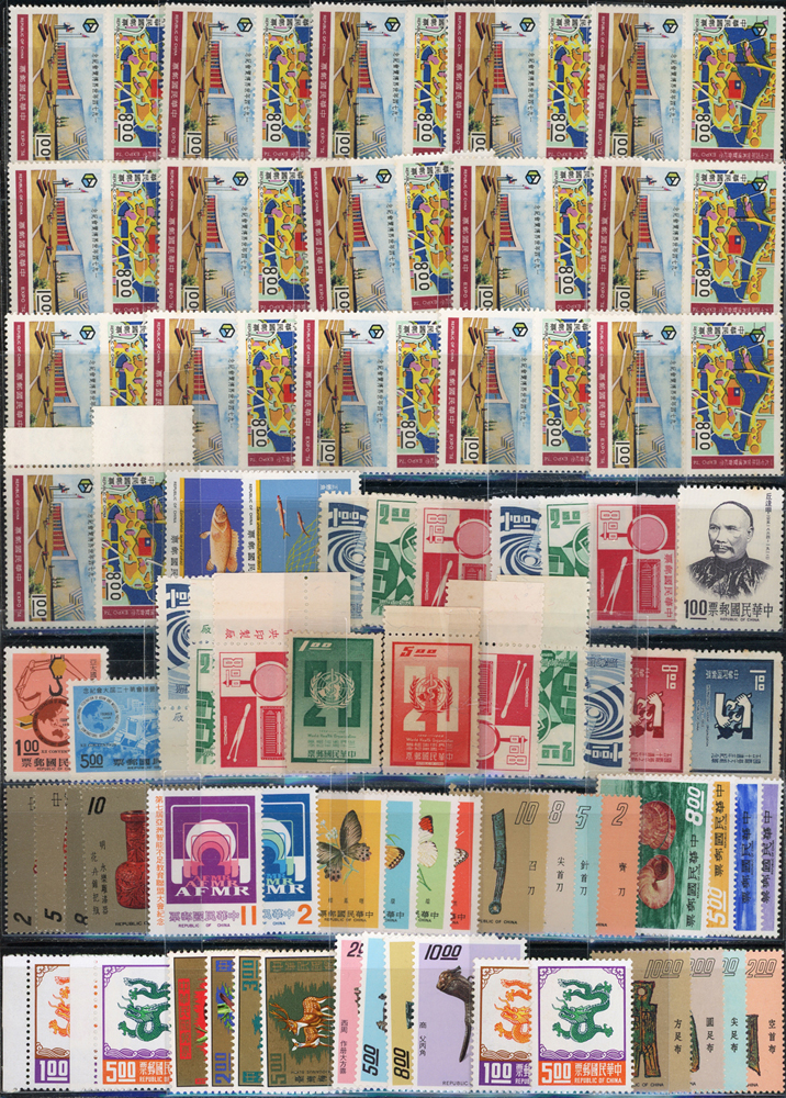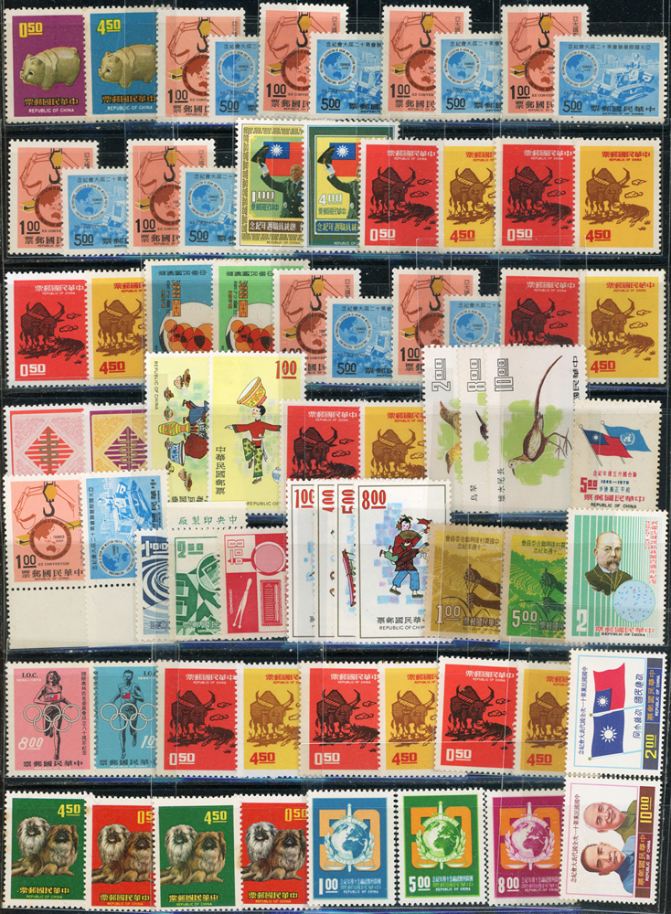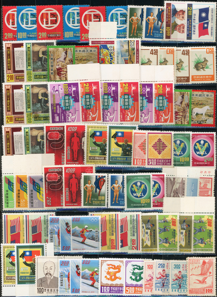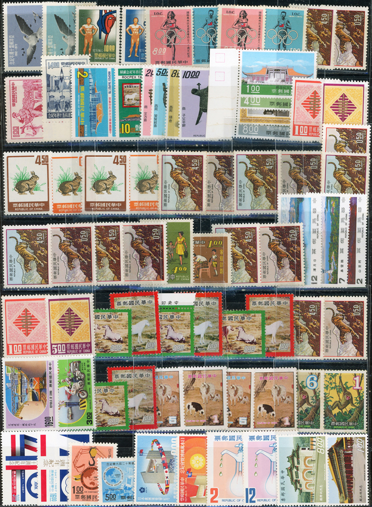 台灣中期新票318套,重點包括有:忠烈祠.世界難民年.古代銅器(64年版).古代錢幣(64.65年版).臺灣貝殼.臺灣獸類.國父紀念館.臺灣蝴蝶(66年版).古代雕漆器(67年版).臺灣手工藝產品(62.63年版).音樂(58.65.66年版).聯合國25週年.國際刑警組織50週年.集郵(61年版).民俗(62.63年版).臺灣鳥類(66年版).第五任總統就職週年.中非技術合作.一輪狗.豬.牛.虎.兔.龍.蛇.馬.羊.德基水庫.美國開國二百年.捐血救人.行憲30周年.國際獅子會成立60週年.1974年世界博覽會.家庭計畫.亞太國際營聯會第12屆大會等等,品種豐富品像混合,多重複,部分背淡黃,少數背貼痕或無膠,F-VF