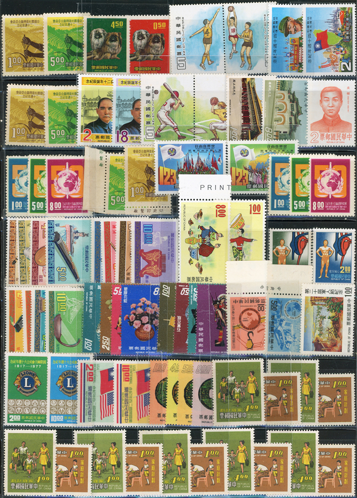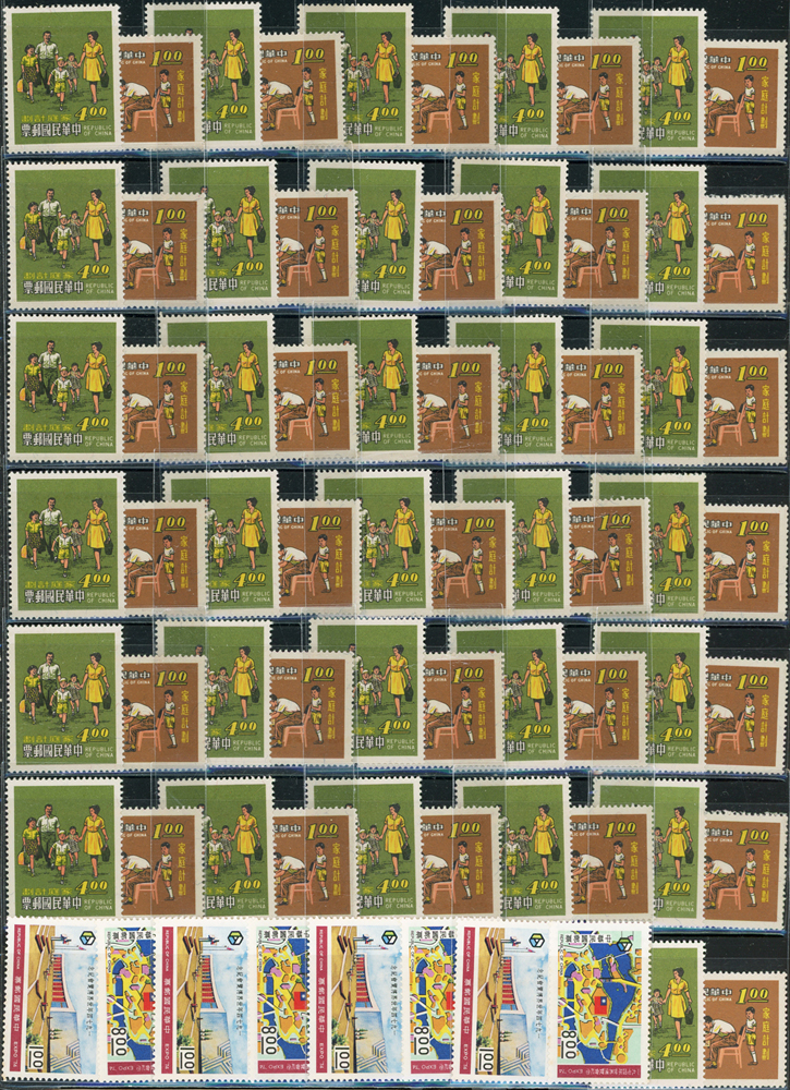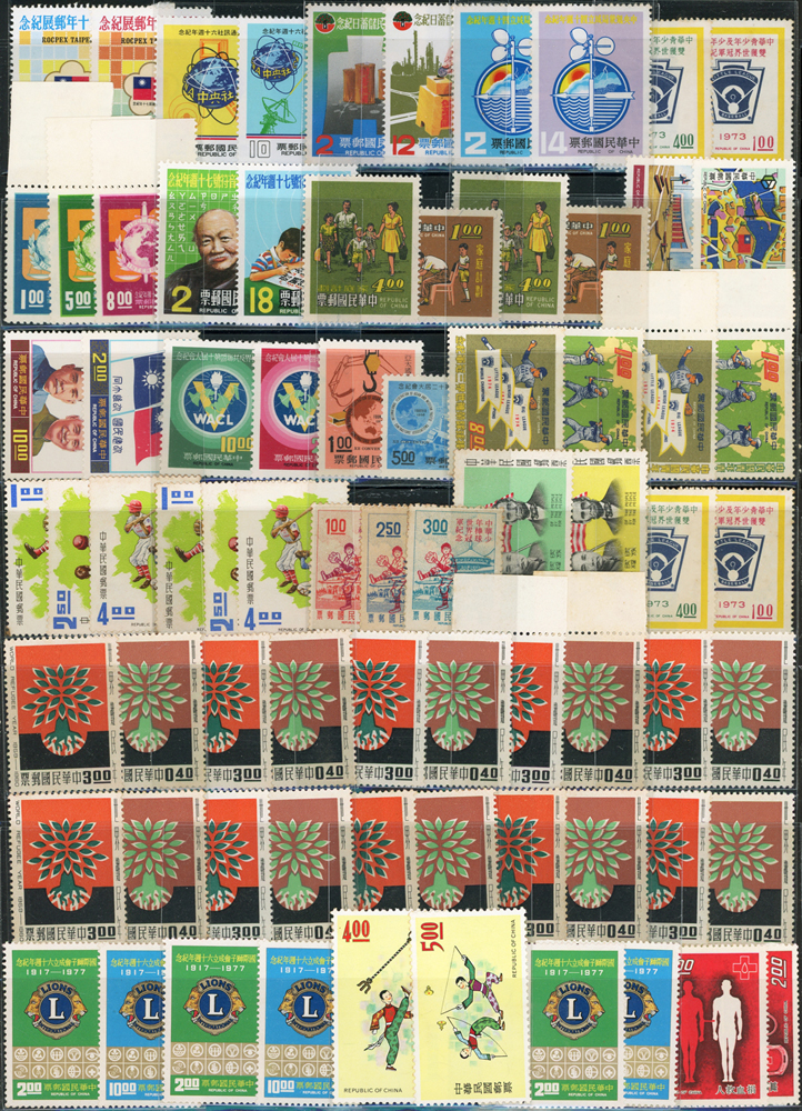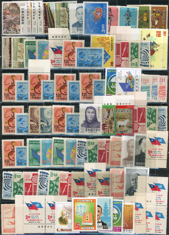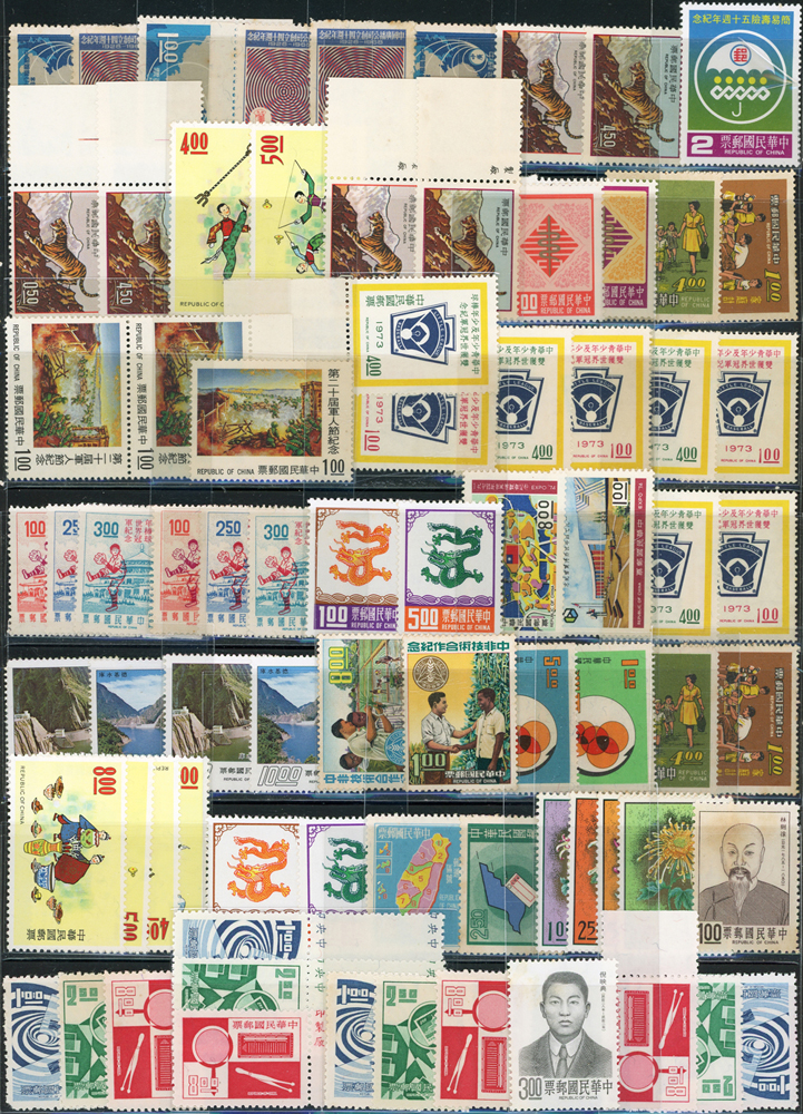 台灣中期新票318套,重點包括有:忠烈祠.世界難民年.古代銅器(64年版).古代錢幣(64.65年版).臺灣貝殼.臺灣獸類.國父紀念館.臺灣蝴蝶(66年版).古代雕漆器(67年版).臺灣手工藝產品(62.63年版).音樂(58.65.66年版).聯合國25週年.國際刑警組織50週年.集郵(61年版).民俗(62.63年版).臺灣鳥類(66年版).第五任總統就職週年.中非技術合作.一輪狗.豬.牛.虎.兔.龍.蛇.馬.羊.德基水庫.美國開國二百年.捐血救人.行憲30周年.國際獅子會成立60週年.1974年世界博覽會.家庭計畫.亞太國際營聯會第12屆大會等等,品種豐富品像混合,多重複,部分背淡黃,少數背貼痕或無膠,F-VF