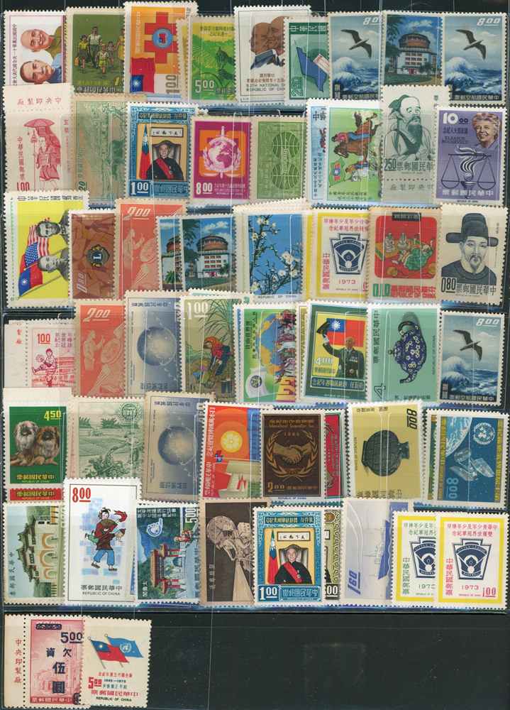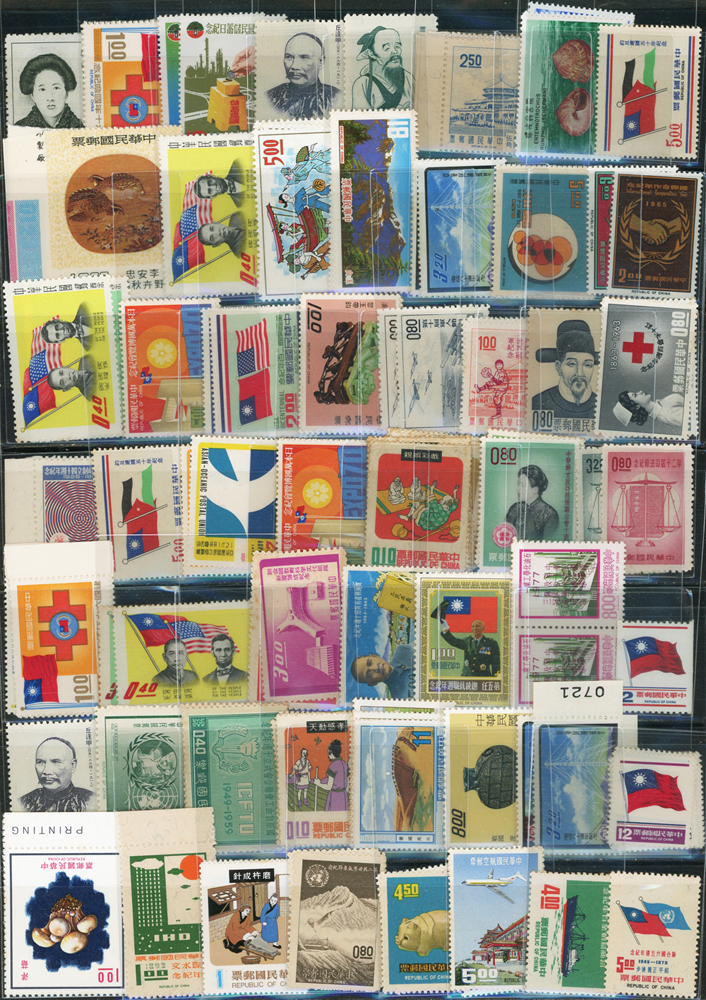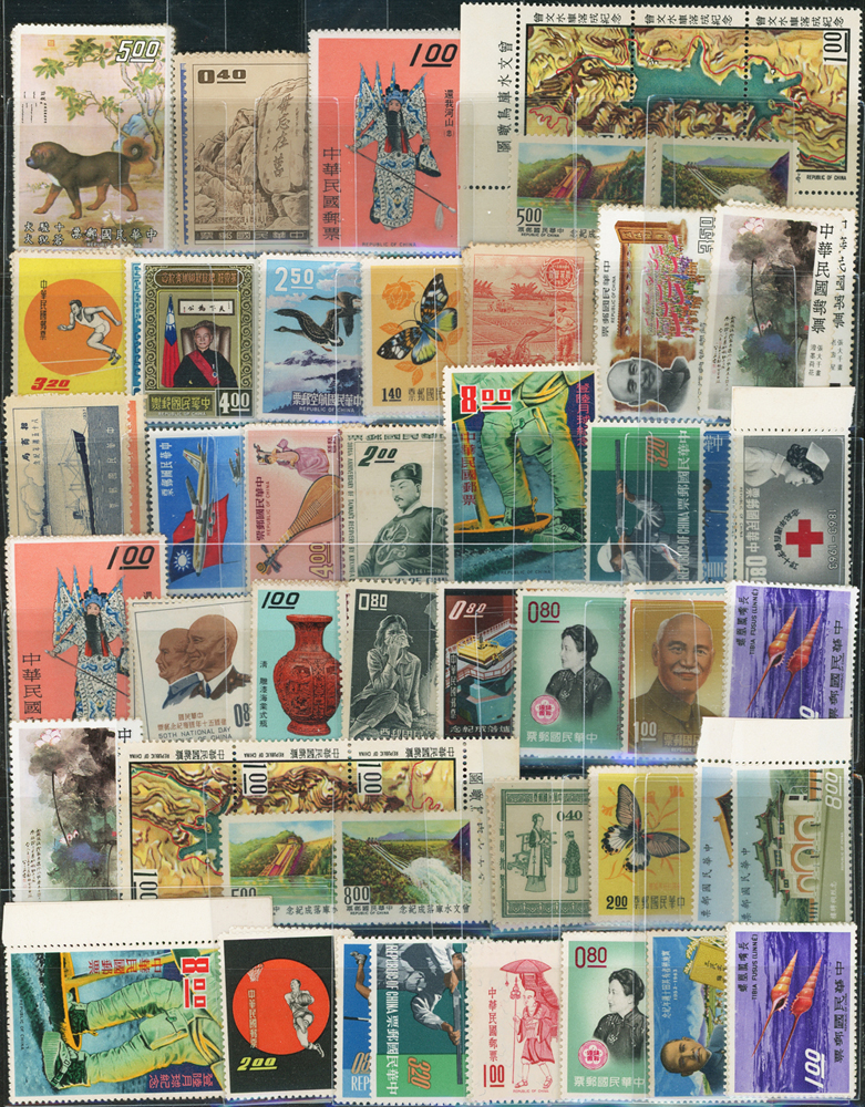 台灣中早期新票140套,重點內容有:體育(49.51年版).航空(58年版).招商局八十五週年.大陸難胞奔向自由.十駿犬.第四任總統就職週年.台灣昆蟲.原子爐落成紀念.實施耕者有其田十週年.農業普查.蔣總統玉照(55年版).玄奘、朱熹.忠烈祠.紈扇(65年版).母教.張大千畫.台灣貝殼.曾文水庫.中國戲劇.中華婦女反共抗俄聯合會十週年紀念.古物(59年版).中華民國建國五十年國慶.登陸月球.紅十字會百週年.民用航空40週年.鄭成功復臺三百週年紀念.蔣公勳業.音樂(58年版).保衛金馬.一輪狗.豬.一版中山樓等等,品種豐富品像混合,或有重複,多數背黃或淡黃,F-VF,歡迎至官網瀏覽全貌