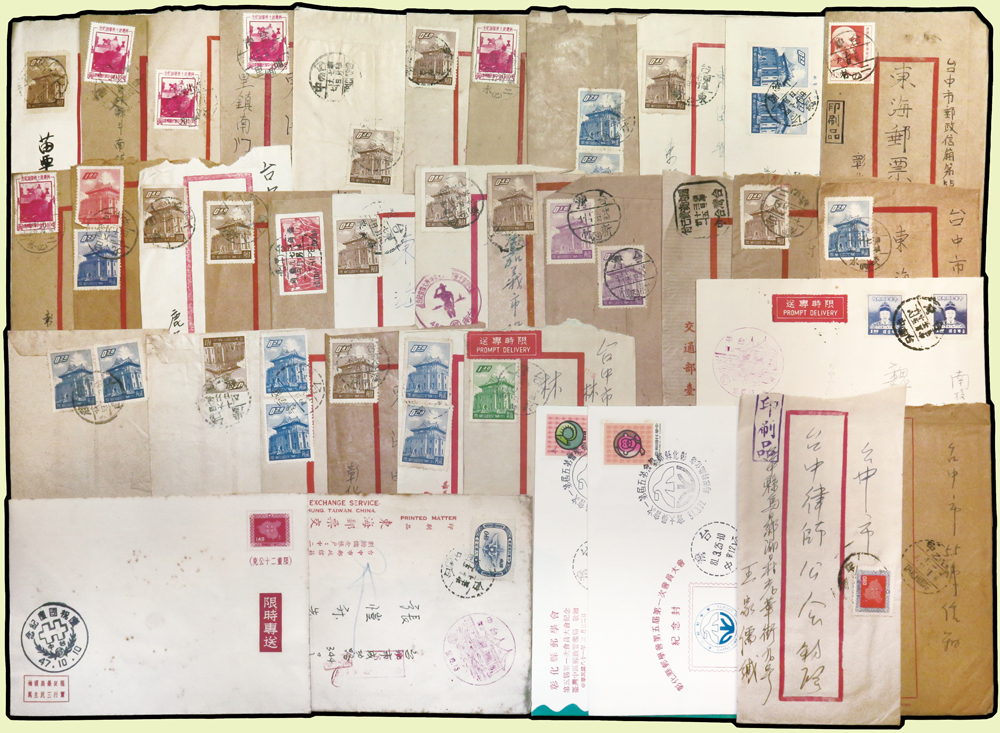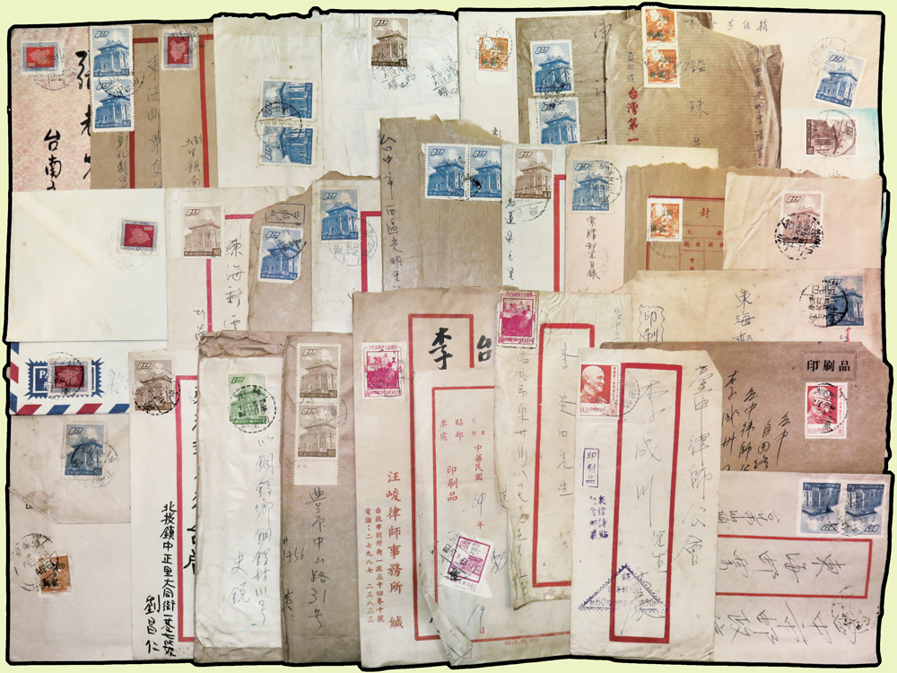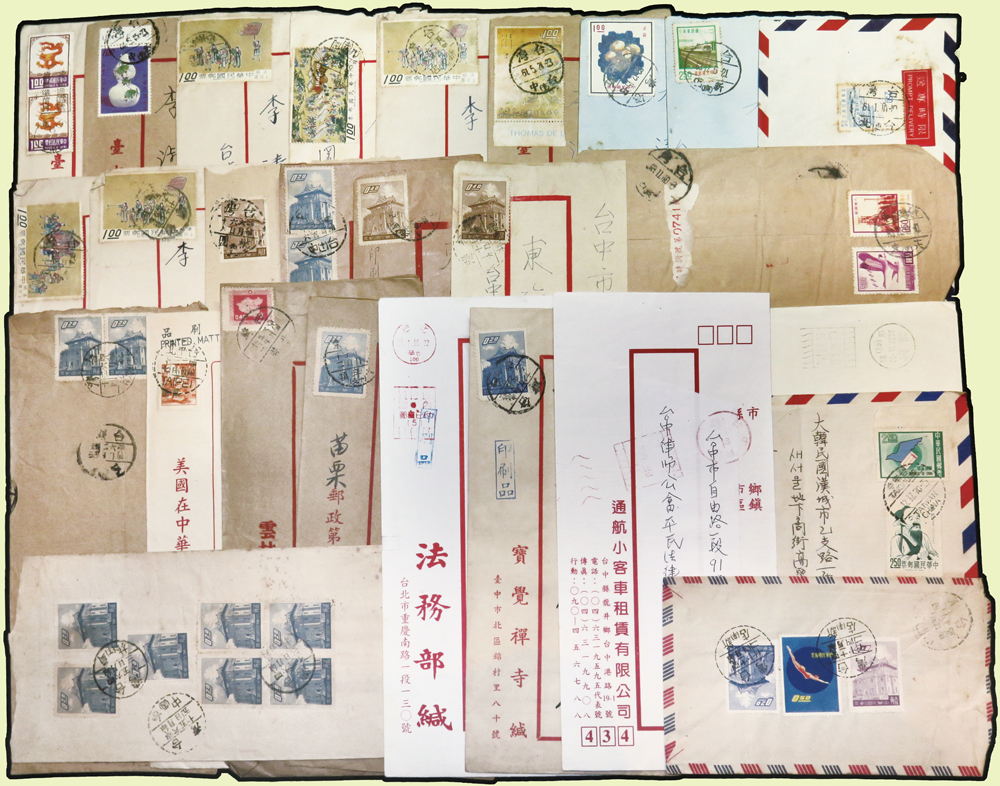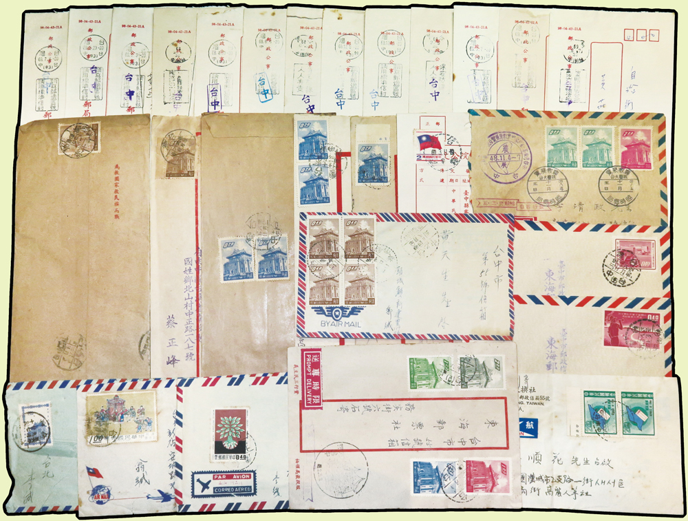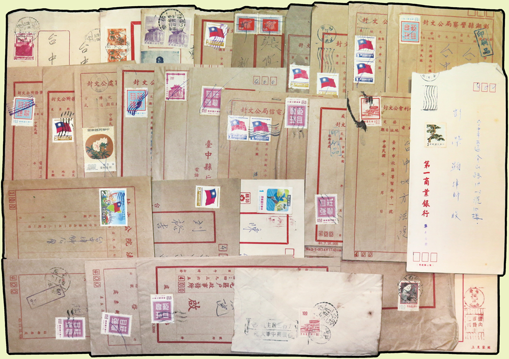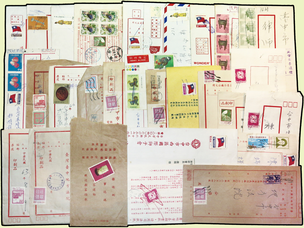 1956~1997年國內實寄封376封,實寄郵資片8片,掛號回執15件,含:平信.限時專送.印刷品.掛號.郵政公事等,其中平信及印刷品漏銷戳,郵差用筆畫銷或蓋波浪戳有62封,大部分貼常用票,部分封有破損,總重約1.6公斤;歡迎至官網瀏覽全貌(Page 54)