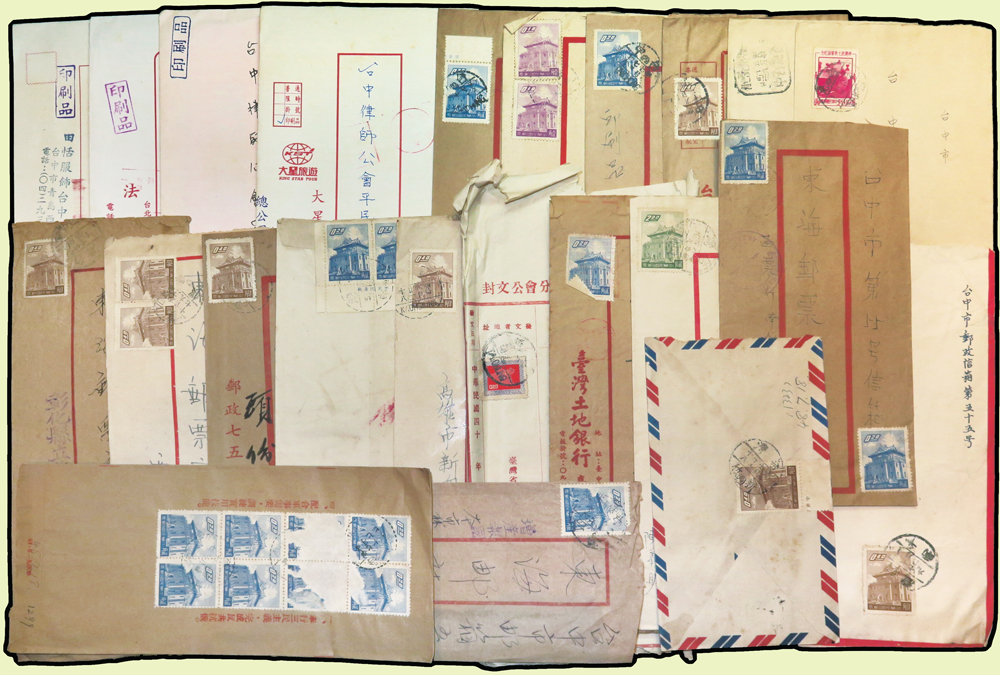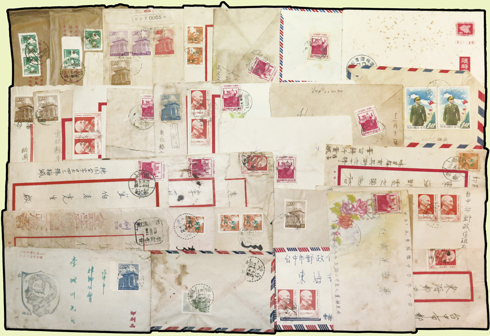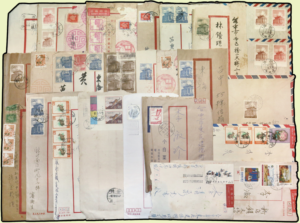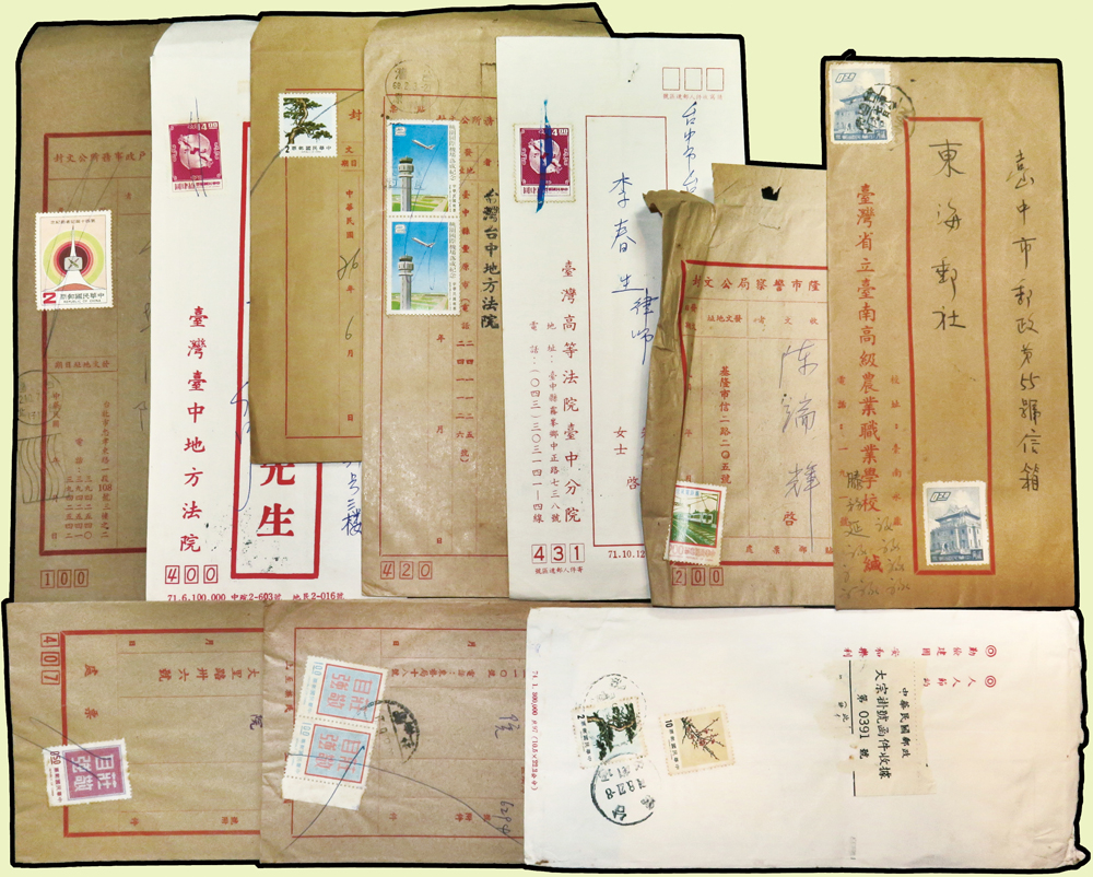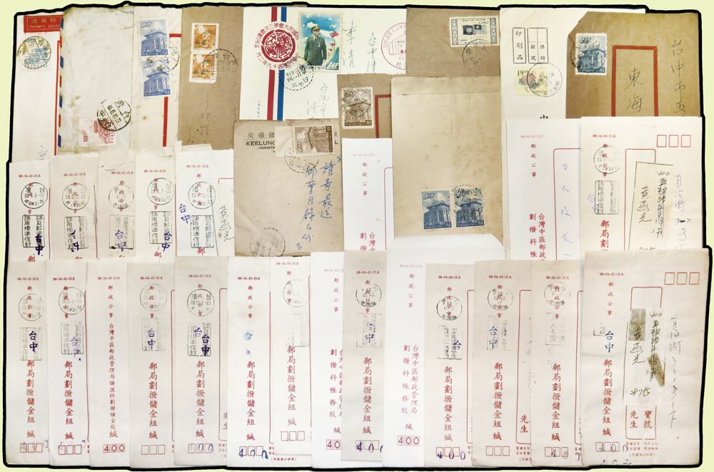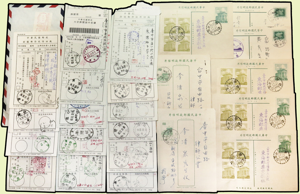 1956~1997年國內實寄封376封,實寄郵資片8片,掛號回執15件,含:平信.限時專送.印刷品.掛號.郵政公事等,其中平信及印刷品漏銷戳,郵差用筆畫銷或蓋波浪戳有62封,大部分貼常用票,部分封有破損,總重約1.6公斤;歡迎至官網瀏覽全貌(Page 54)